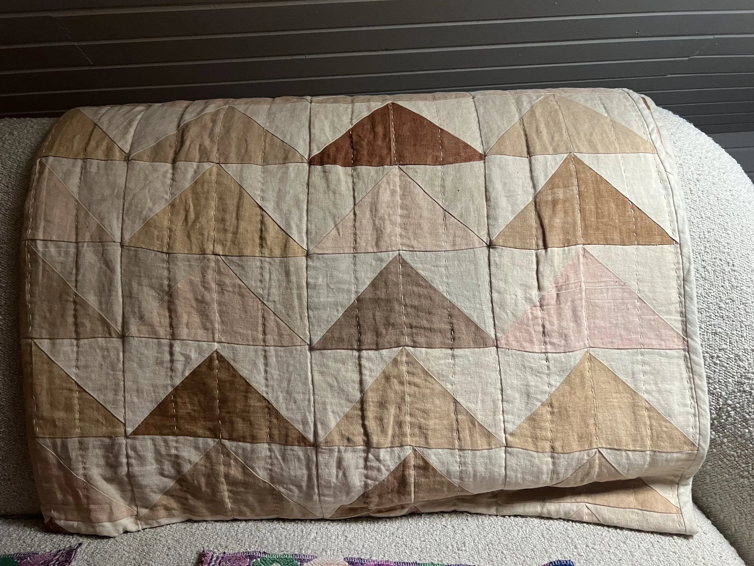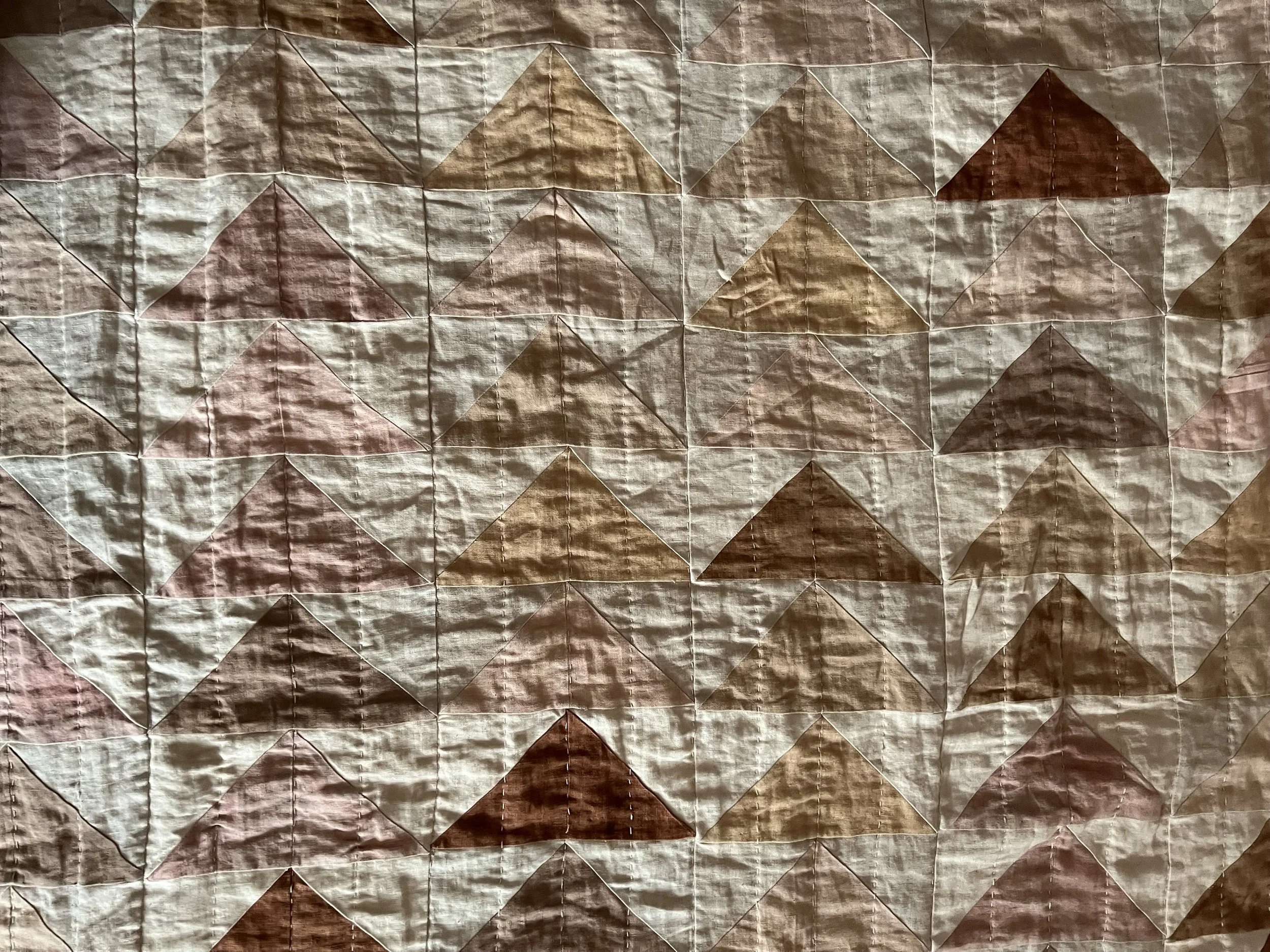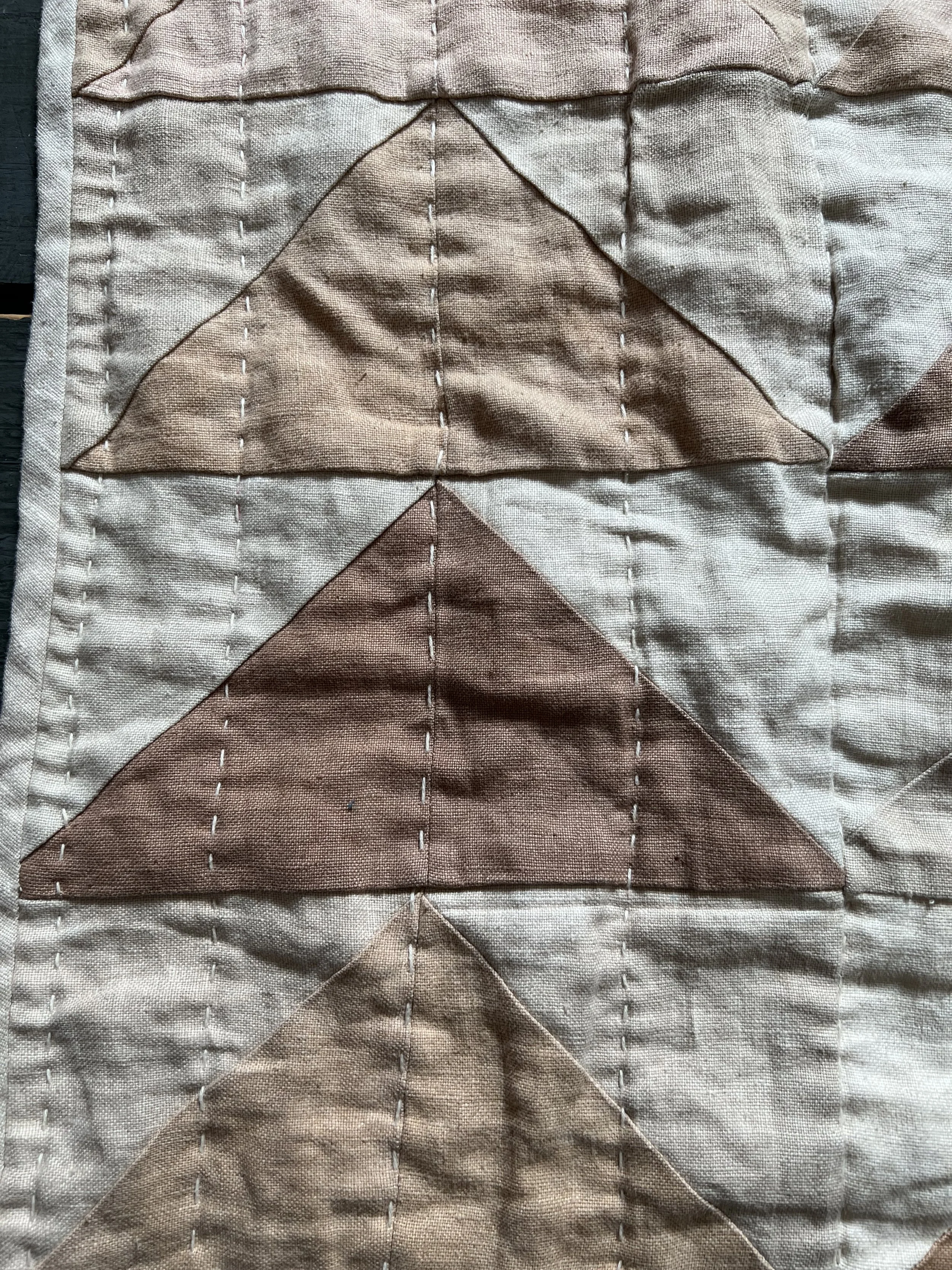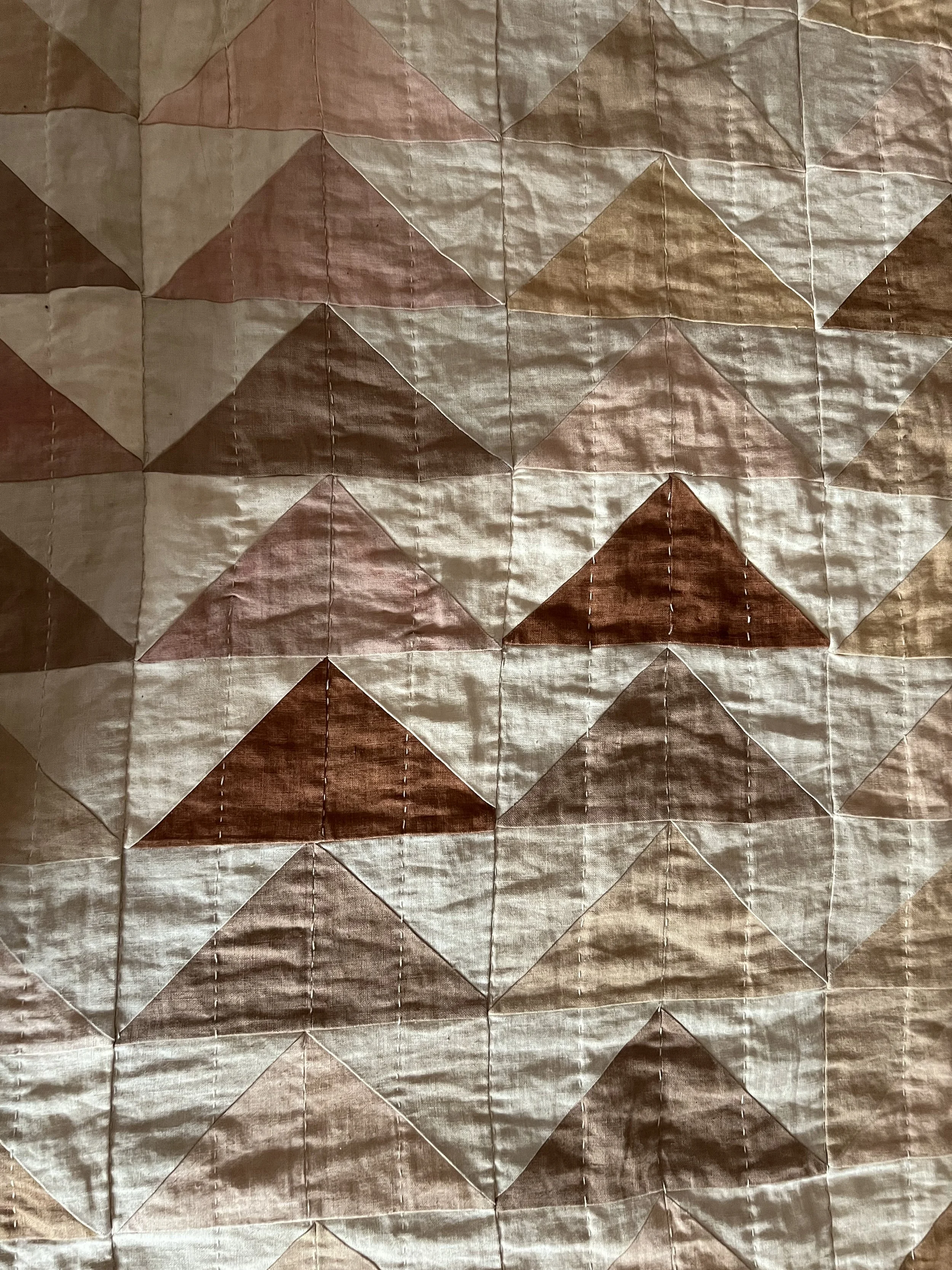 This large scale flying geese quilt is composed of 100% linen hand dyed with natural dyes and hand stitched. I made so many of these flying geese, but when I started composing the quilt, I decided to keep the colors within this flesh tones color scheme. This meant that I had many extra pieces left over that later turned into the pinwheel shower curtain quilt.