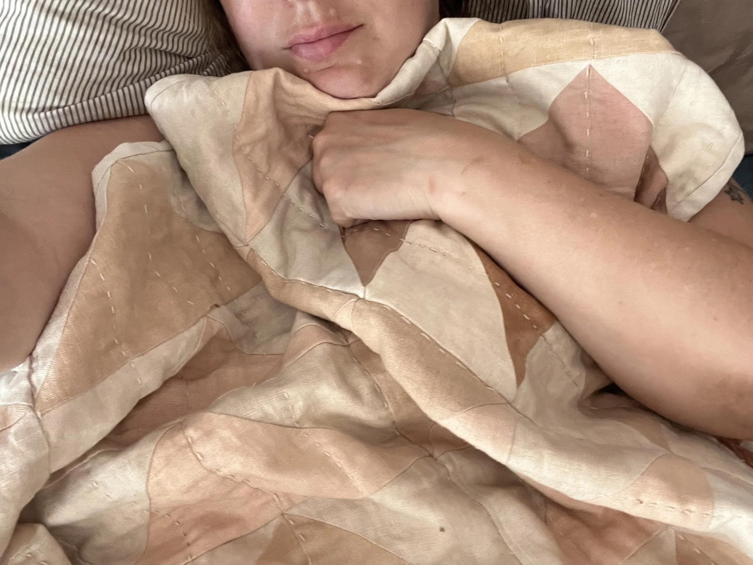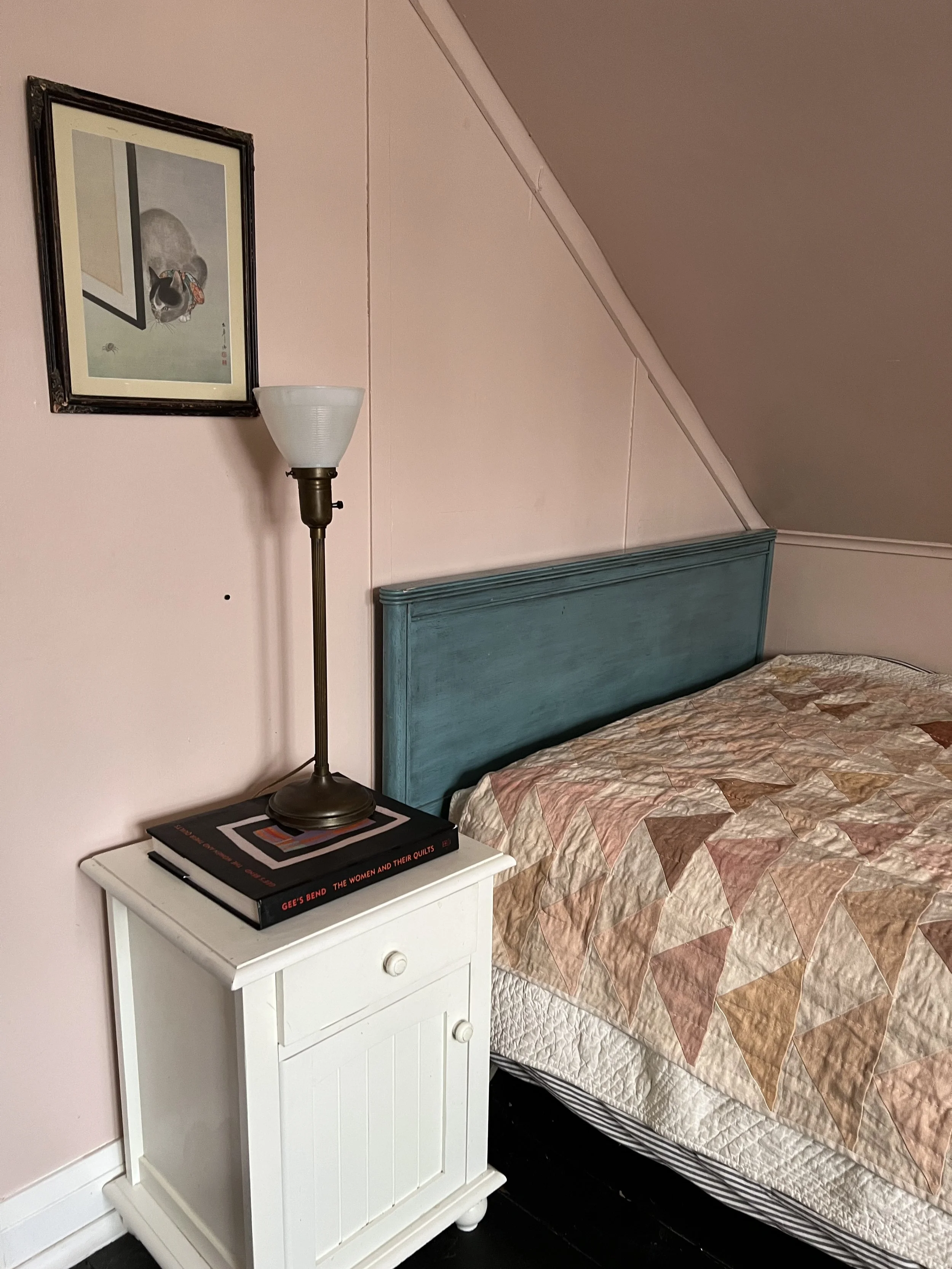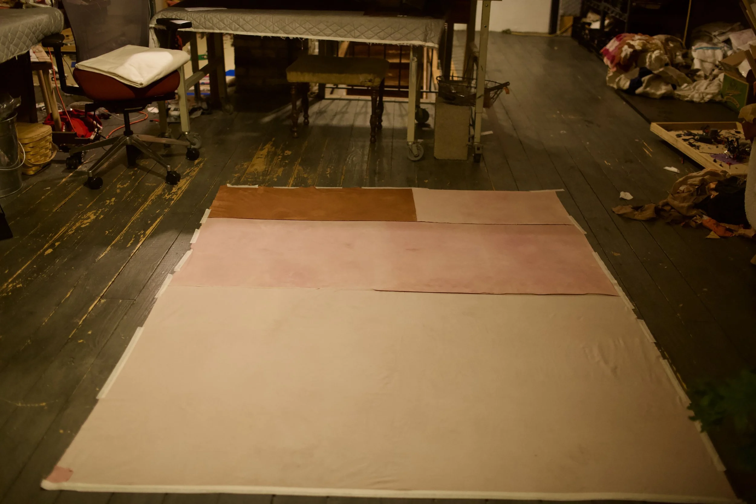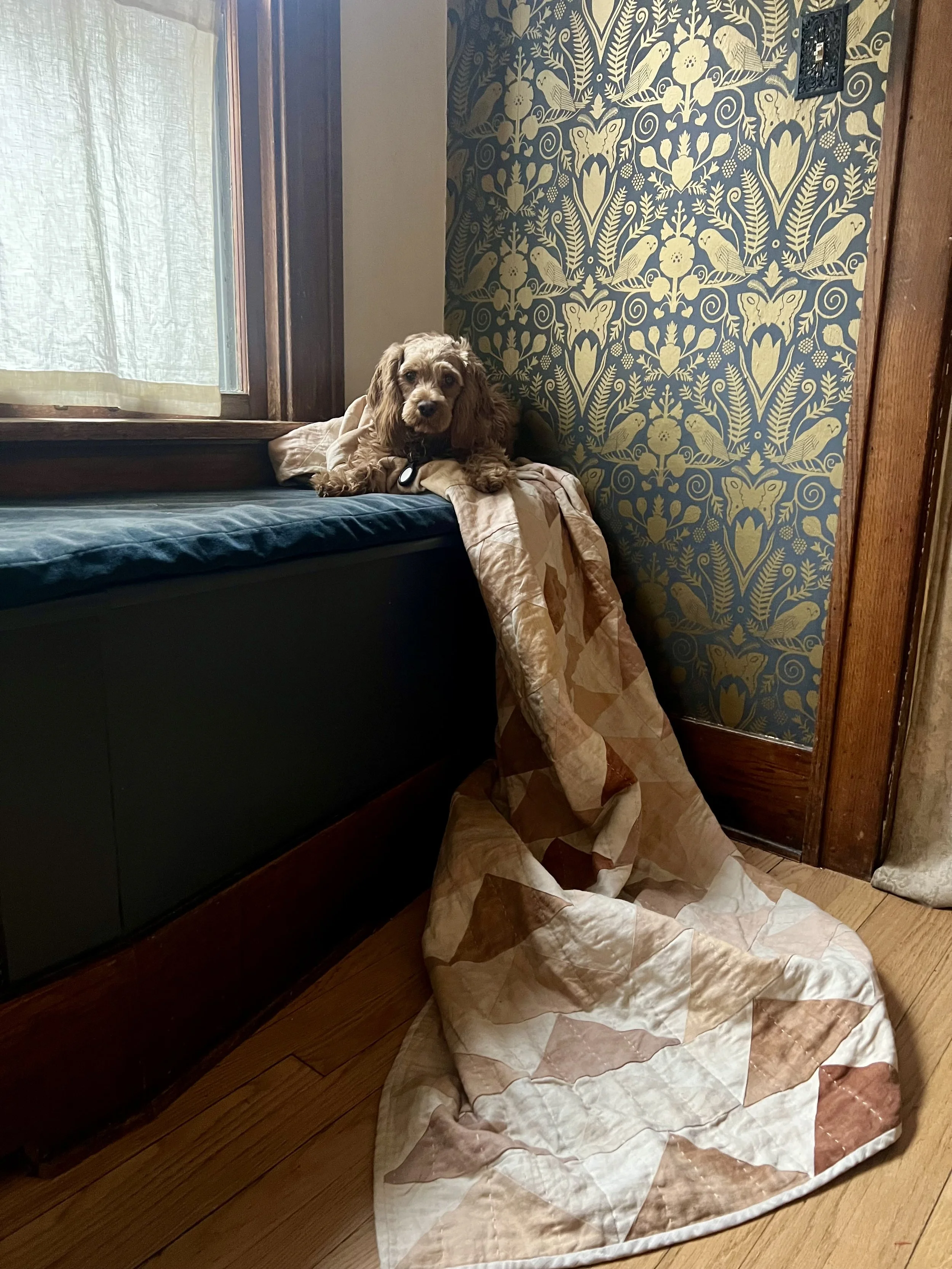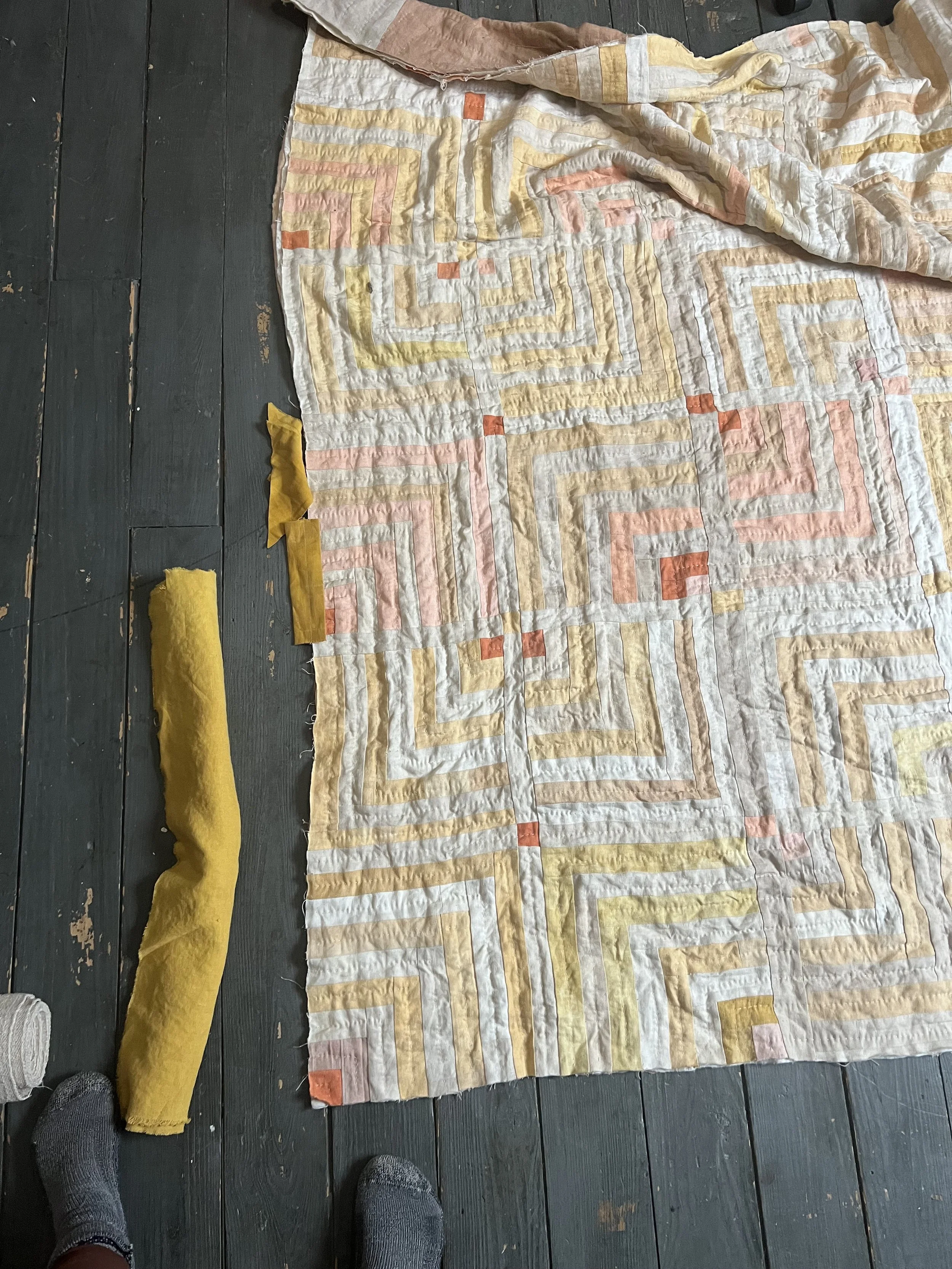 This large scale flying geese quilt is composed of 100% linen hand dyed with natural dyes and hand stitched. I made so many of these flying geese, but when I started composing the quilt, I decided to keep the colors within this flesh tones color scheme. This meant that I had many extra pieces left over that later turned into the pinwheel shower curtain quilt.