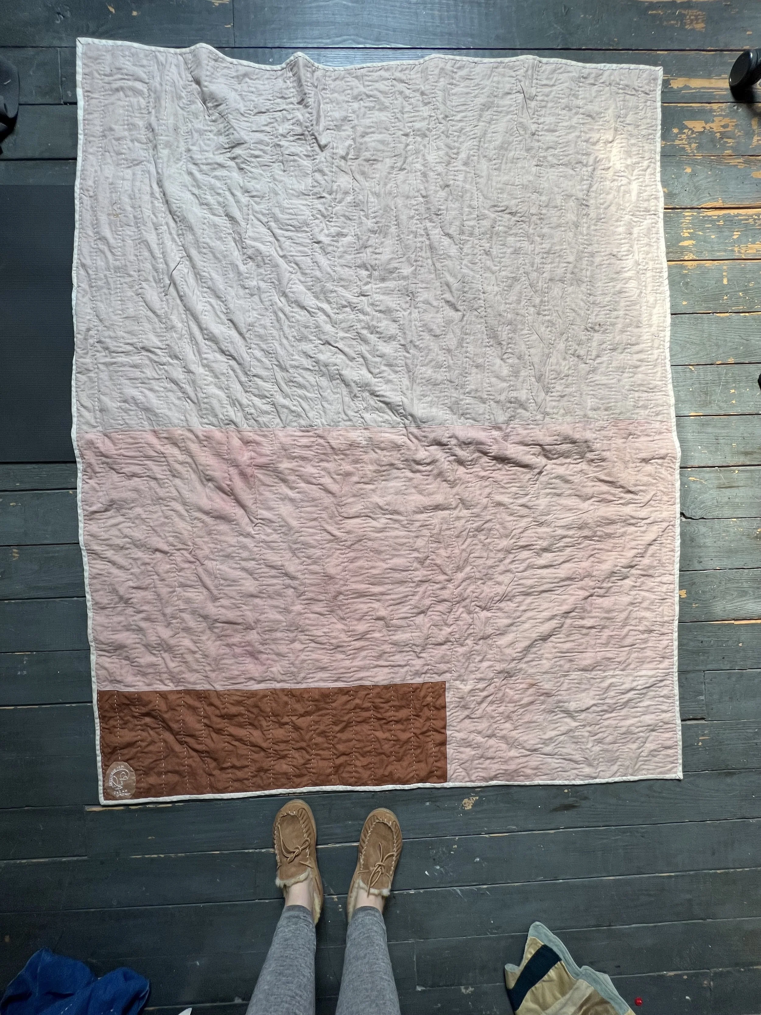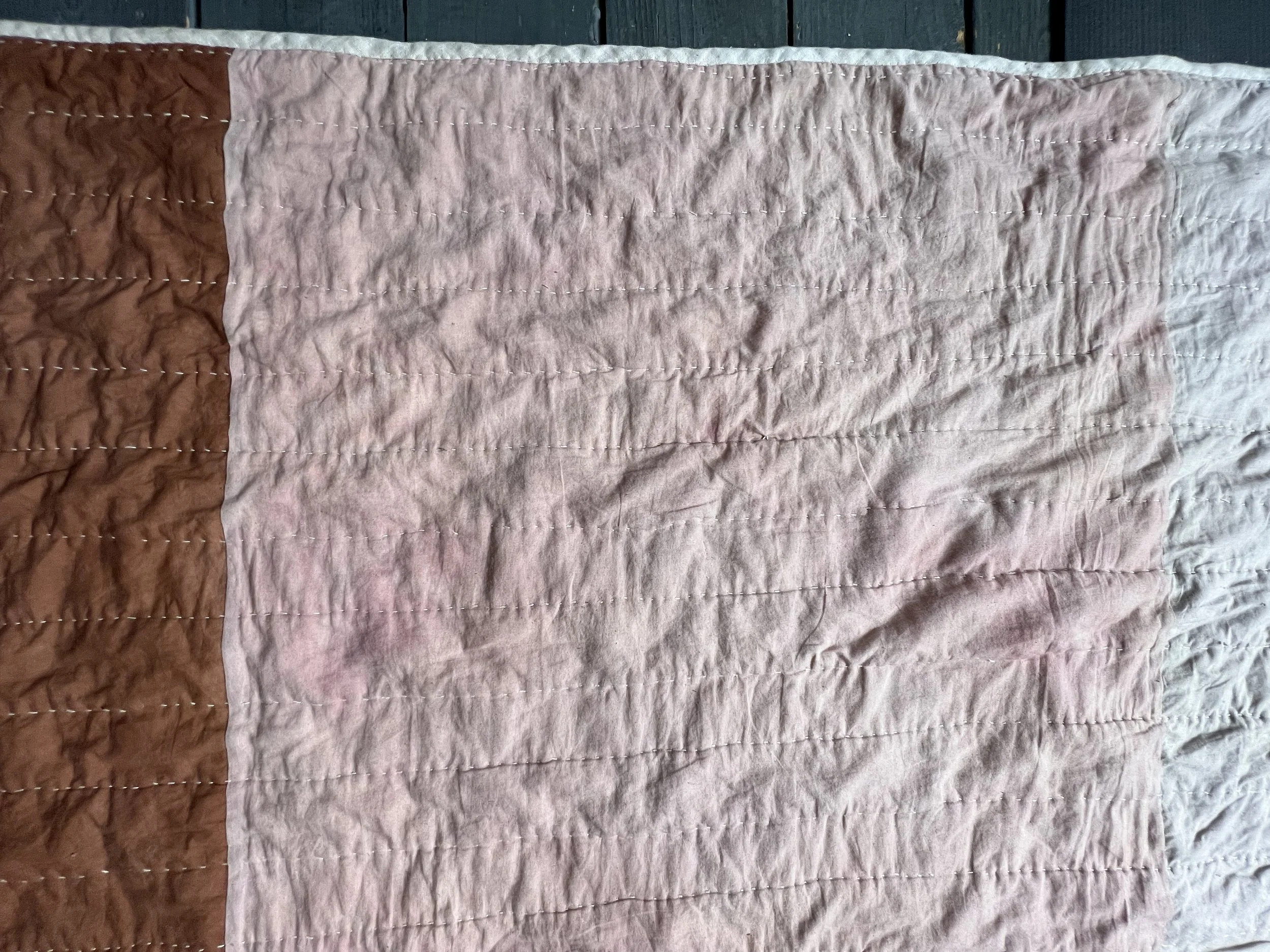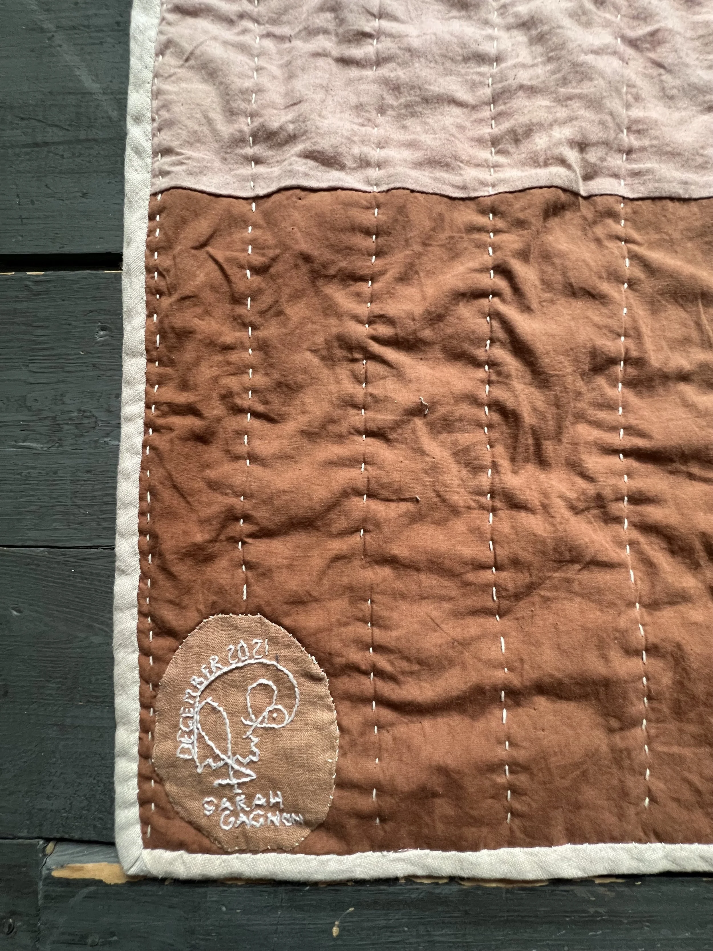 Linen, naturally dyed with Madder, Tesu, Osage Orange, Black Tea, Acorns, Himalayan Rhubarb, Cutch, Sandlewood, Wattleand Pomegranate. The binding and back are also linen. Hand quilted with thick ivory sashiko thread. Cotton batting.