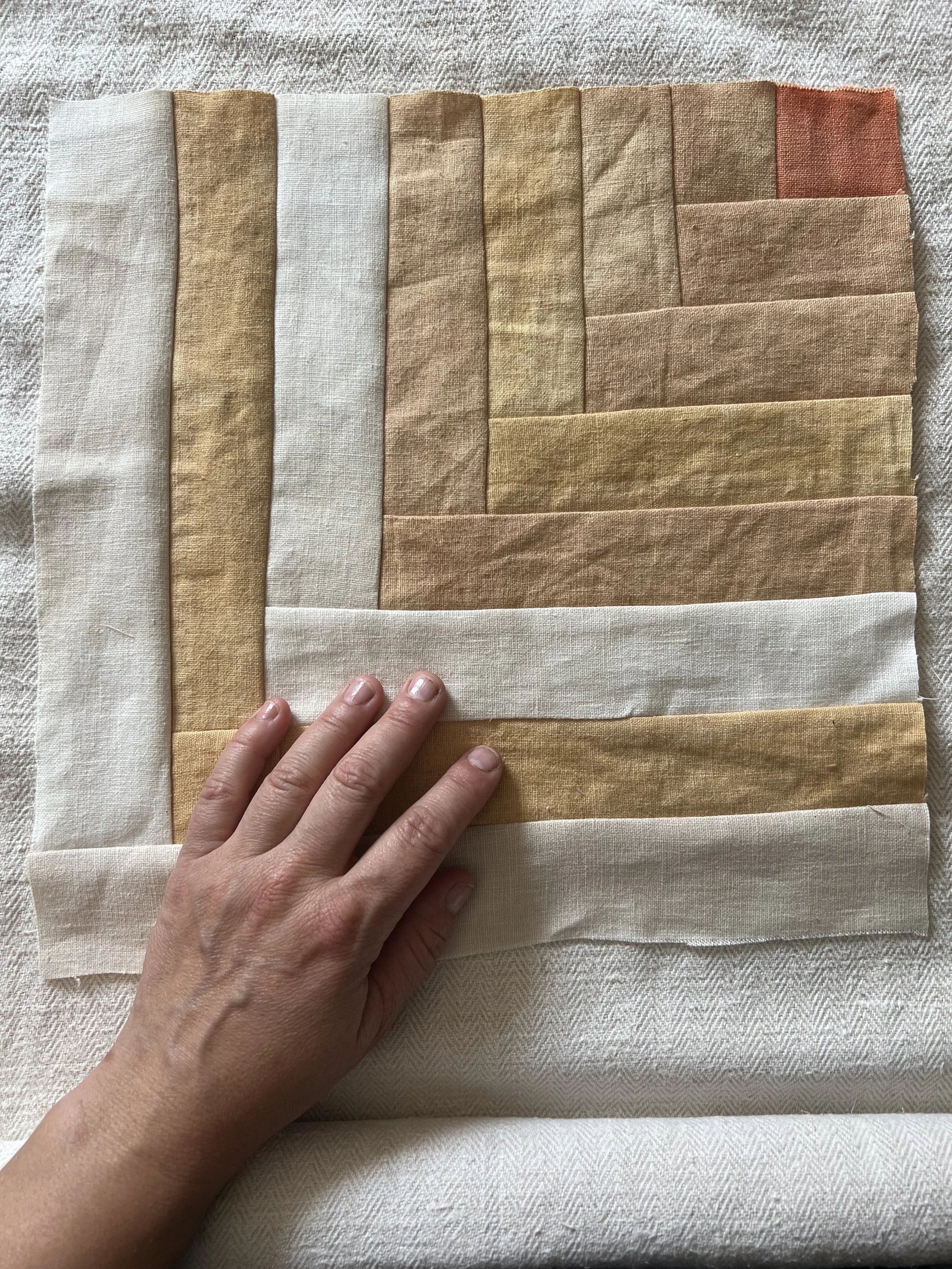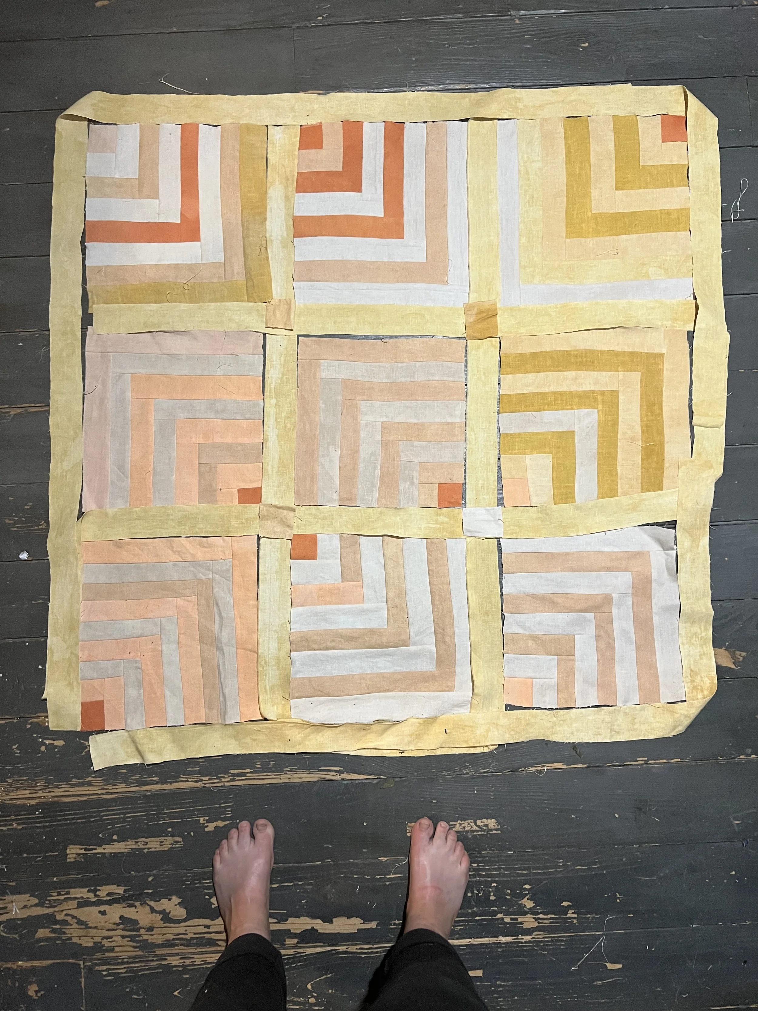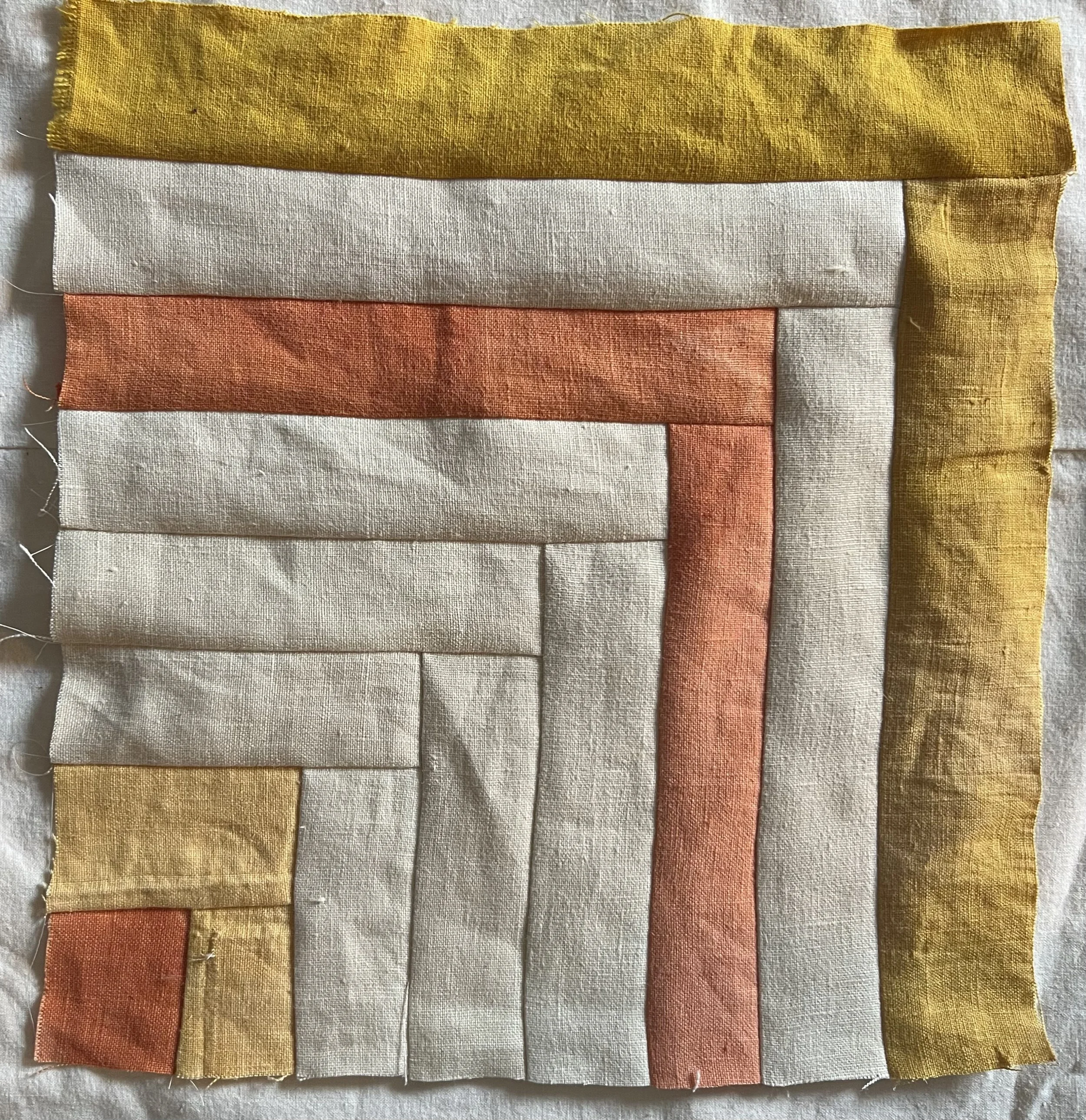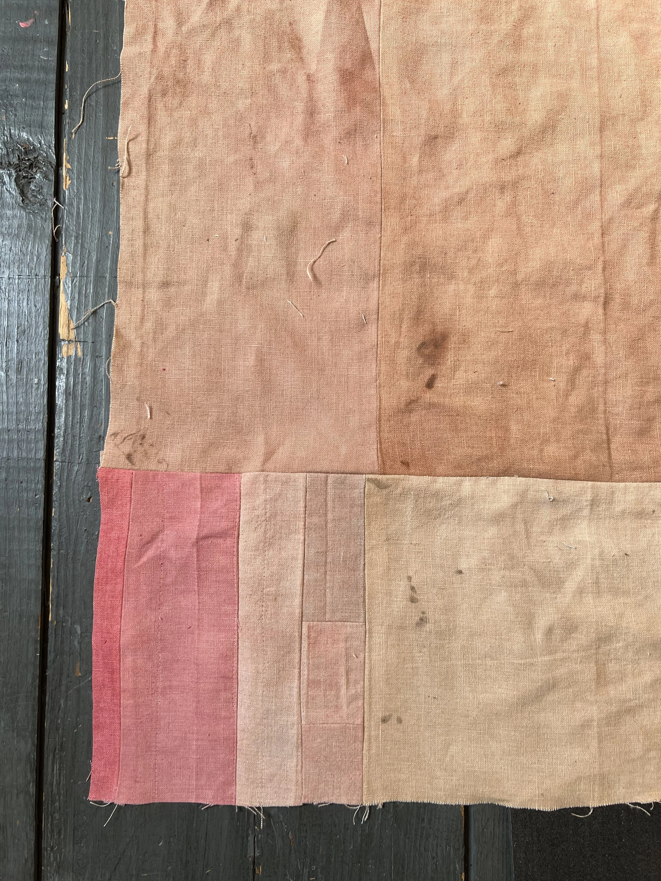 Linen, naturally dyed with Madder, Tesu, Osage Orange, Black Tea, Acorns, Himalayan Rhubarb, Cutch, Sandlewood, Wattle and Pomegranate. The binding and back are also linen. Hand quilted with thick ivory sashiko thread. Cotton batting.