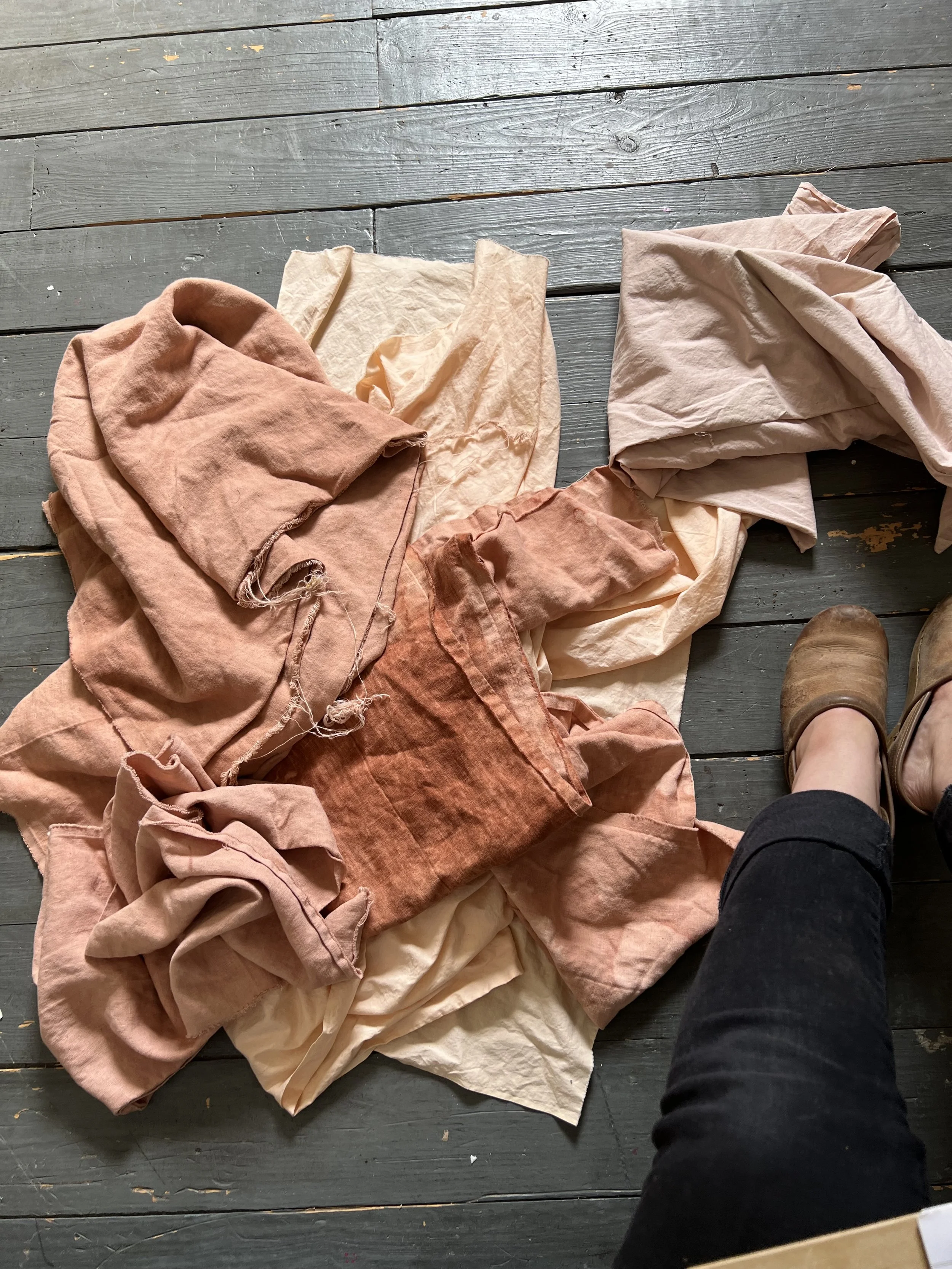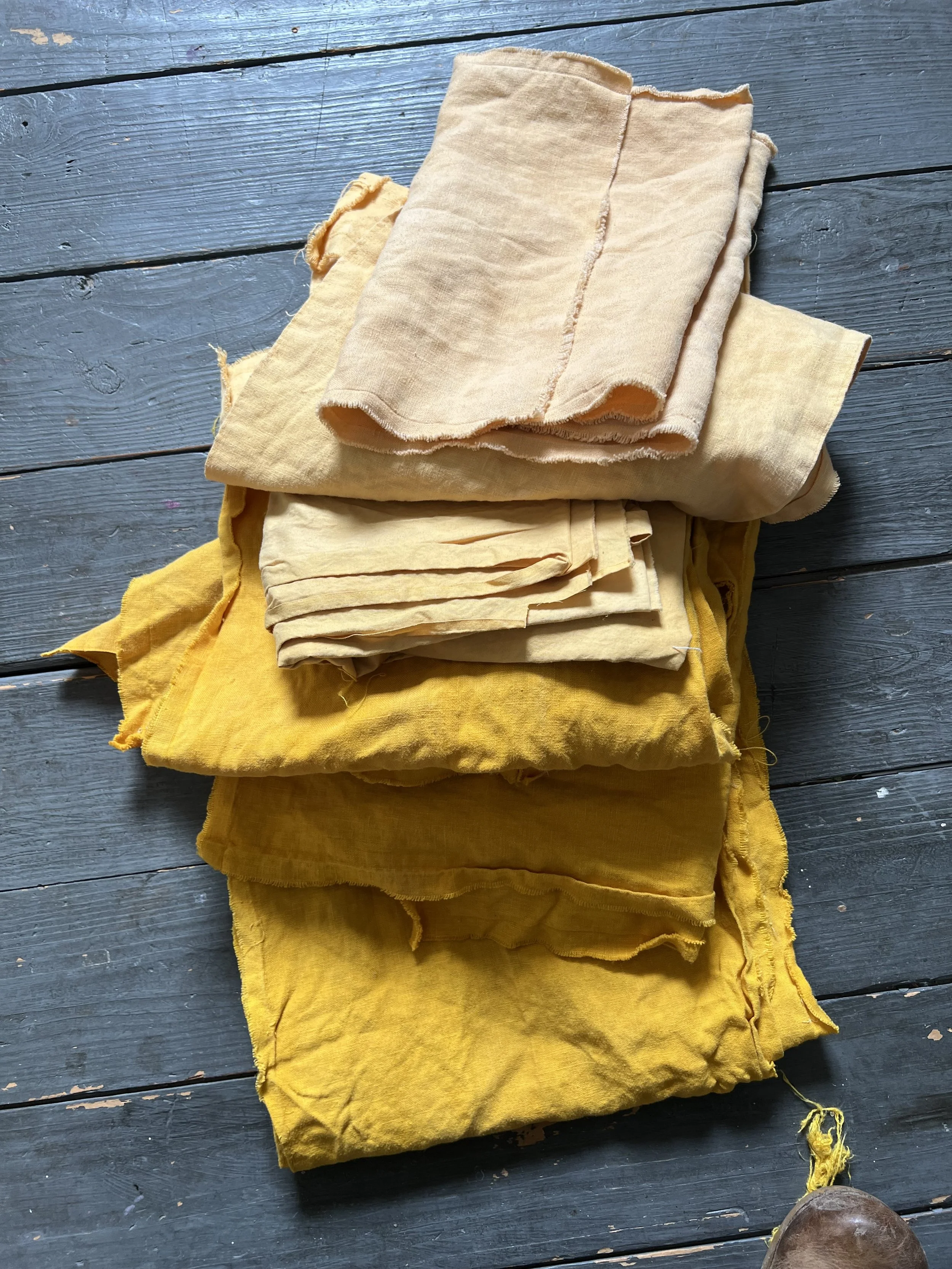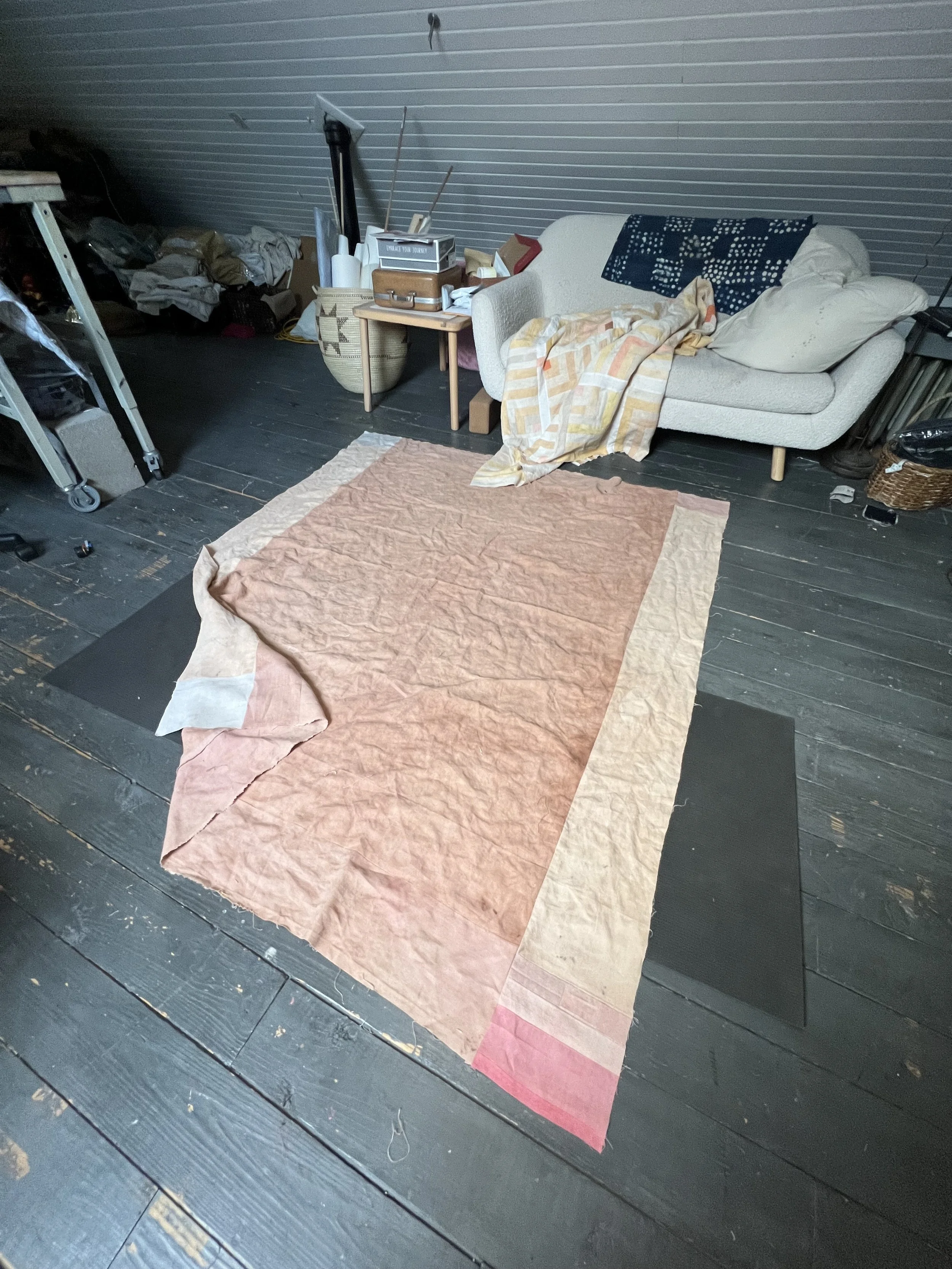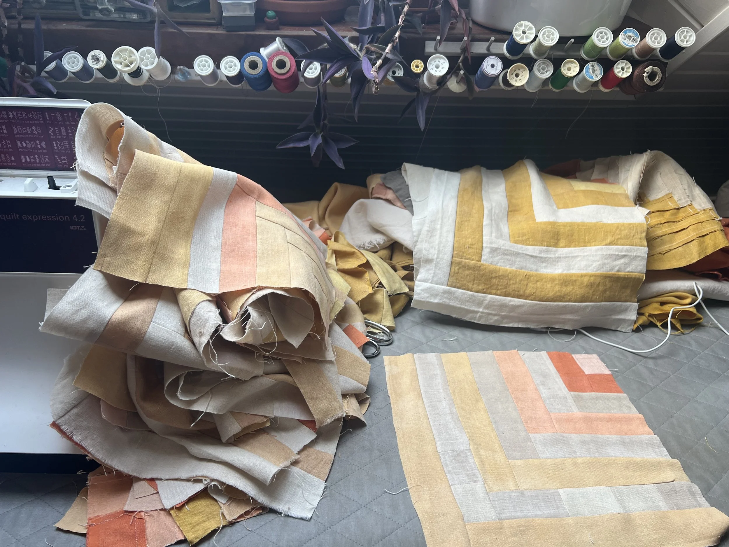 Linen, naturally dyed with Madder, Tesu, Osage Orange, Black Tea, Acorns, Himalayan Rhubarb, Cutch, Sandlewood, Wattle and Pomegranate. The binding and back are also linen. Hand quilted with thick ivory sashiko thread. Cotton batting.