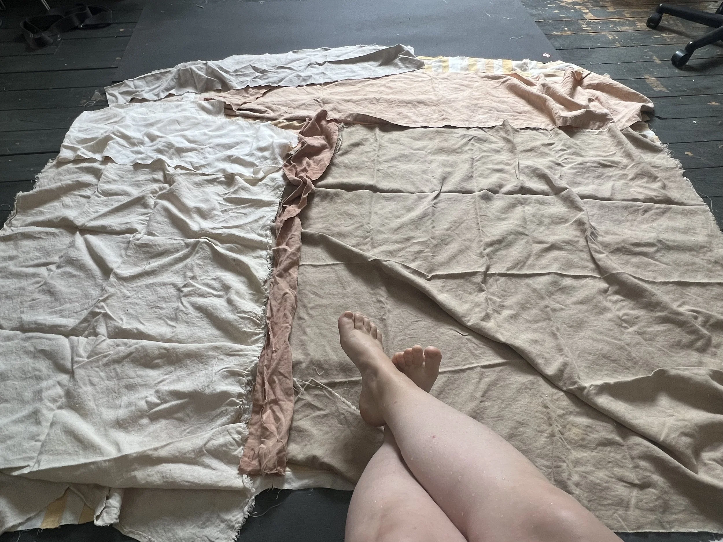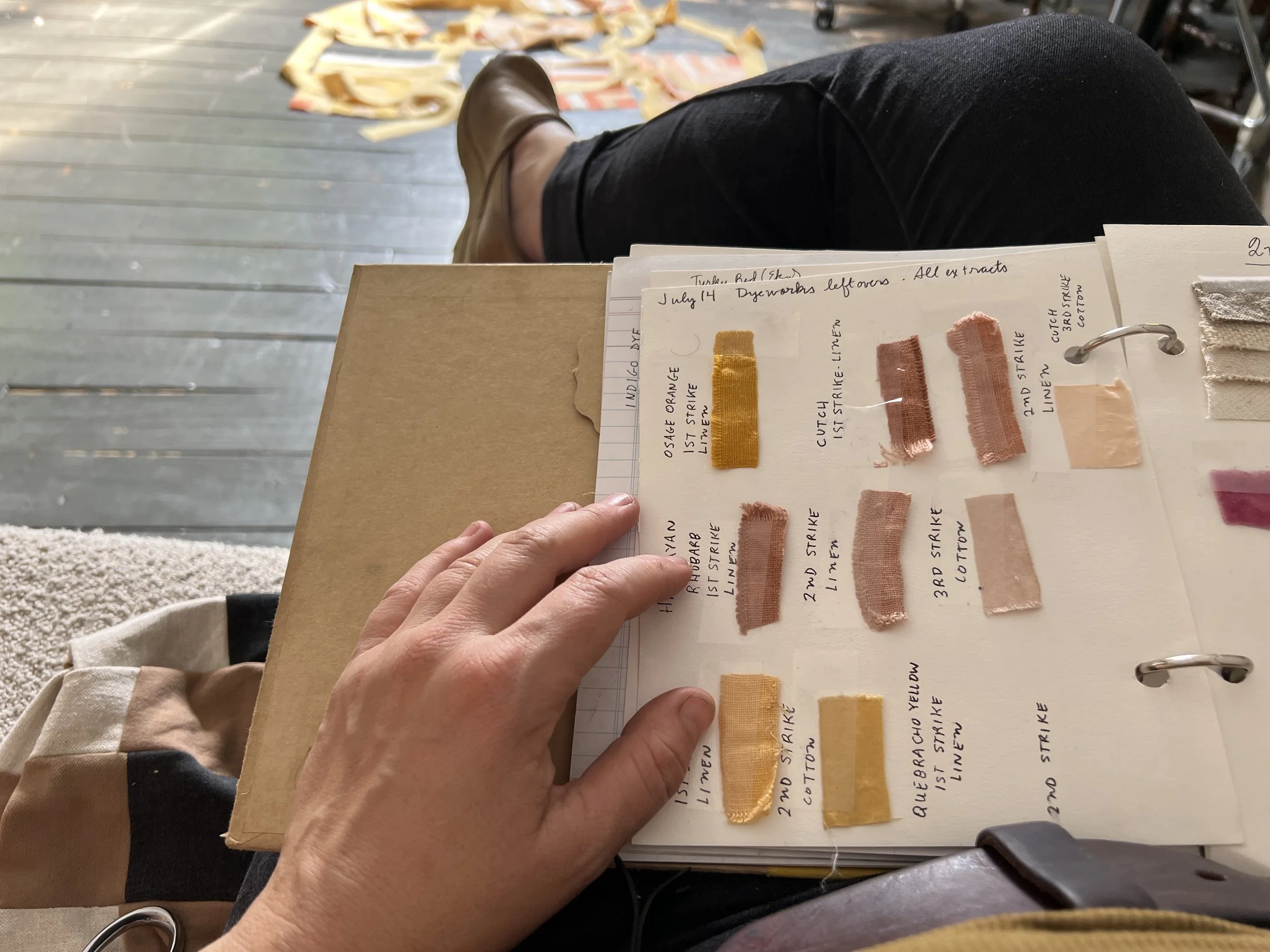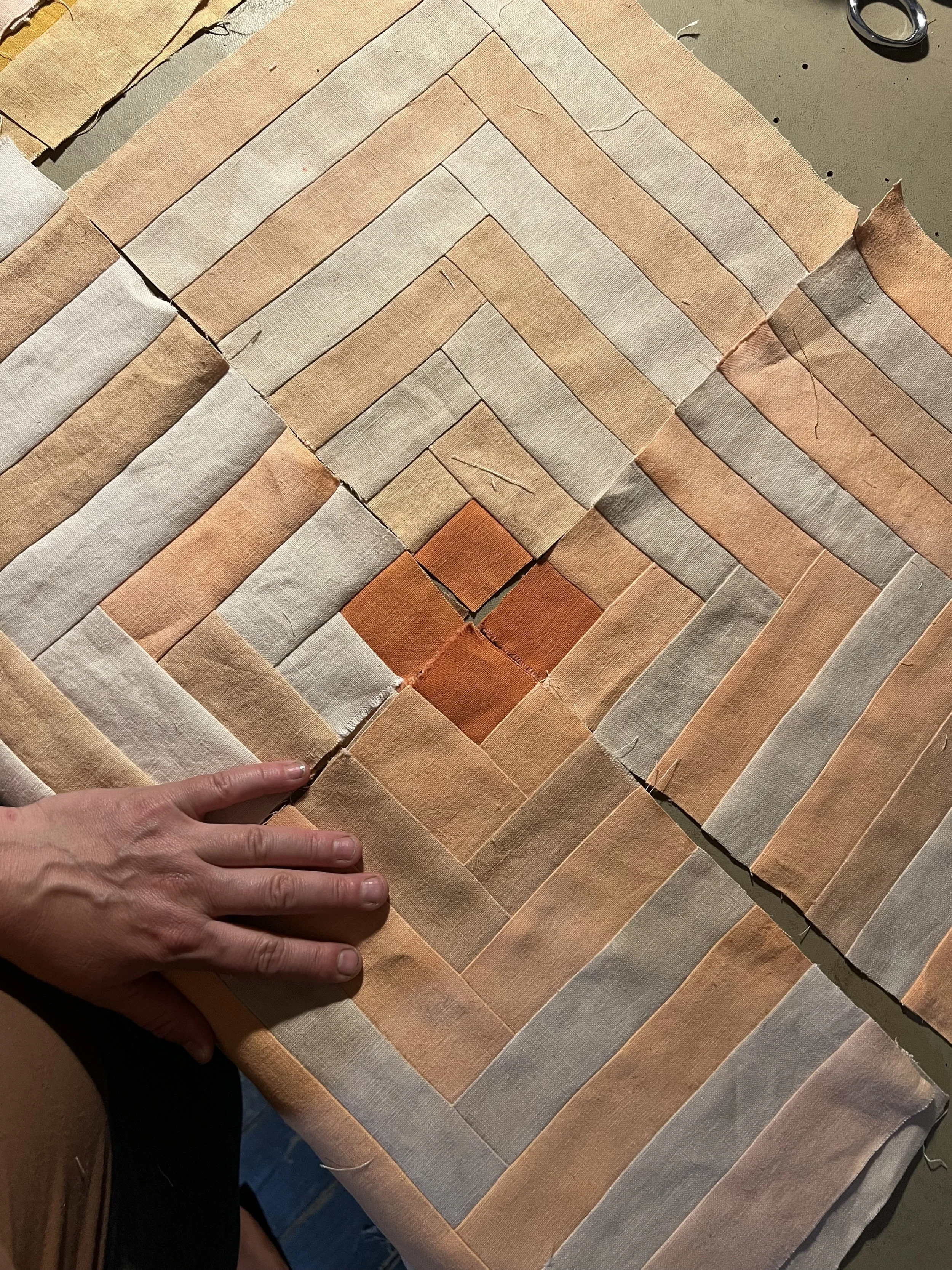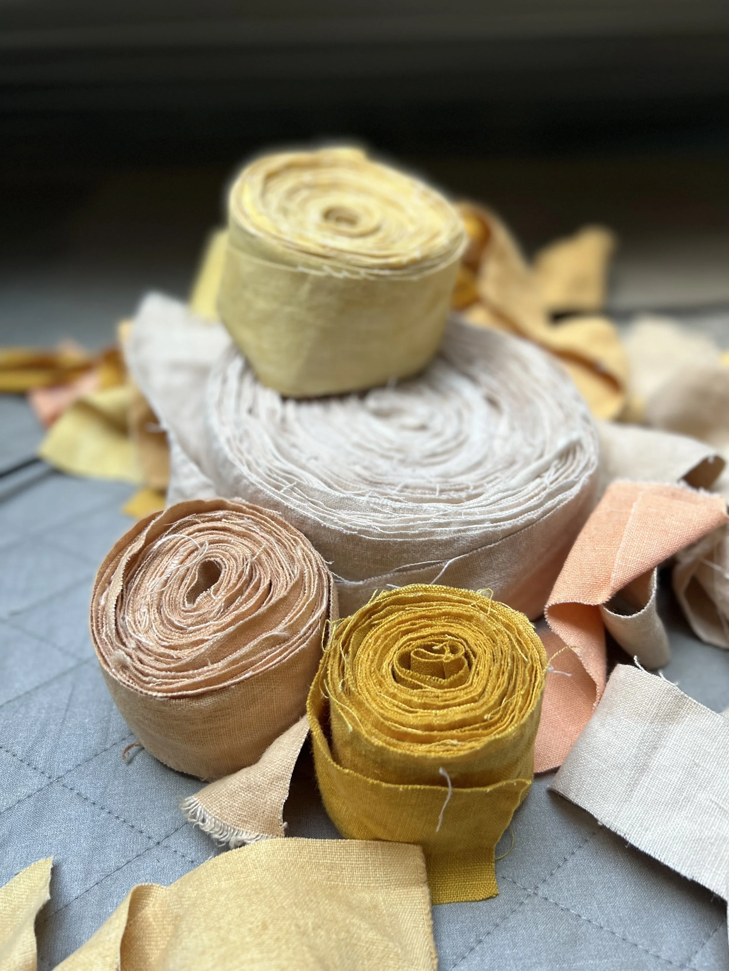 Linen, naturally dyed with Madder, Tesu, Osage Orange, Black Tea, Acorns, Himalayan Rhubarb, Cutch, Sandlewood, Wattle and Pomegranate. The binding and back are also linen. Hand quilted with thick ivory sashiko thread. Cotton batting.