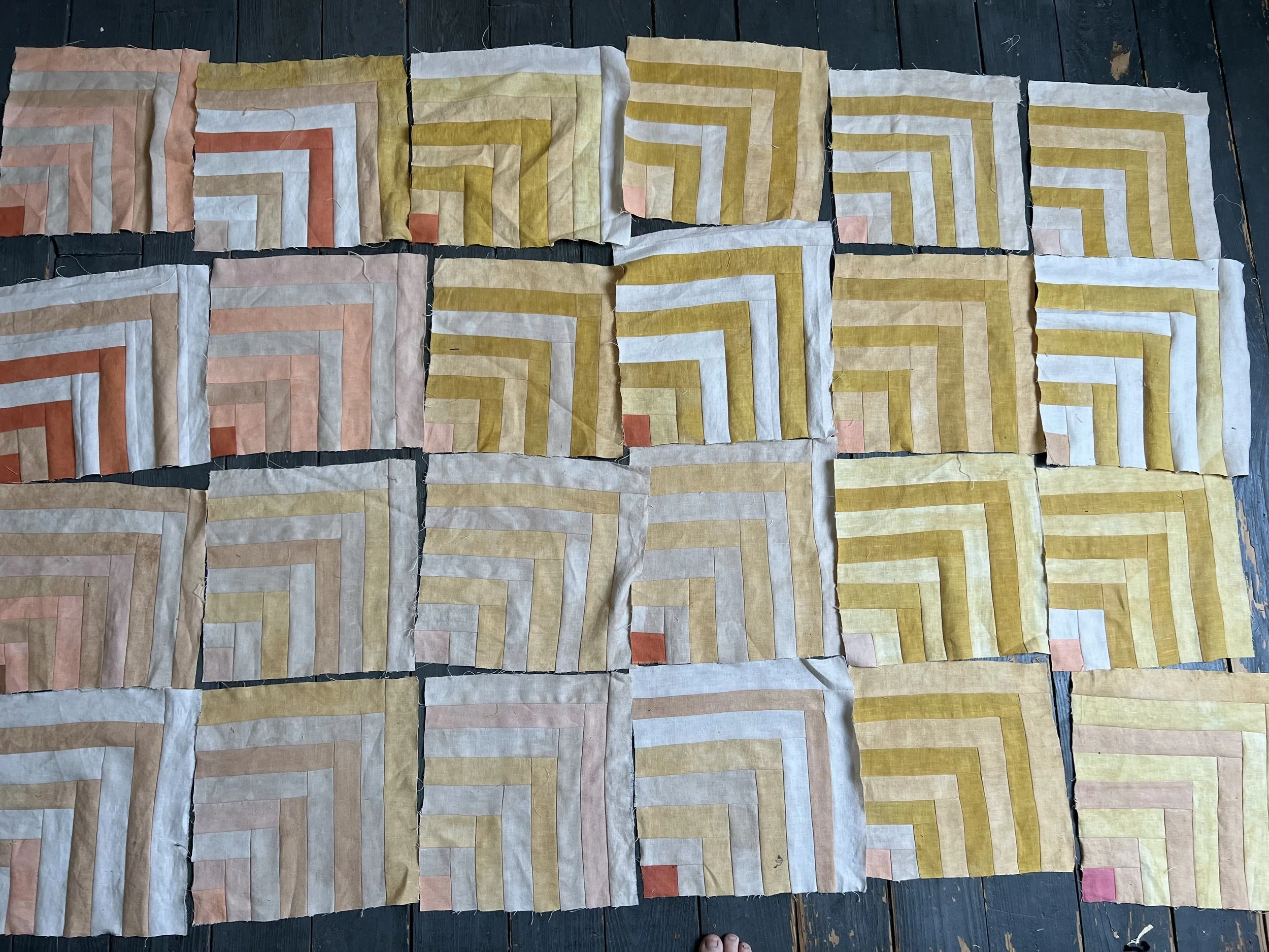 This half cabin quilt is composed of 30 blocks in a 5x6 layout. Each block is sashed with ivory linen, with colorful squares at each intersection.