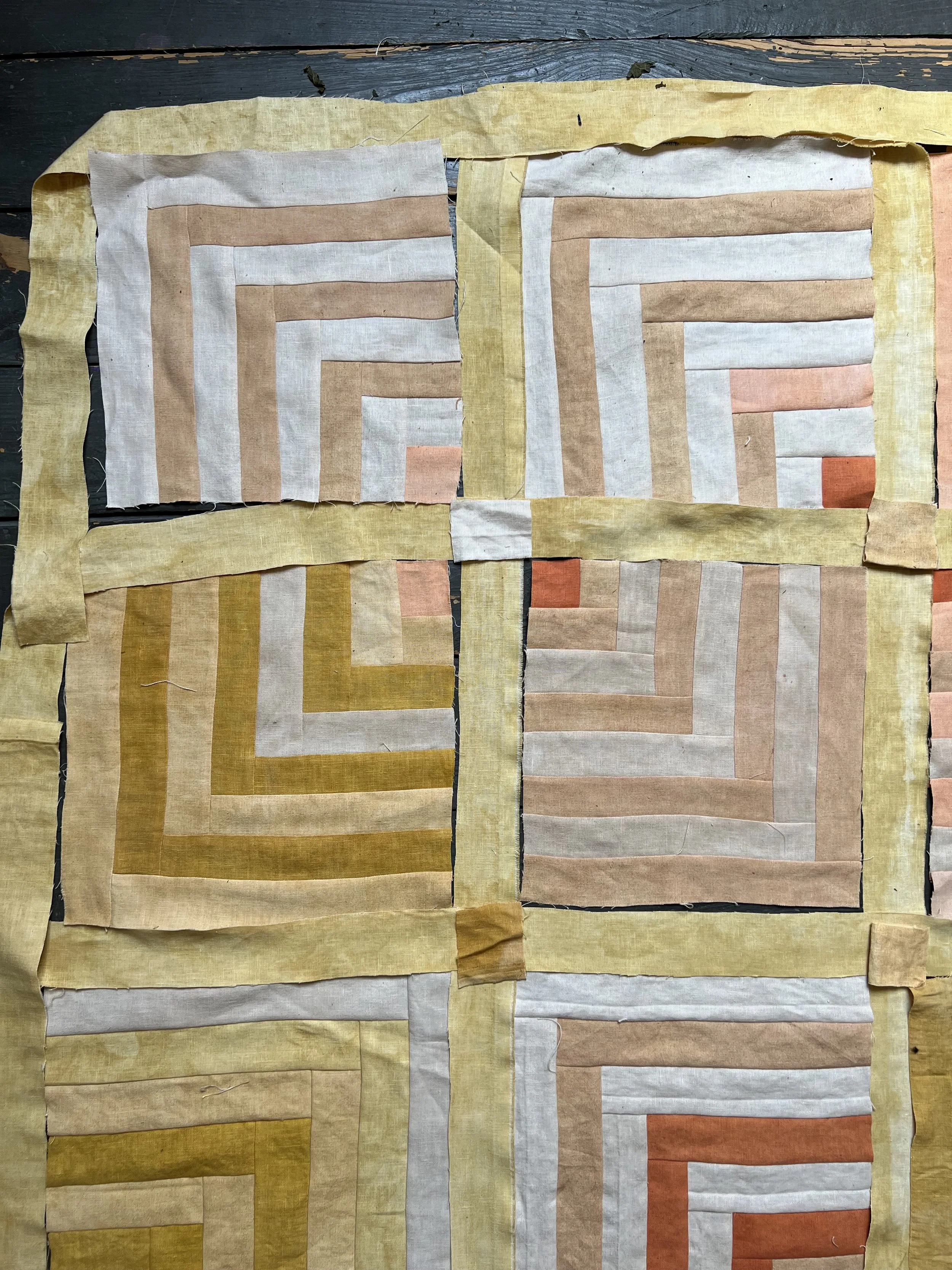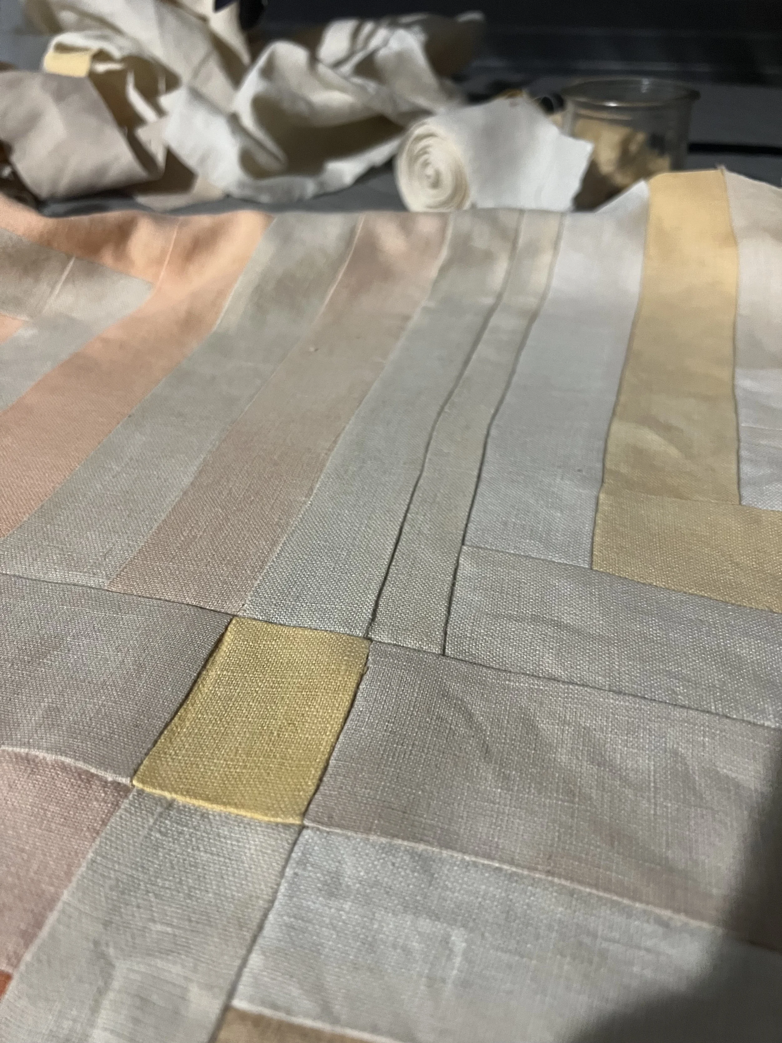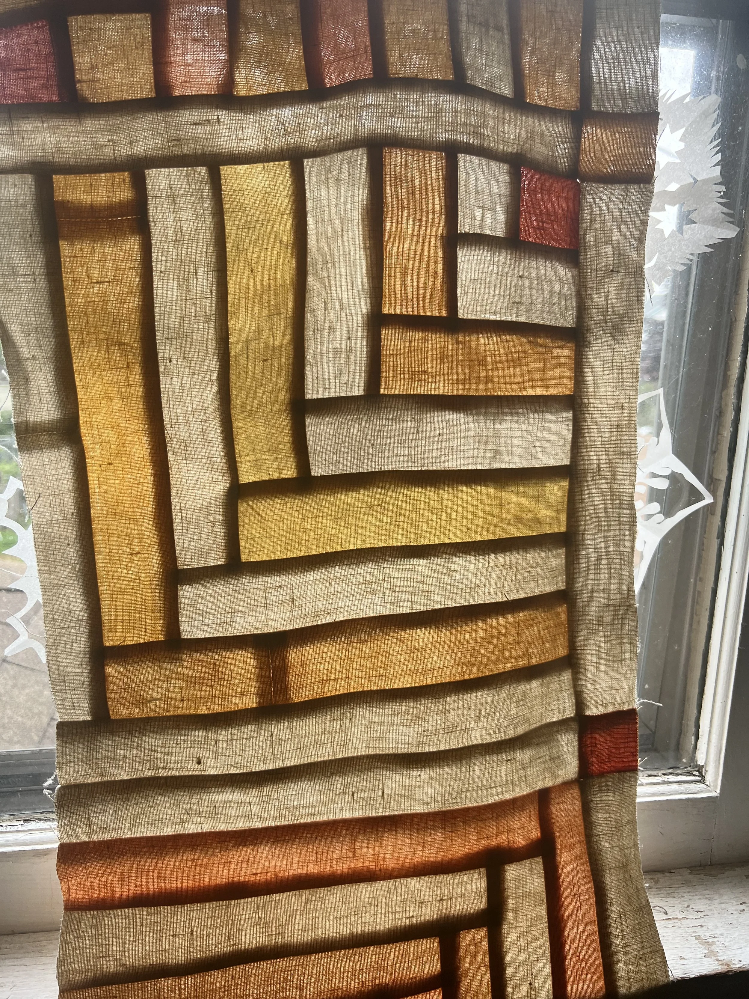 This quilt was pieced with a machine and hand quilted. The linen was hand dyed by the artist. This was hand quilted with thick Sashiko style thread following the pattern in the center of each strip. The strips were cut by eye so they are irregular. The strips were sewn together and then cut at the edge of each section. The binding is machine stitched on the front and hand tacked on the back to hide the stitches with mitered corners. The back is naturally dyed linen constructed out of fabric remnants.