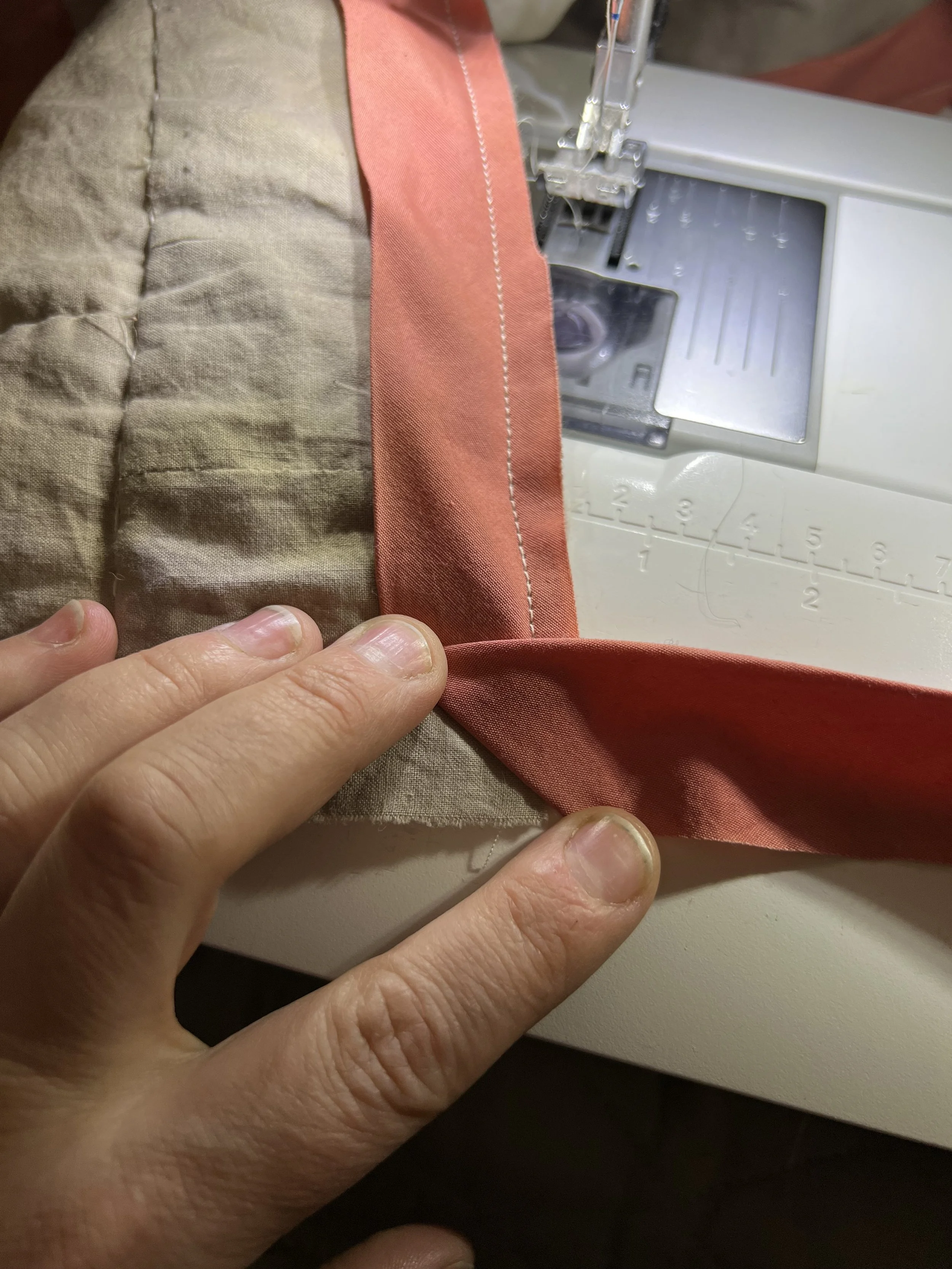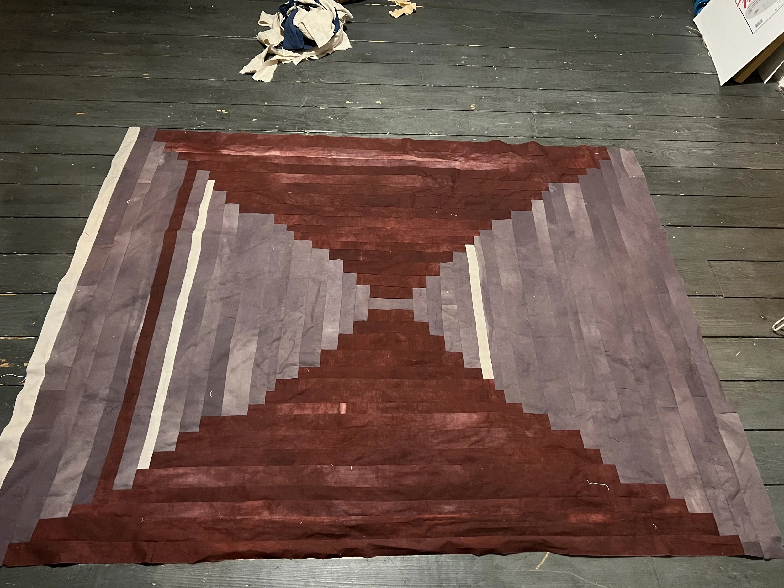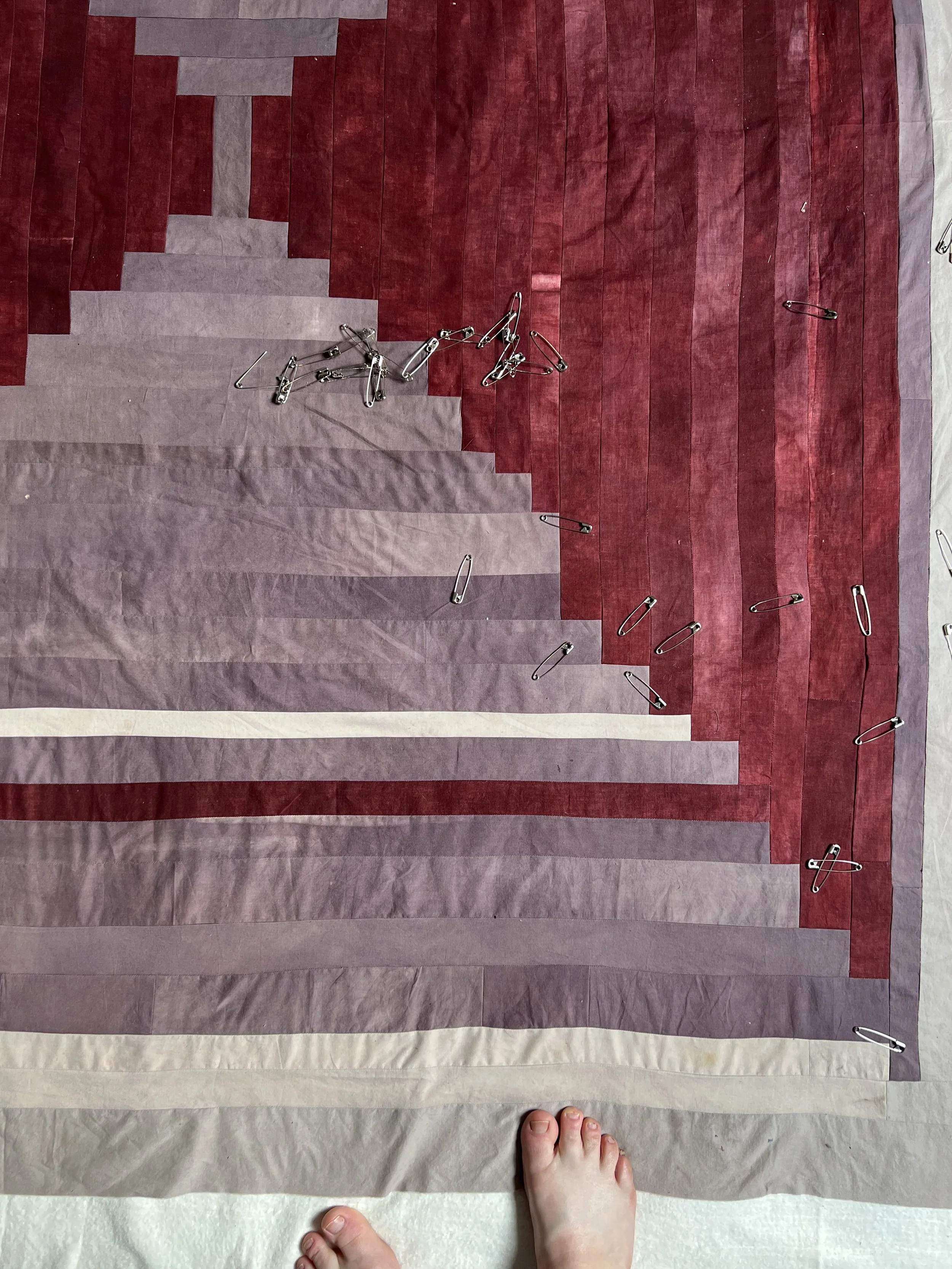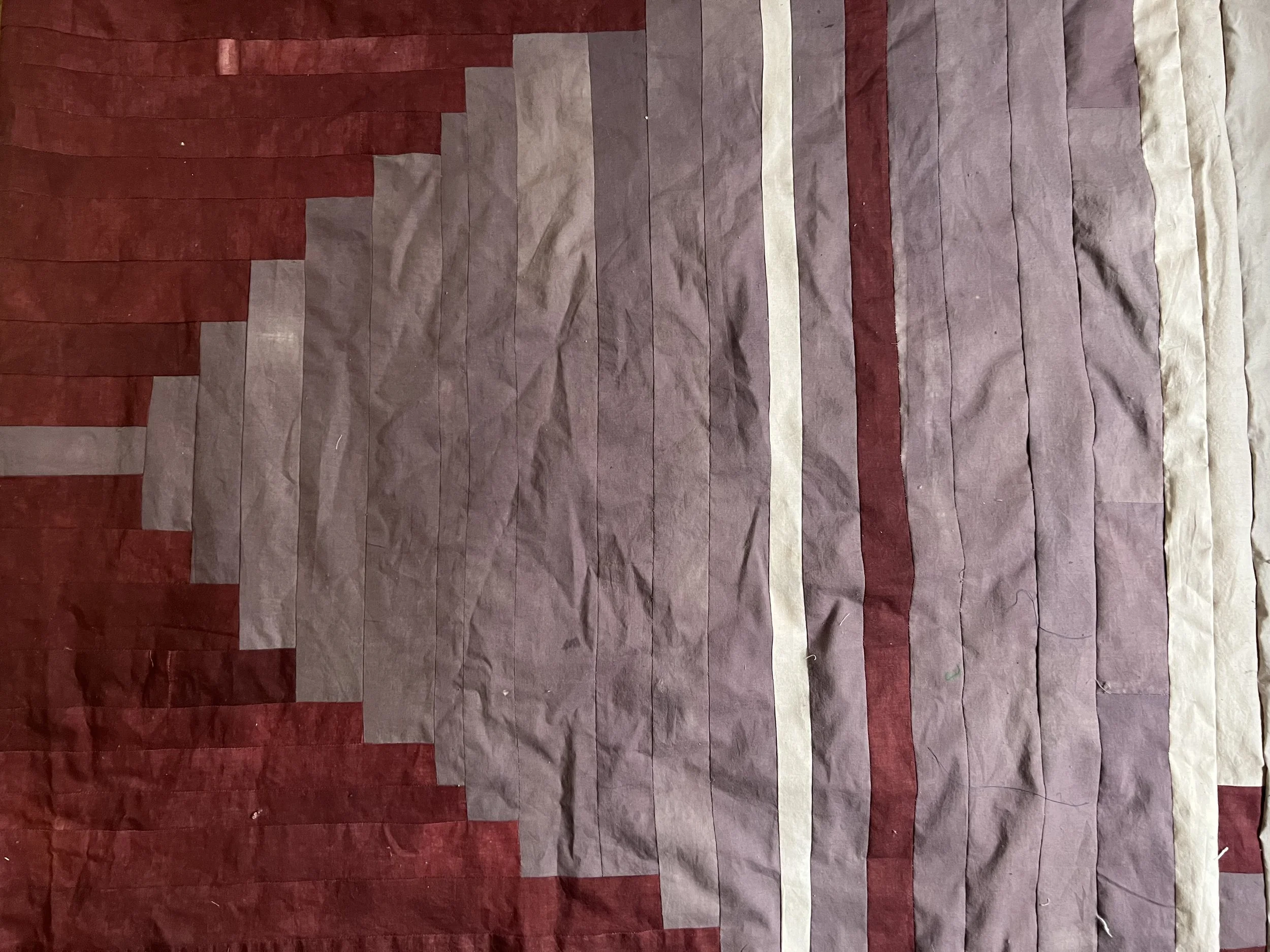 This quilt was pieced with a machine and hand quilted. The cotton was hand dyed by the artist. This was hand quilted with thin Sashiko style thread in horizontal rows about 1 to 1 1/2 inch apart following the seams. the binding is machine stitched on the front and hand tacked on the back to hide the stitches. The strips are sewn in the courthouse steps pattern from strips cut by eye and end cut during construction.