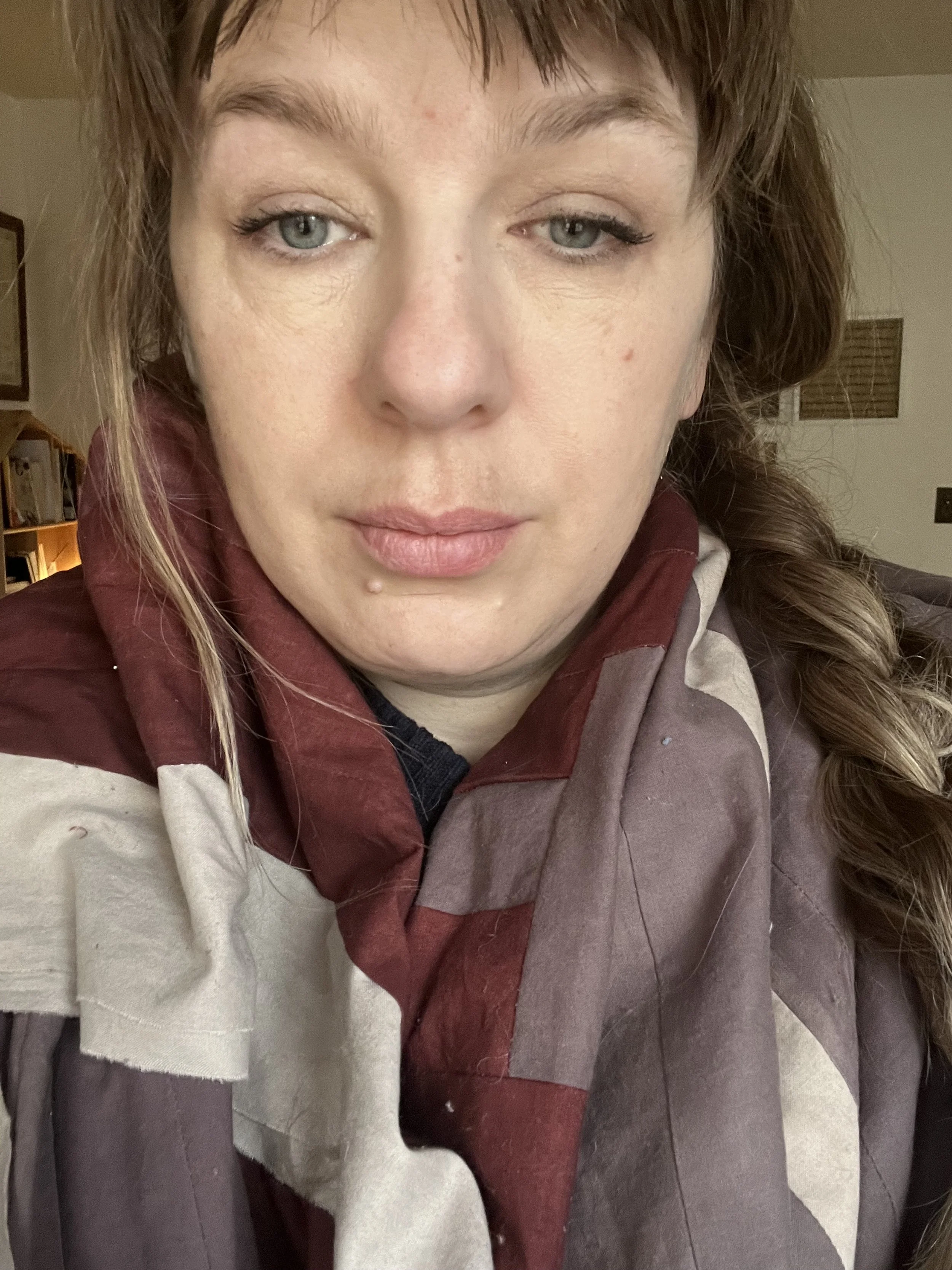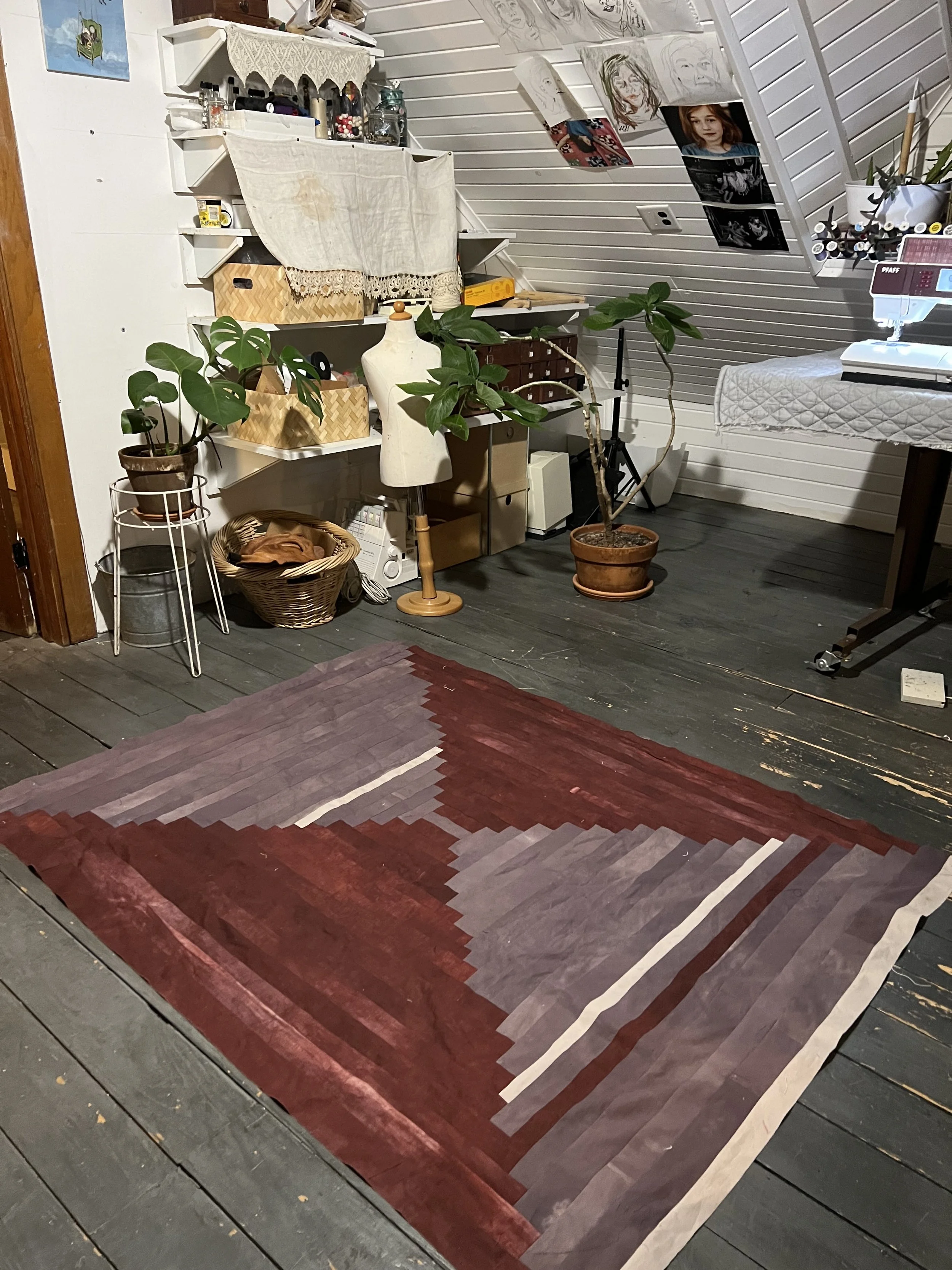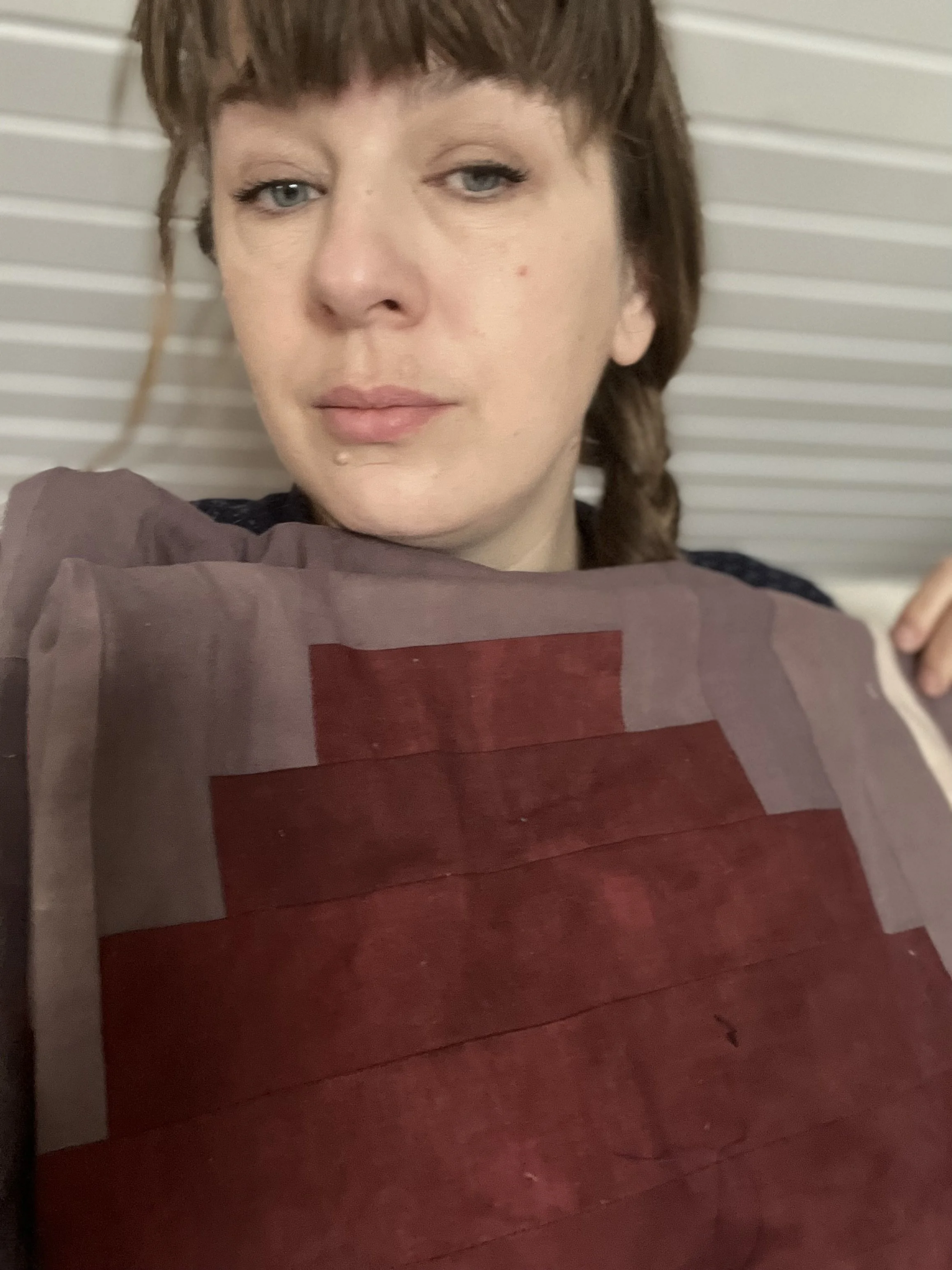 A gothy grey quilt for a gothy grey child. My oldest entered their teen years with a bang of fashion and theater arts. This courthouse steps quilt is made from dyes I forgot to keep in my journal. I know they were both adjusted with iron to created this grey tone. The edging is from madder.