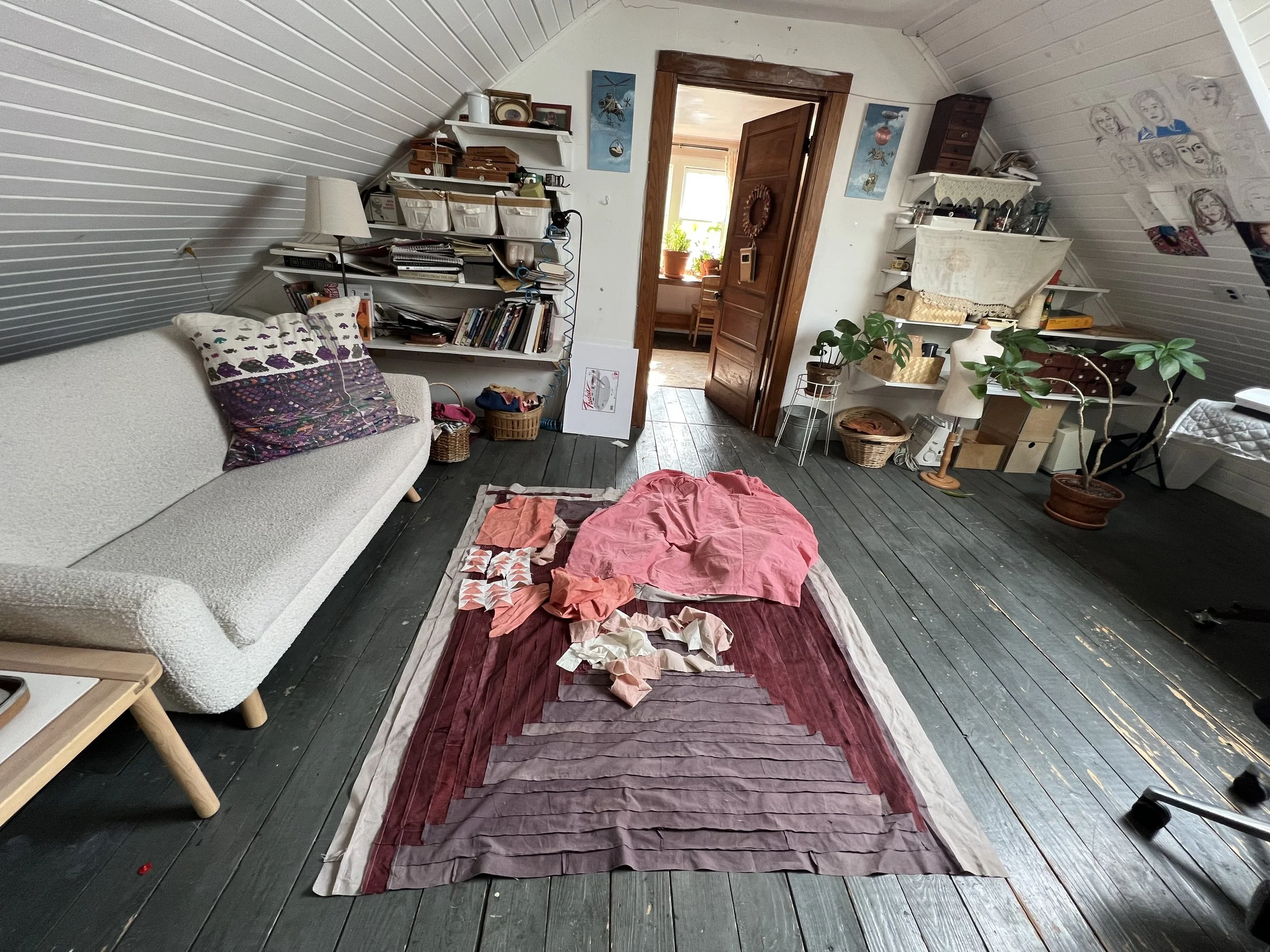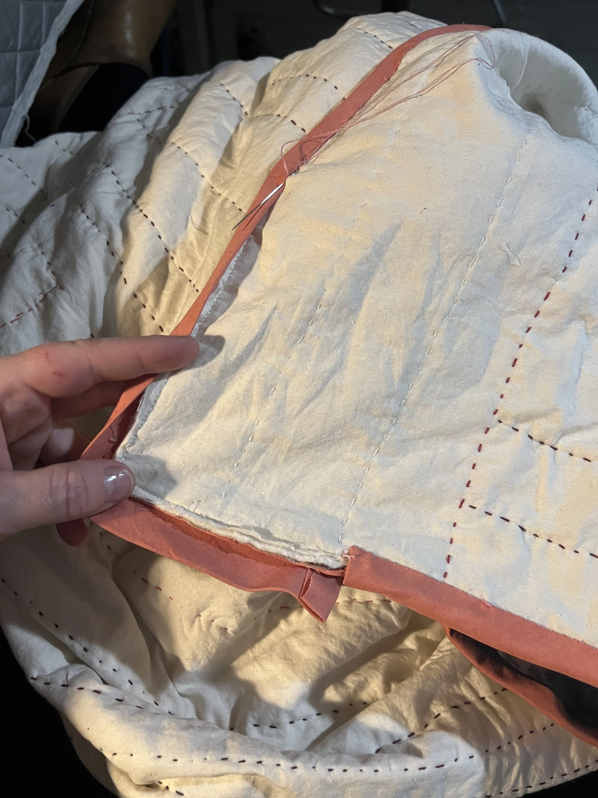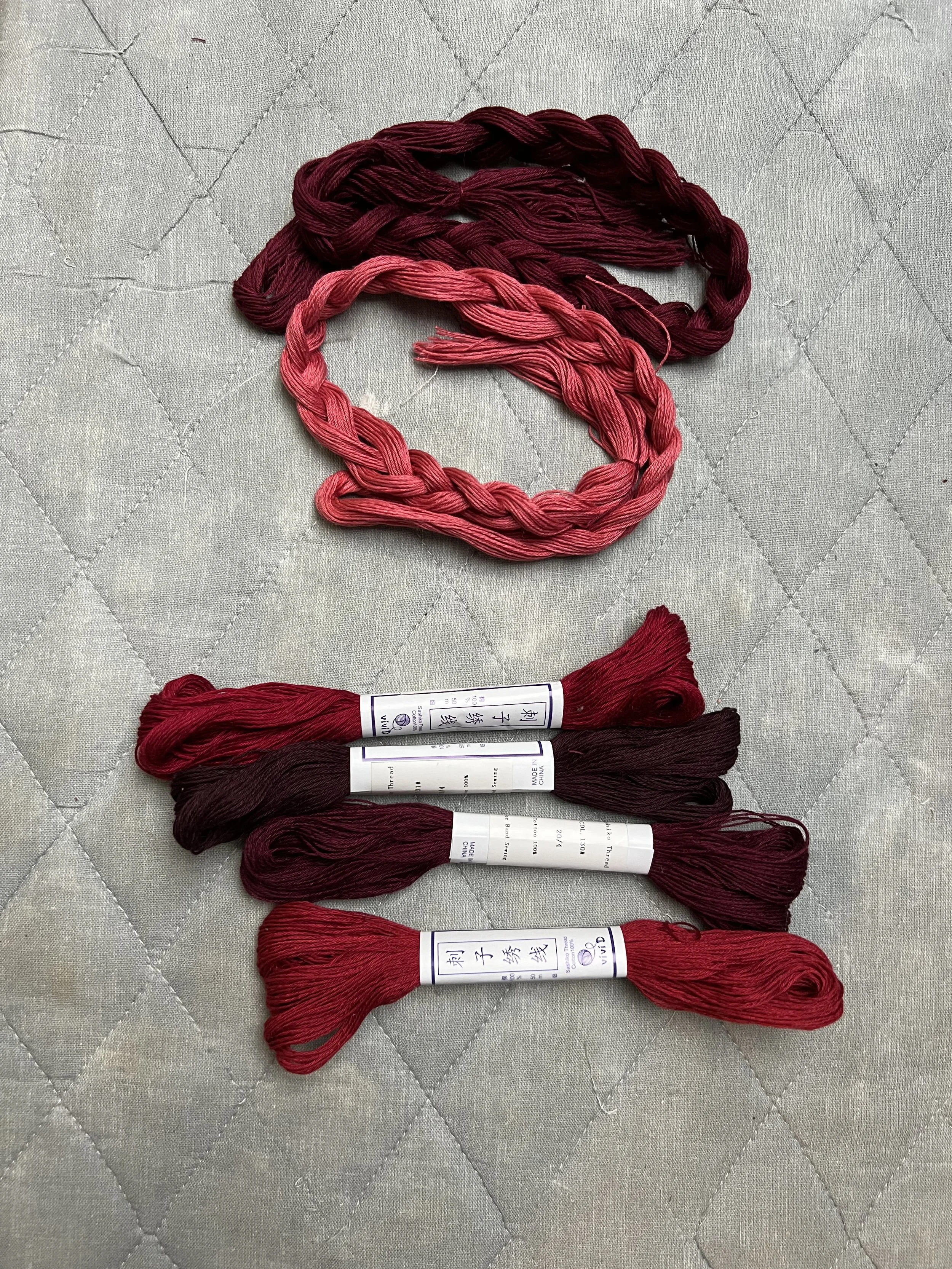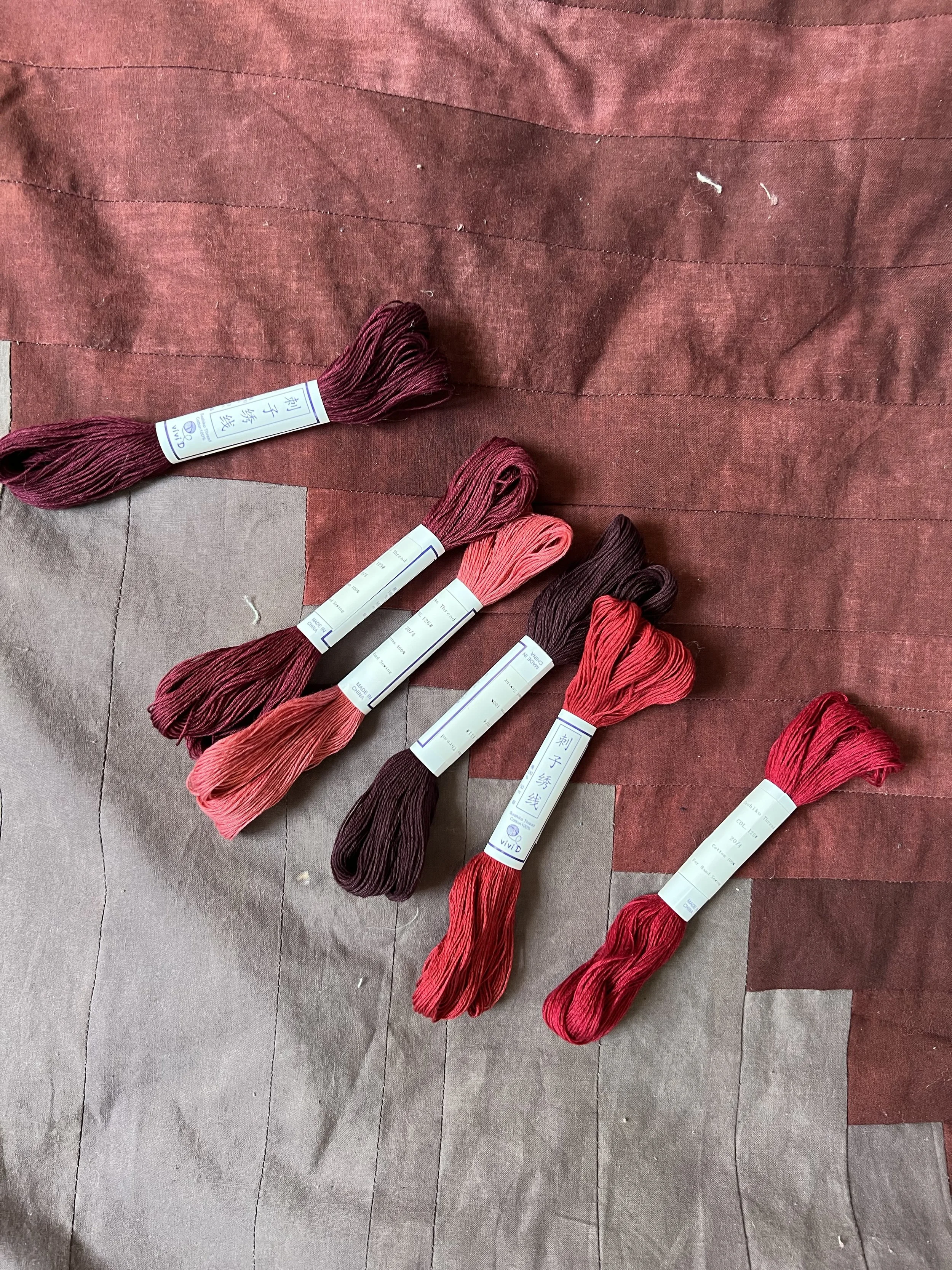 Cotton, naturally dyed with something I can’t recall, adjusted with iron. The back and binding is dyed with madder. Hand quilted with multicolored thin sashiko thread. Cotton batting and back.