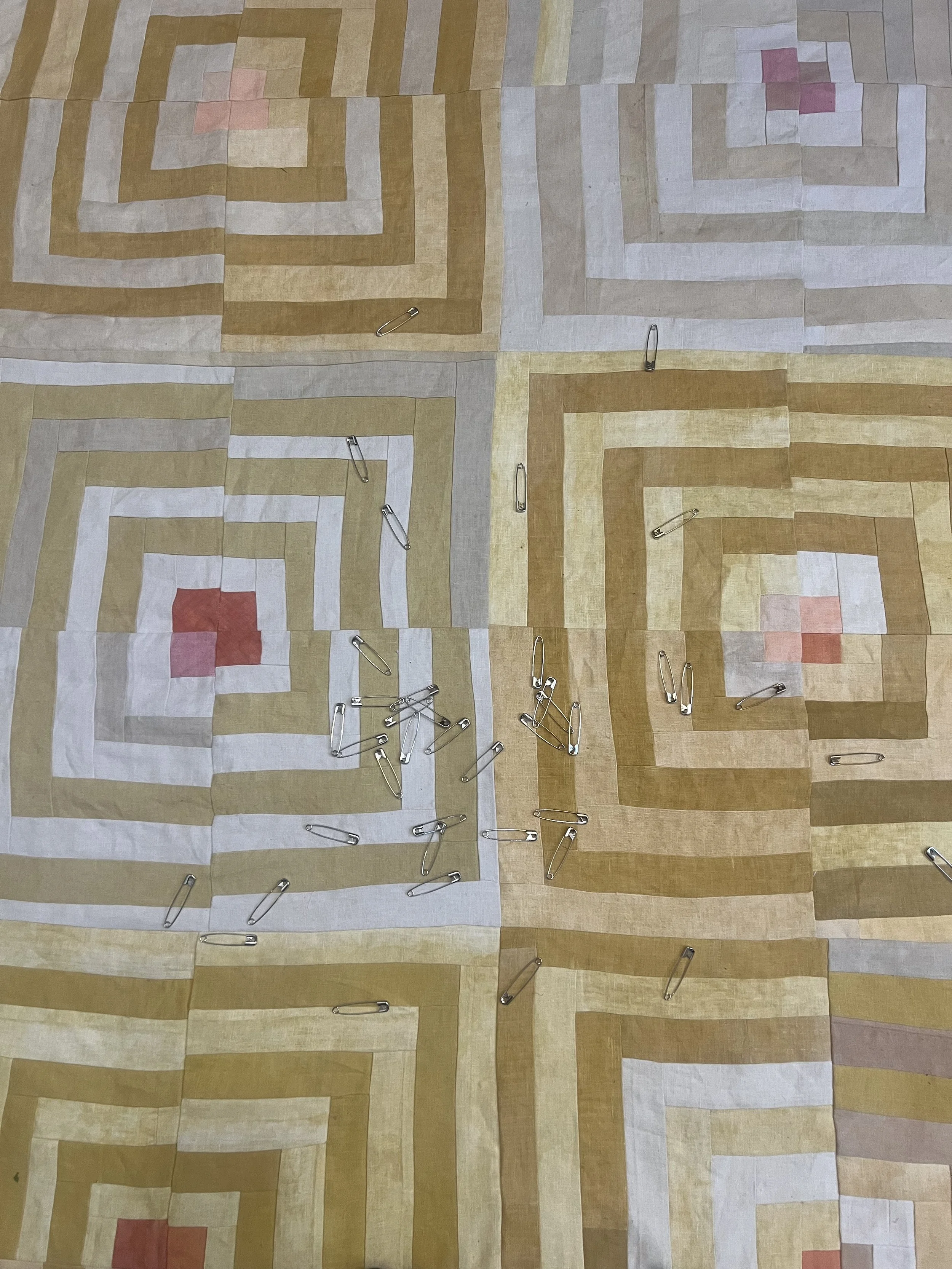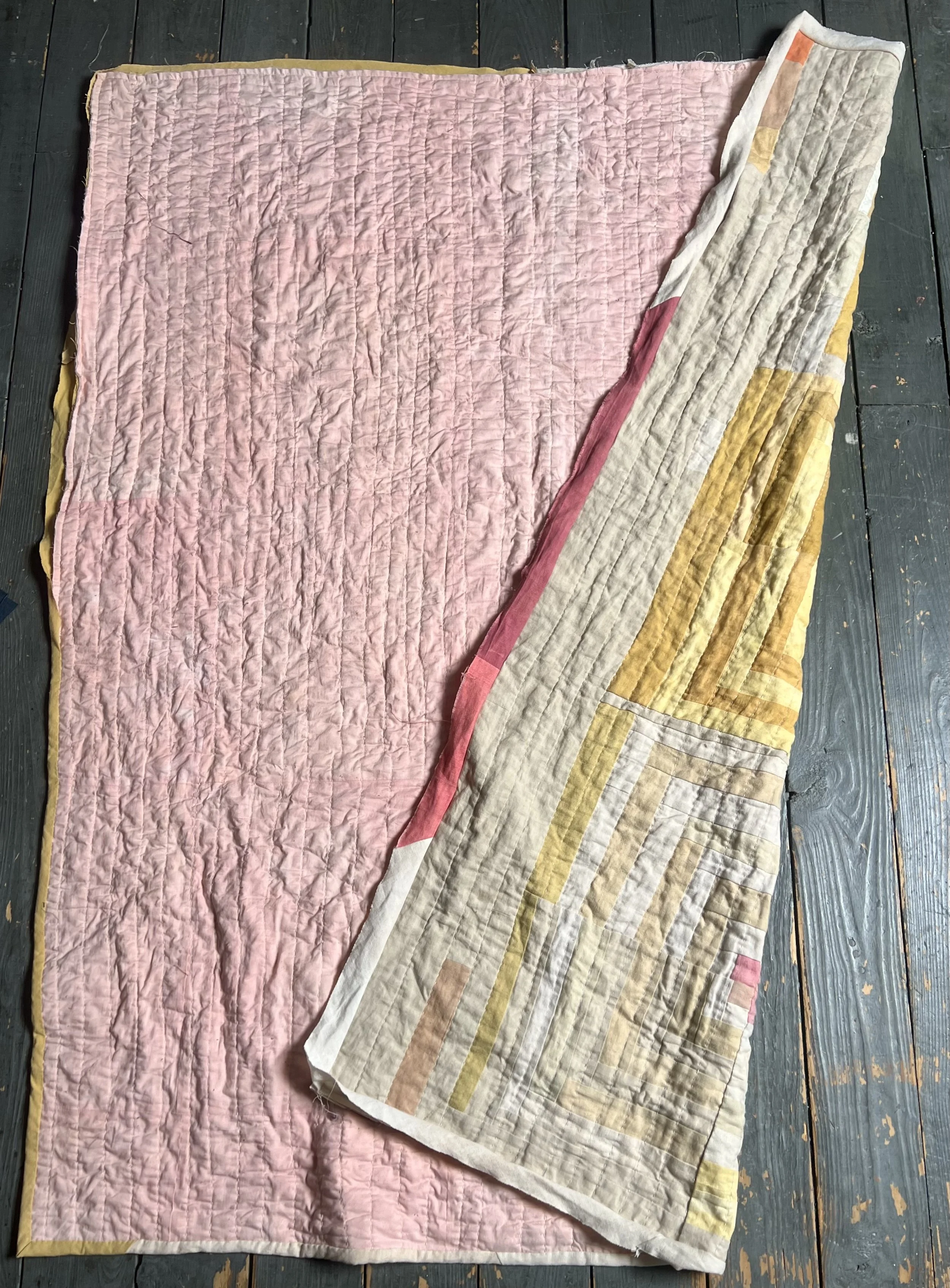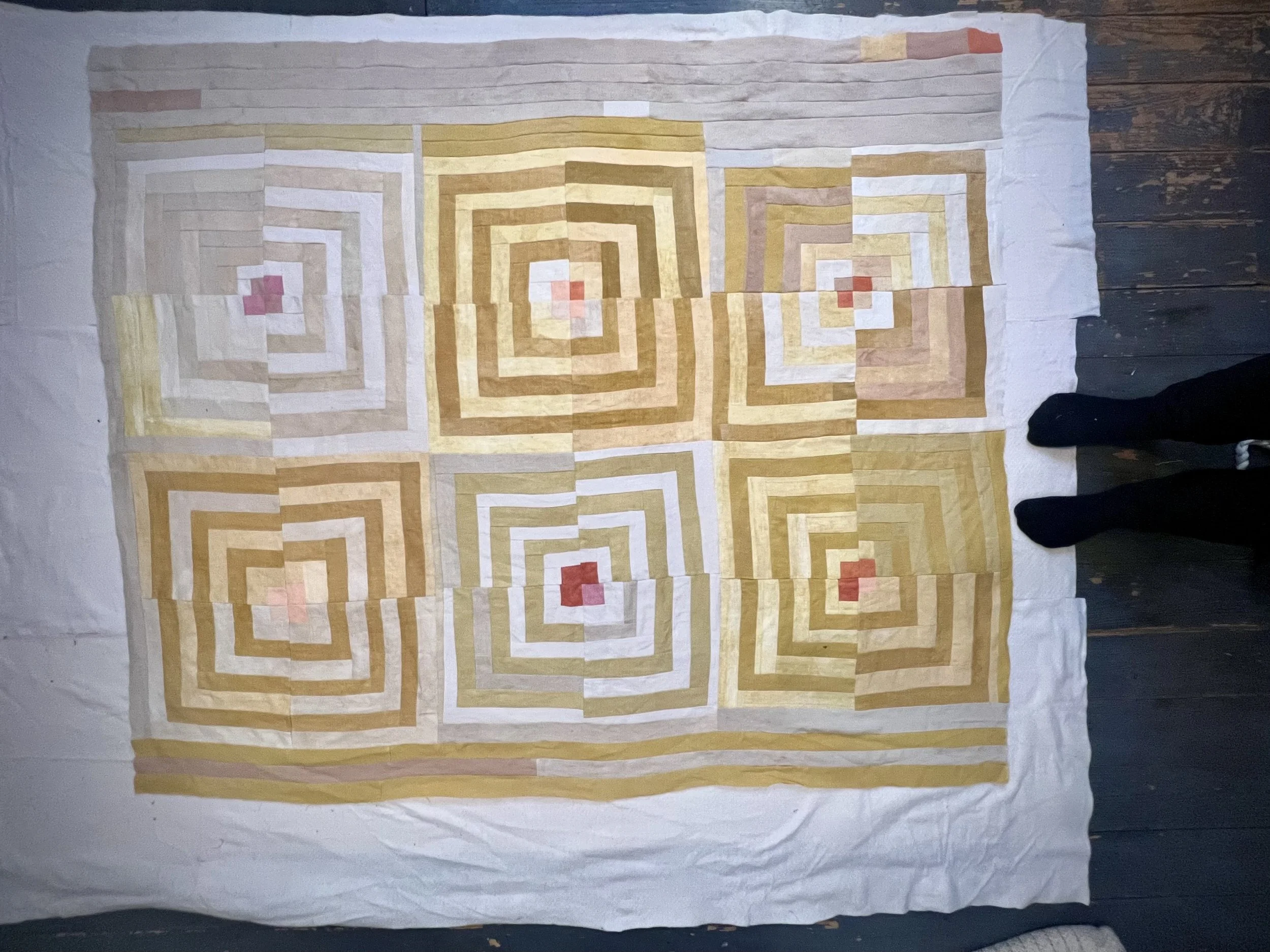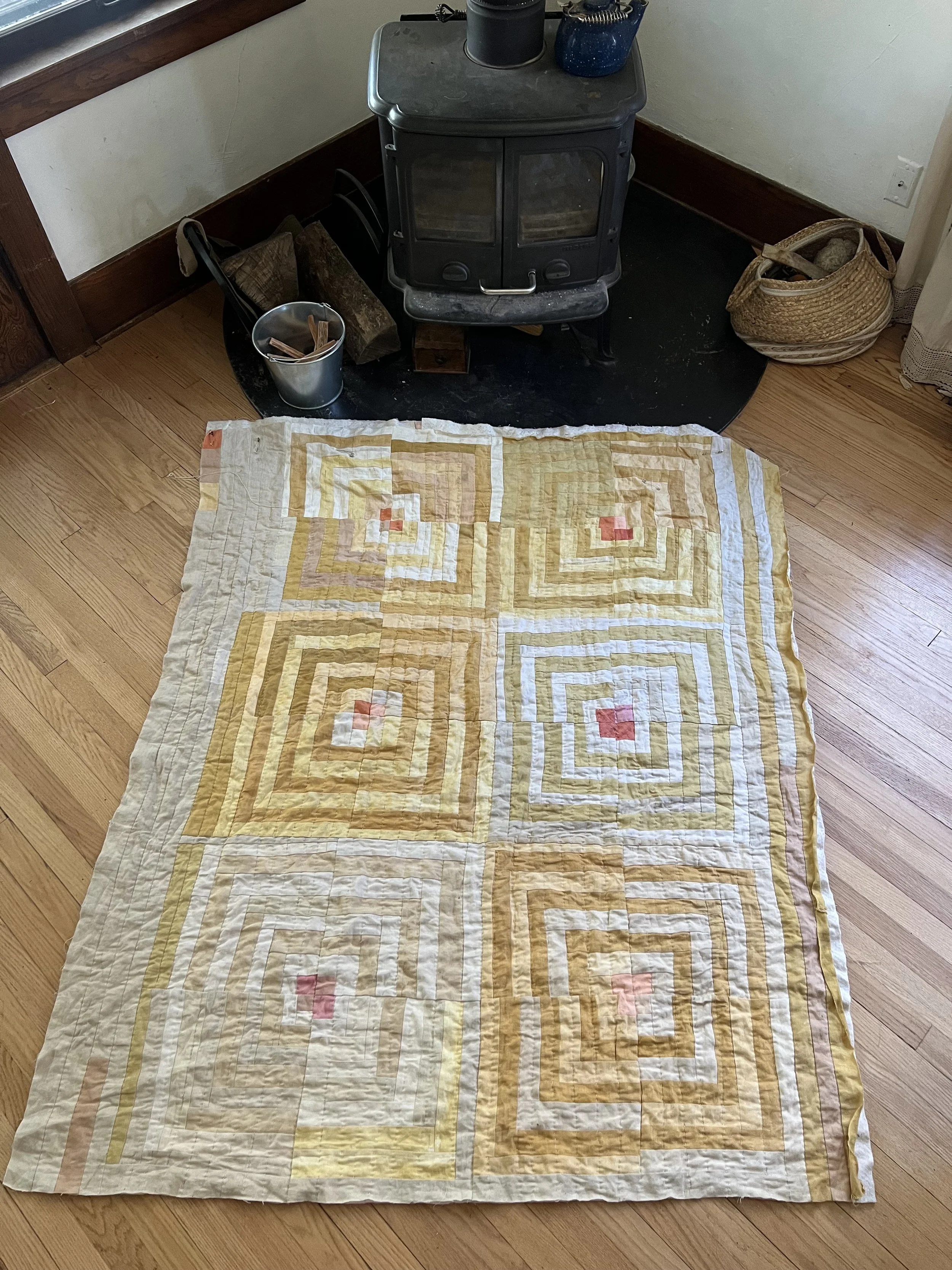 This quilt is dyed with a variety of yellow natural dyes including: osage orange, tesu, and pomegranate. The pinks are from madder and lac. The ivories are a mix of black tea, coffee, and acorn.