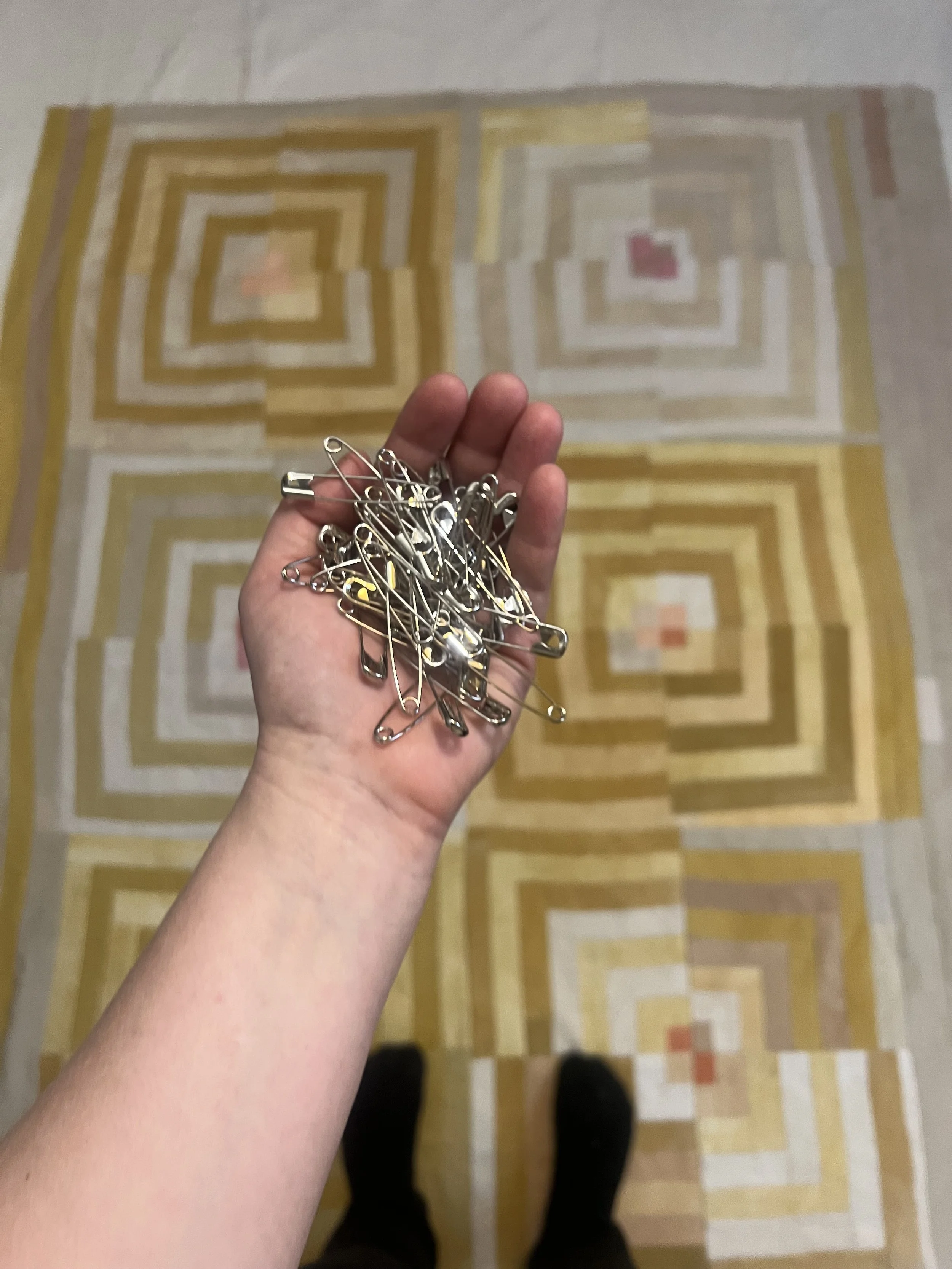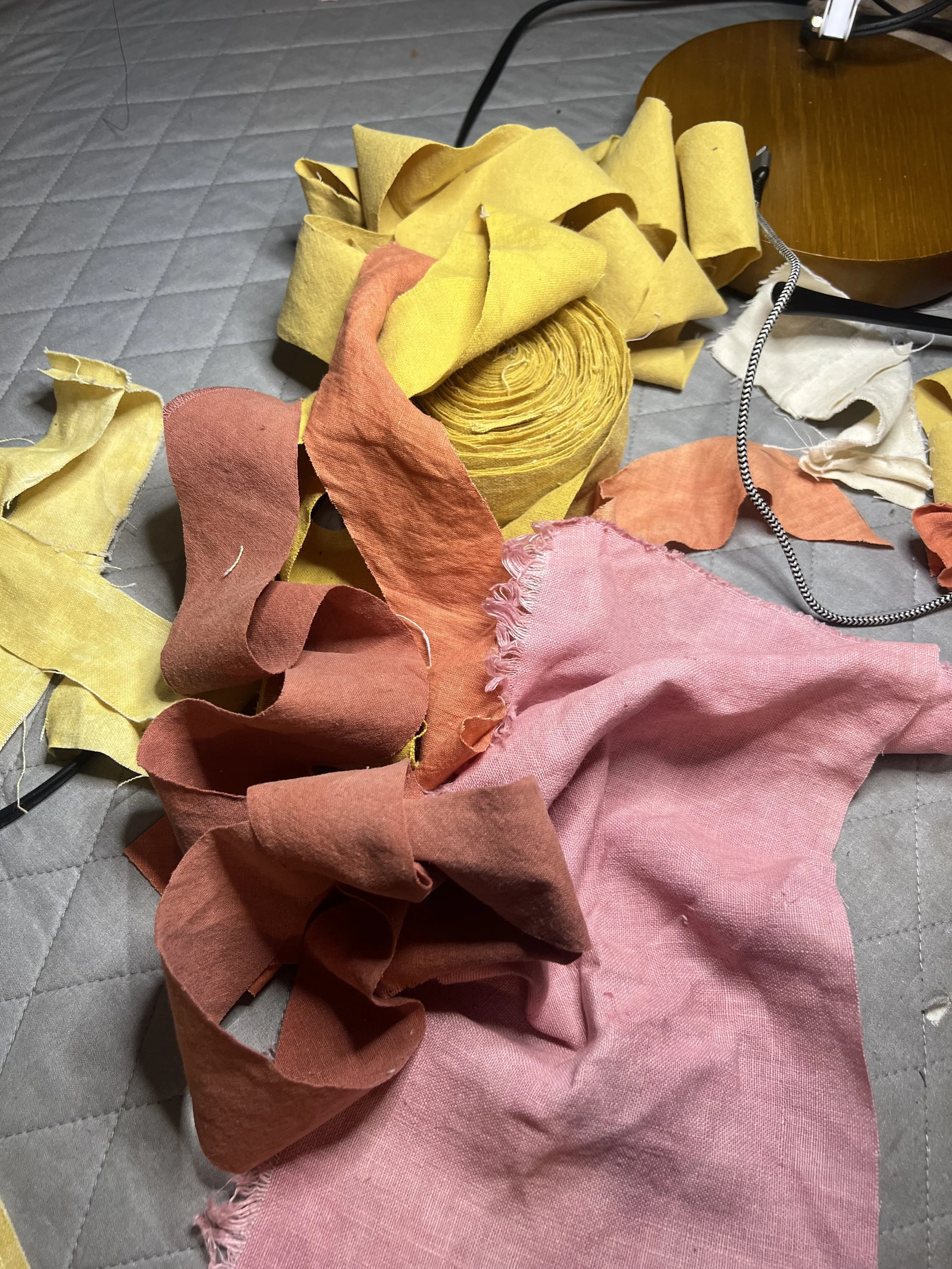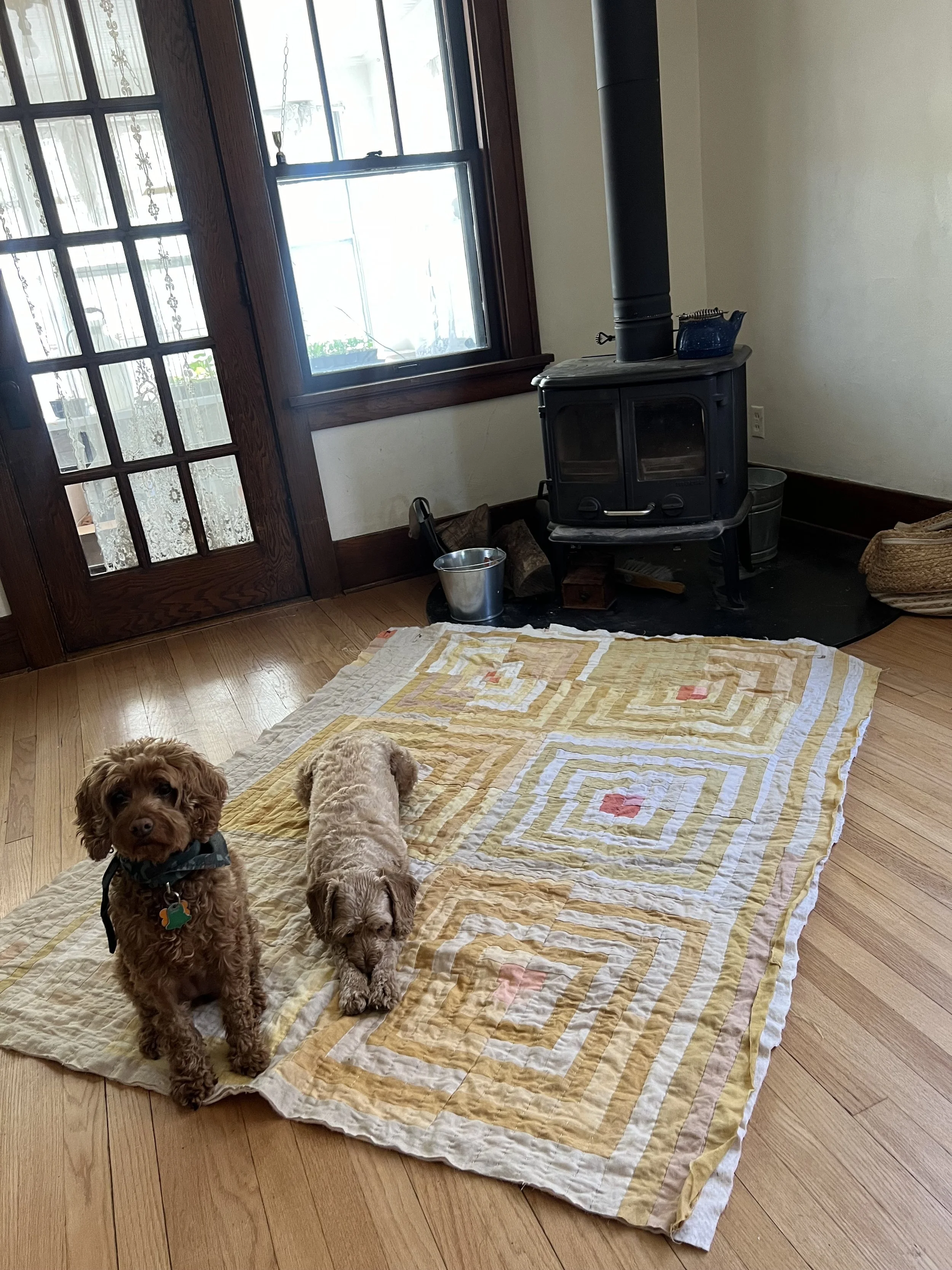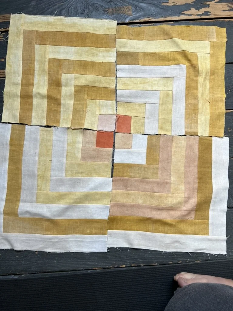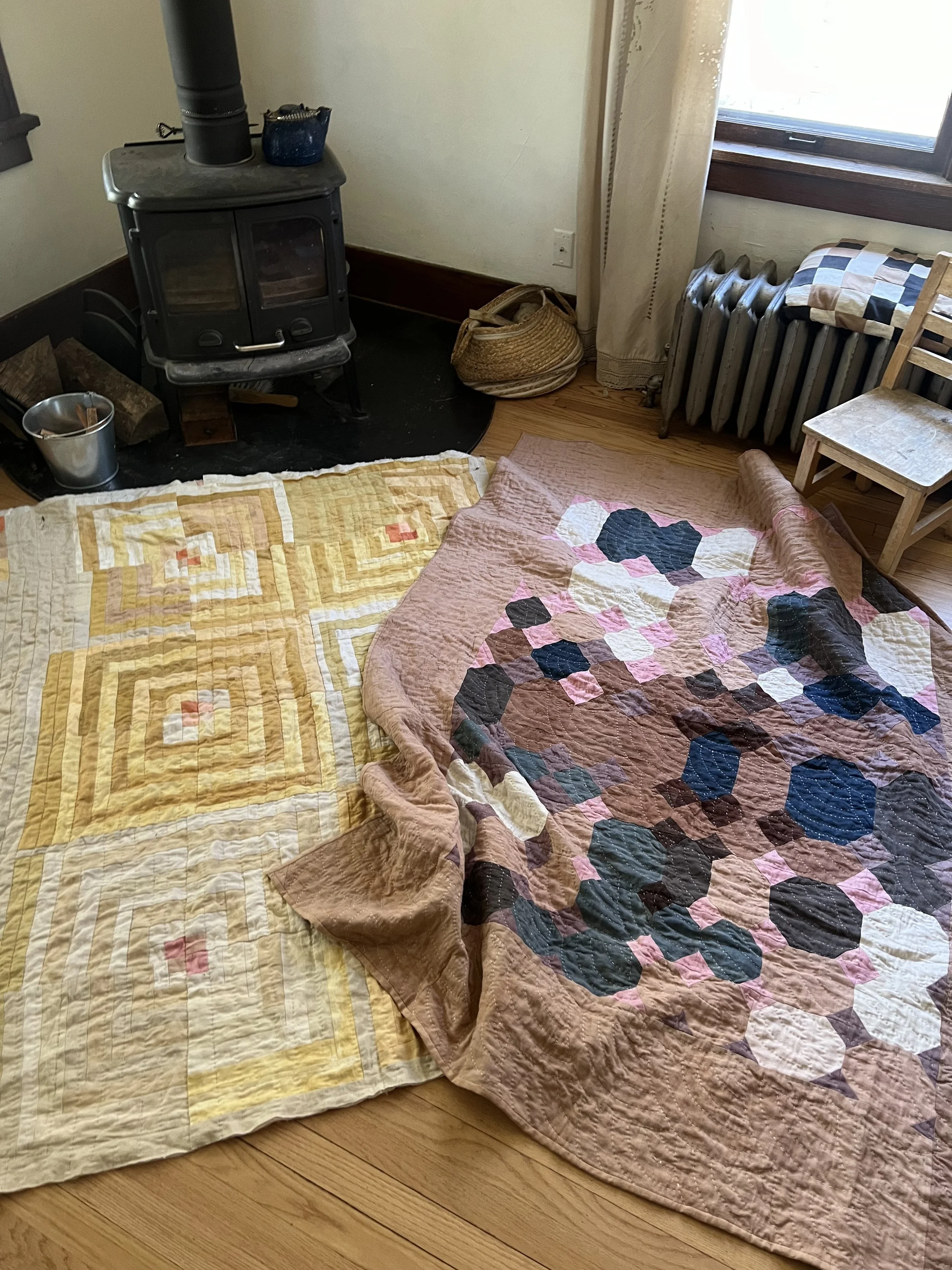This quilt is dyed with a variety of yellow natural dyes including: osage orange, tesu, and pomegranate. The pinks are from madder and lac. The ivories are a mix of black tea, coffee, and acorn.