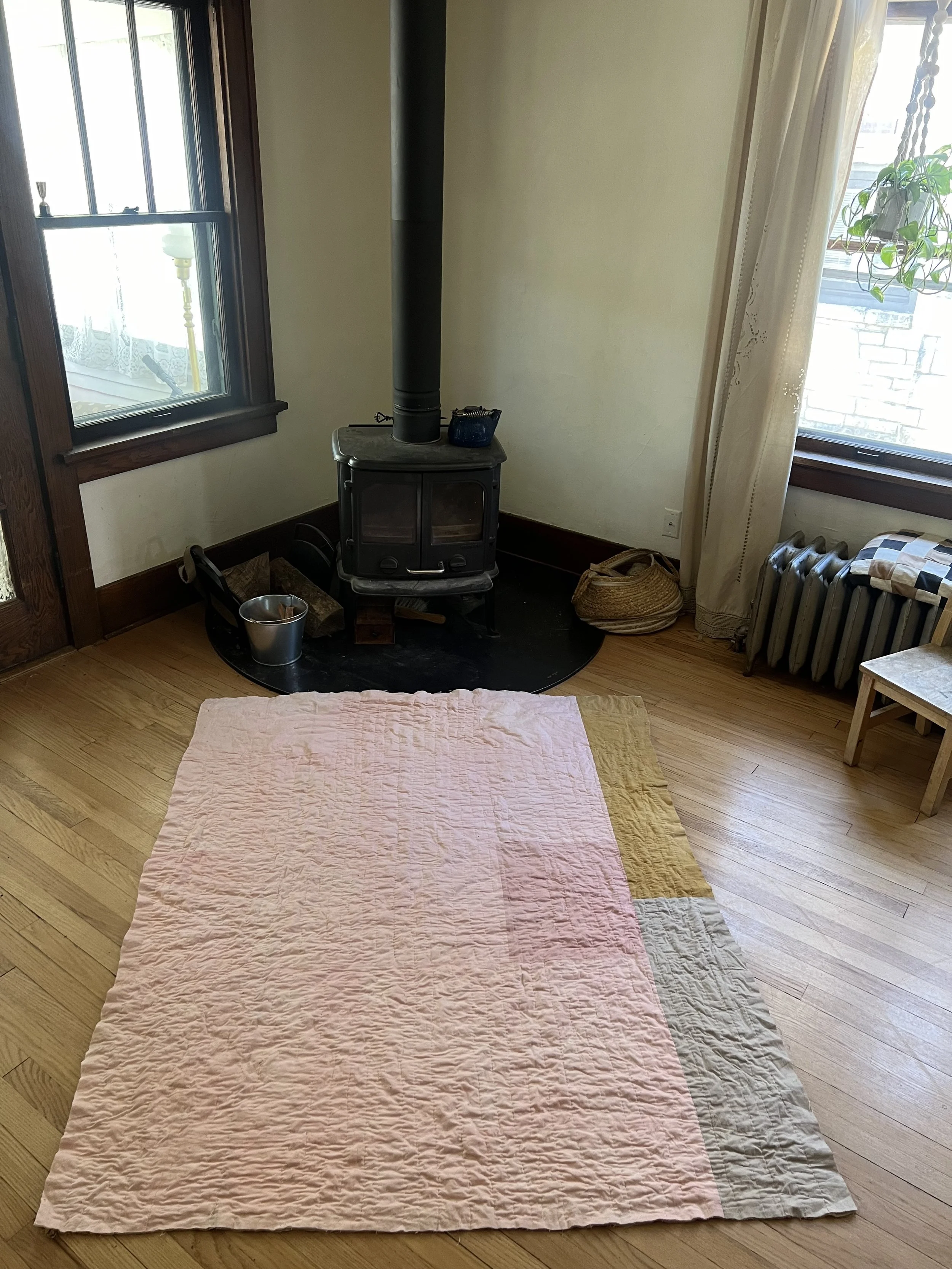 This quilt was pieced with a machine and hand quilted. The linen was hand dyed by the artist. This was hand quilted with thick Sashiko style thread. The binding is machine stitched on the front and hand tacked on the back to hide the stitches with mitered corners. The back is naturally dyed cotton constructed out of fabric remnants.