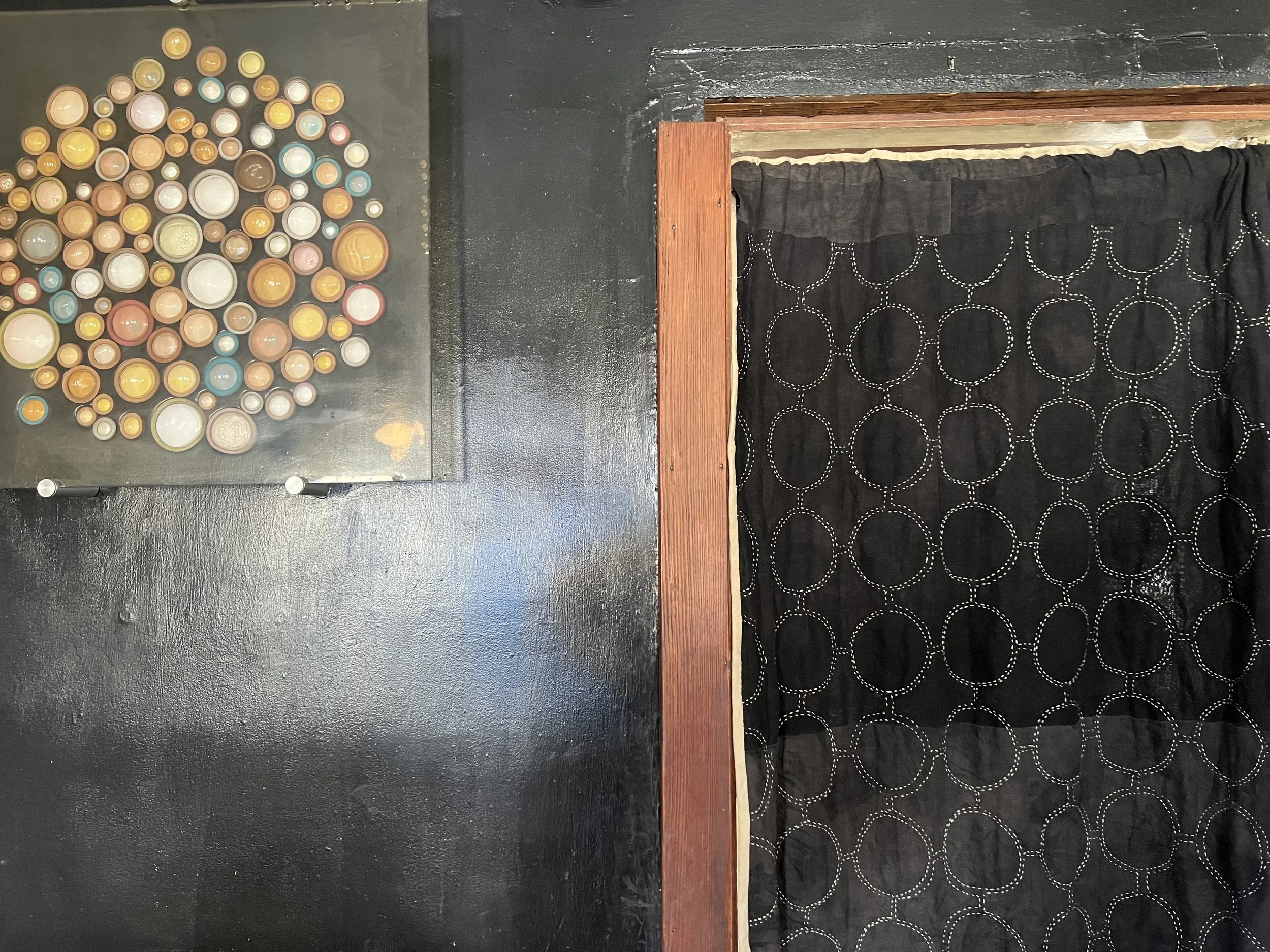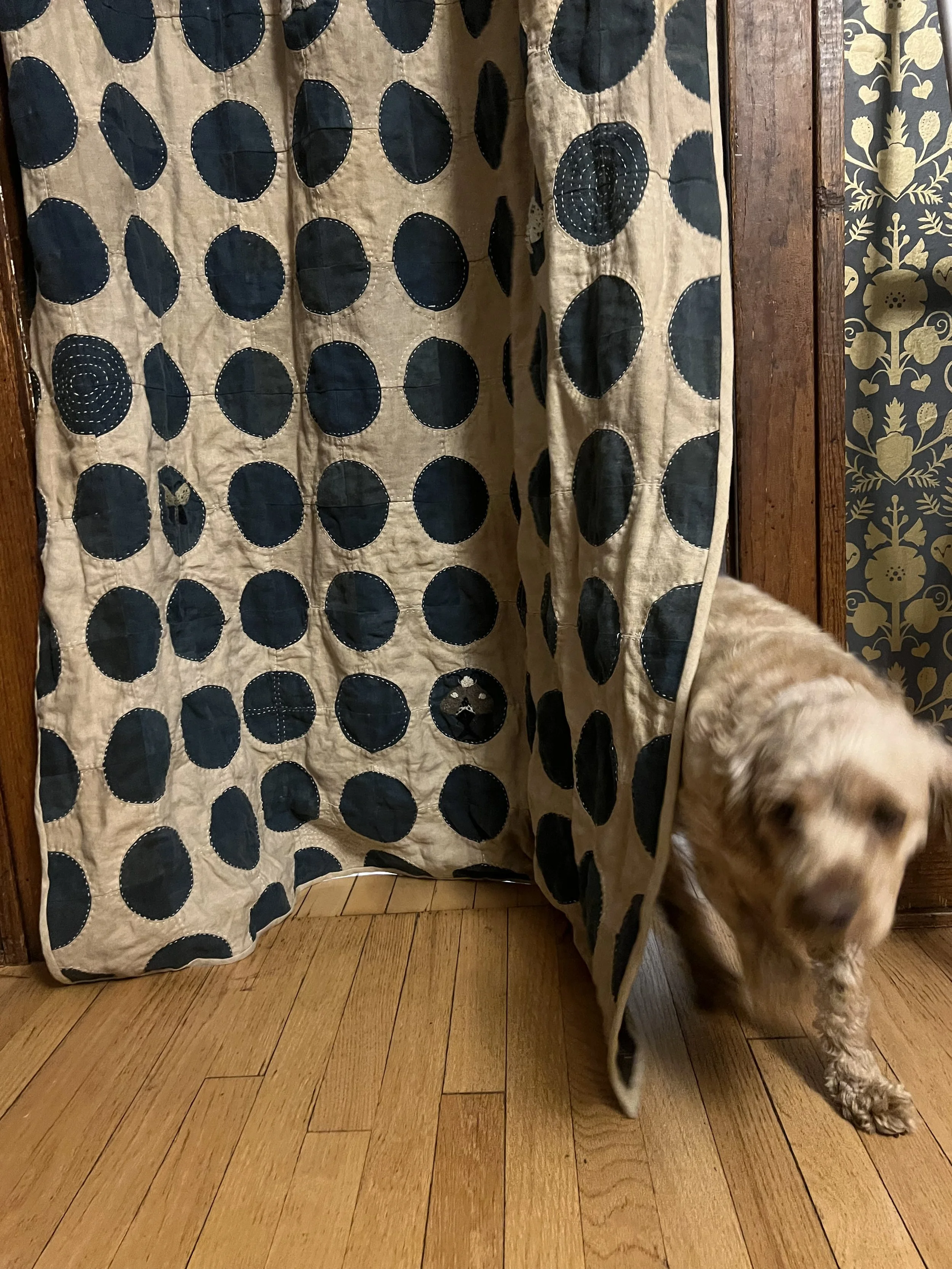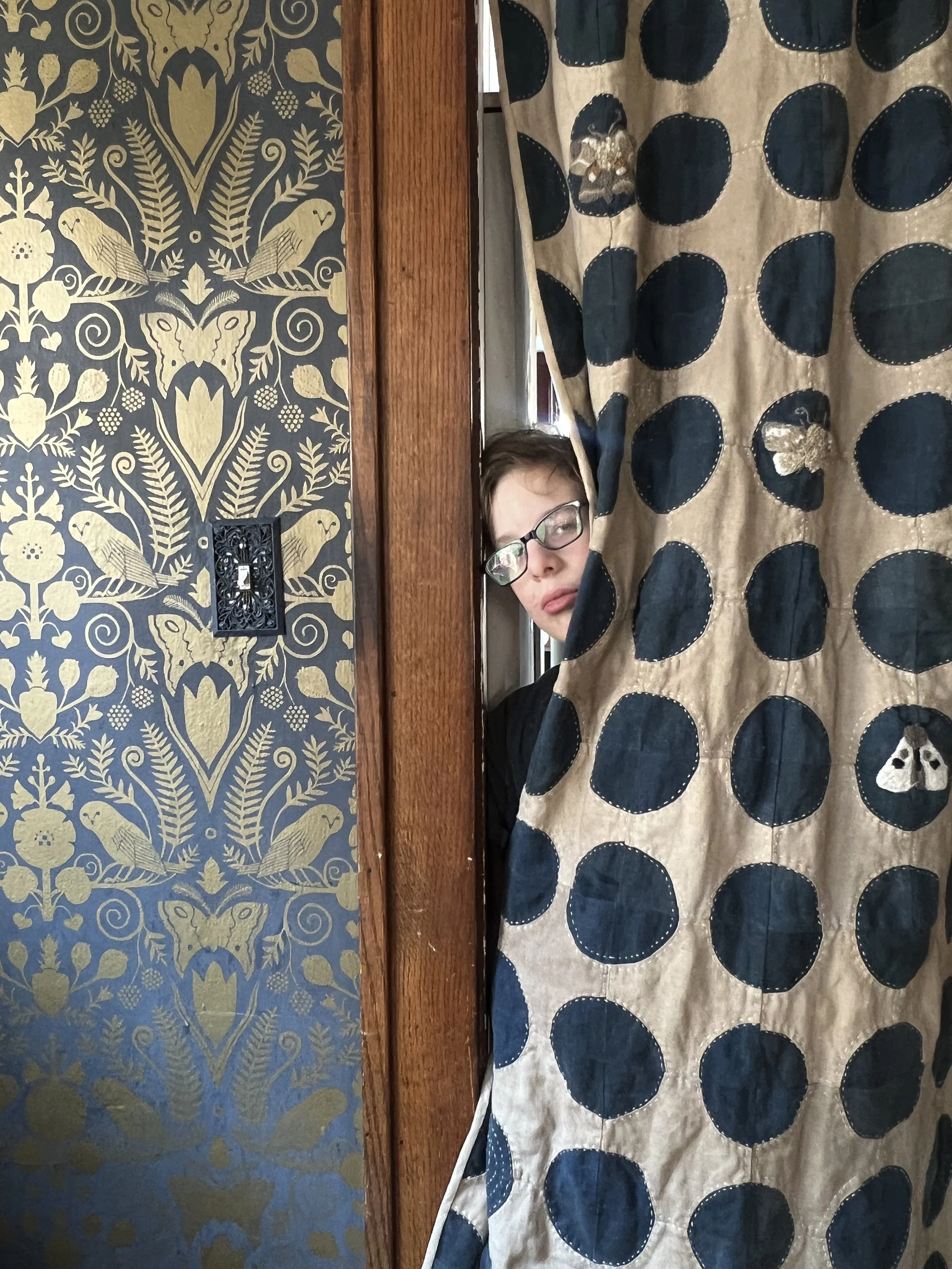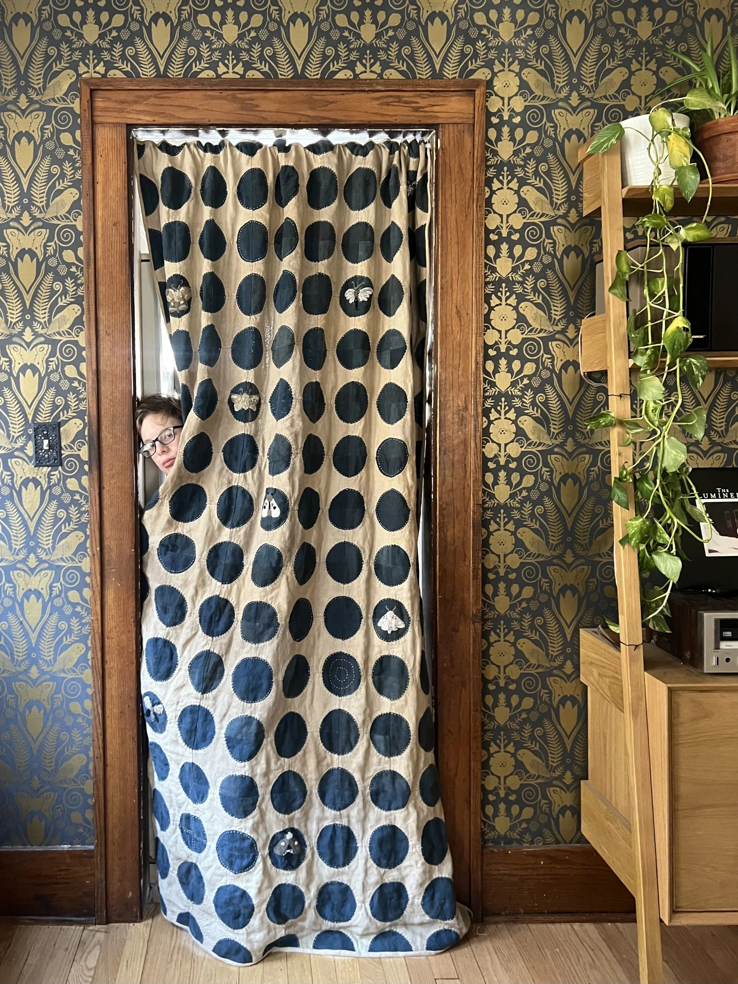 This quilt was designed was a doorway curtain in this cased opening inspired by the Hollyhocks and Owls wallpaper designed by Carson Ellis and printed by Thatcher Studio.