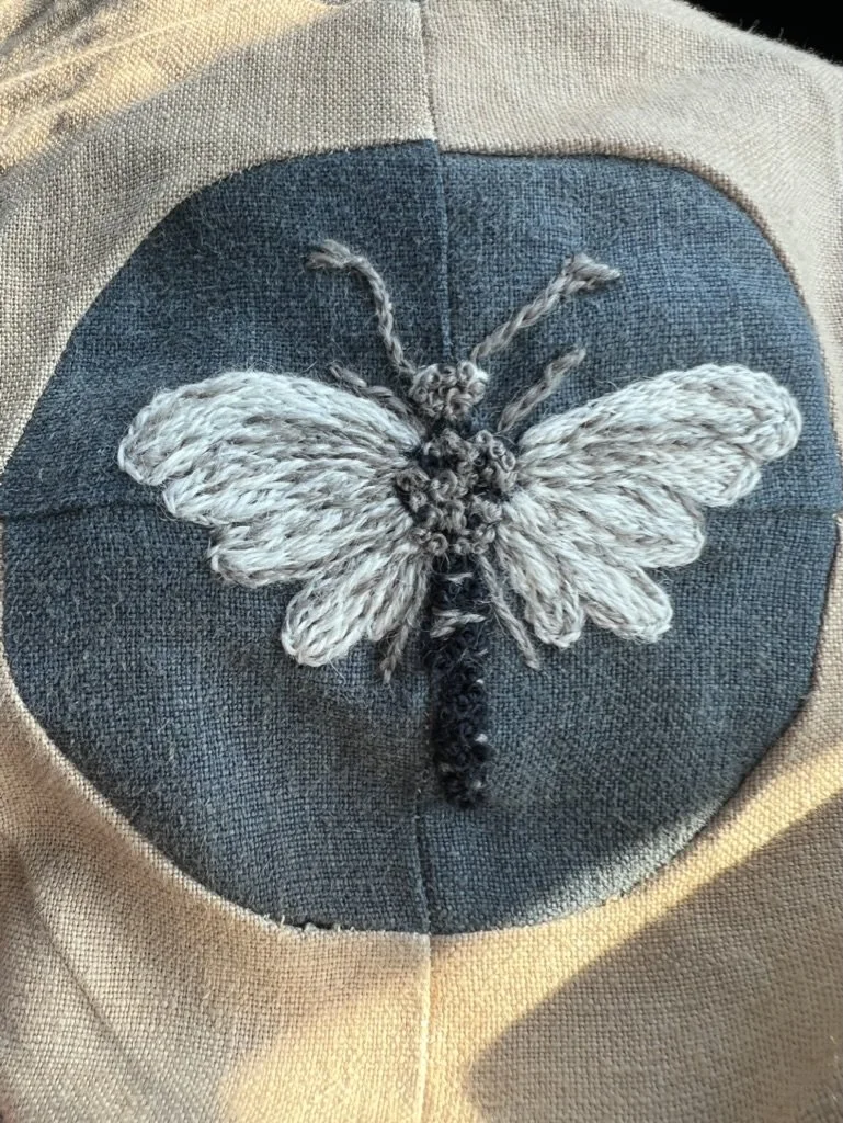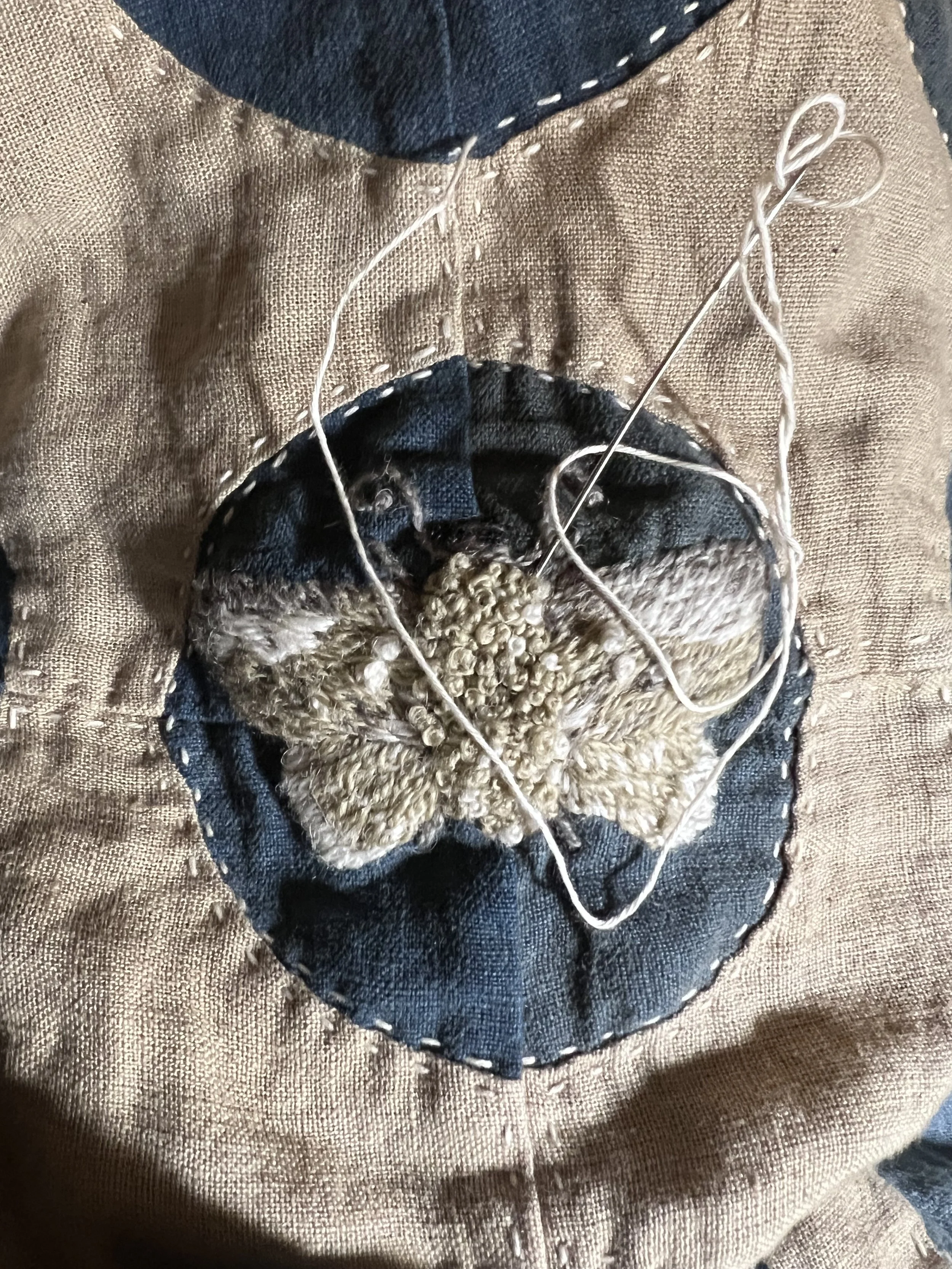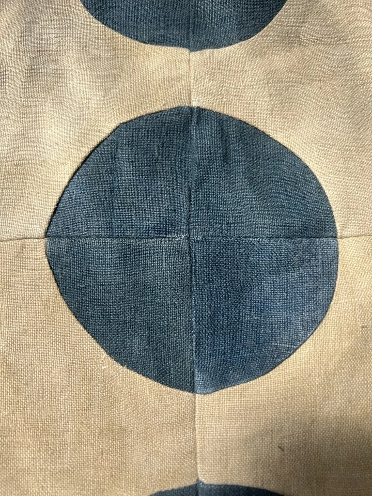 This curved snowball block is similar to the drunkards path block. The drunkards path is typically one quarter of the block. I drafted the block to avoid some of the straight seams. Hand embroidered crewelwork. Stitched with thick ivory Sashiko style thread by hand.