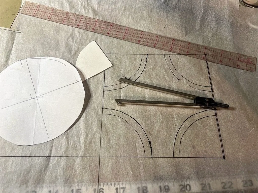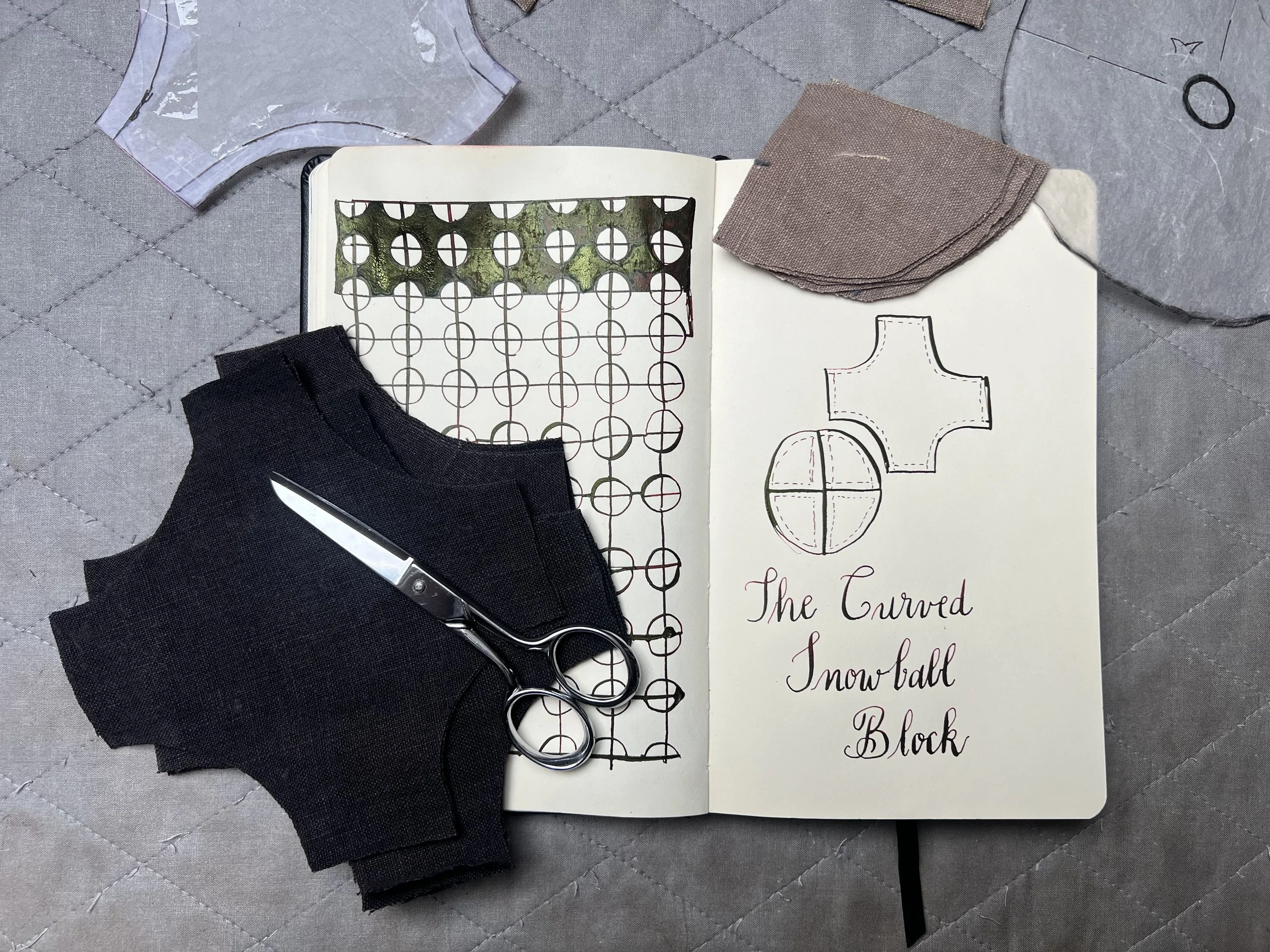 The quilt block is a curved variation of the traditional snowball block. Each block is composed of four quarter circles with a center piece.
