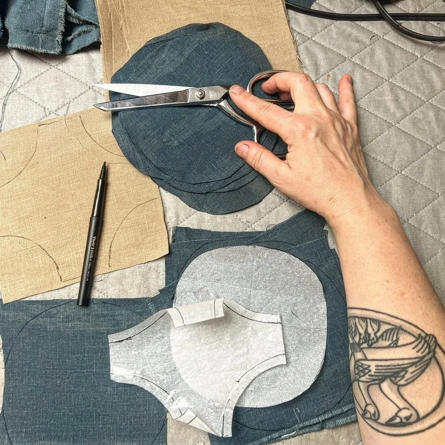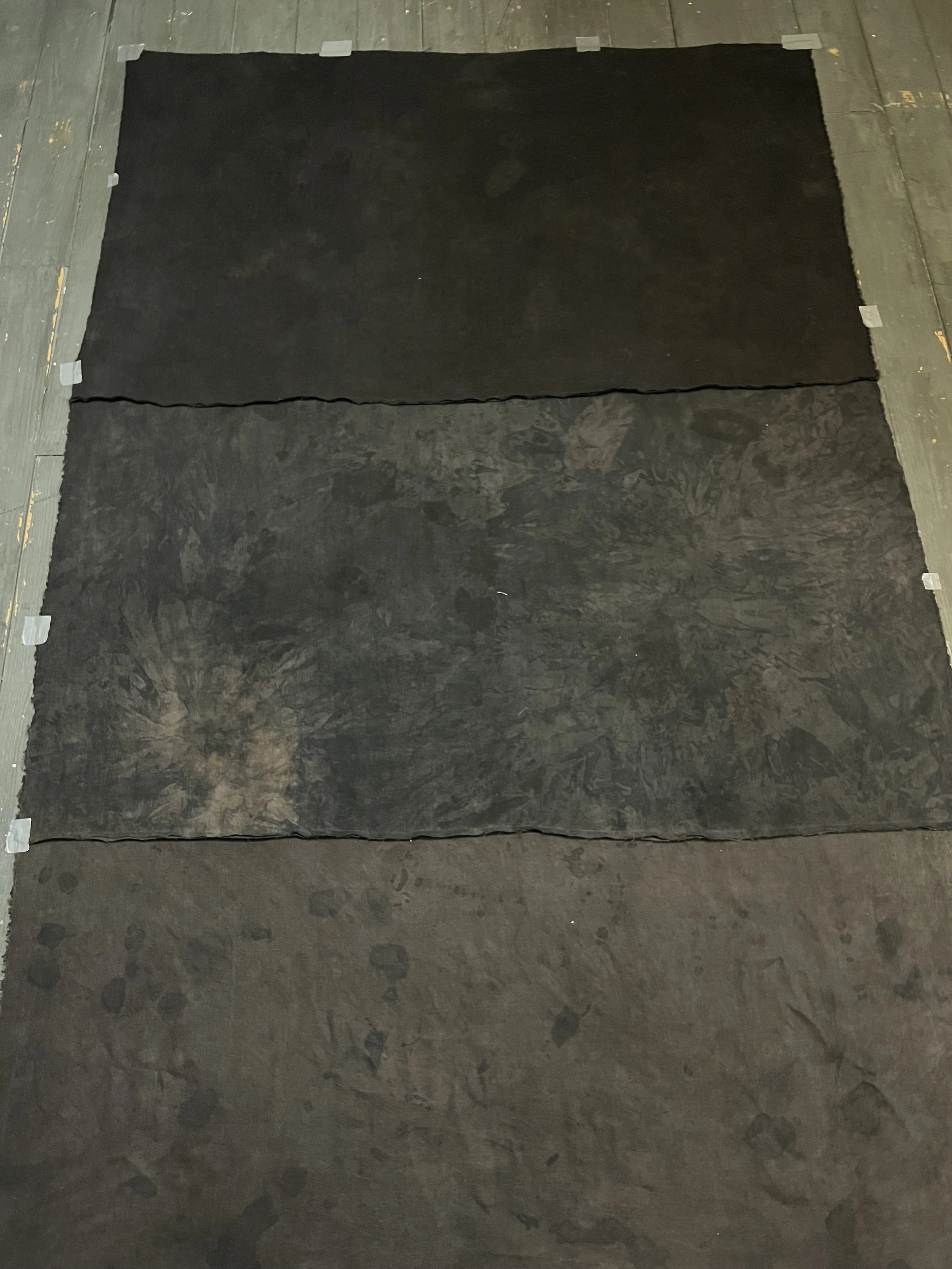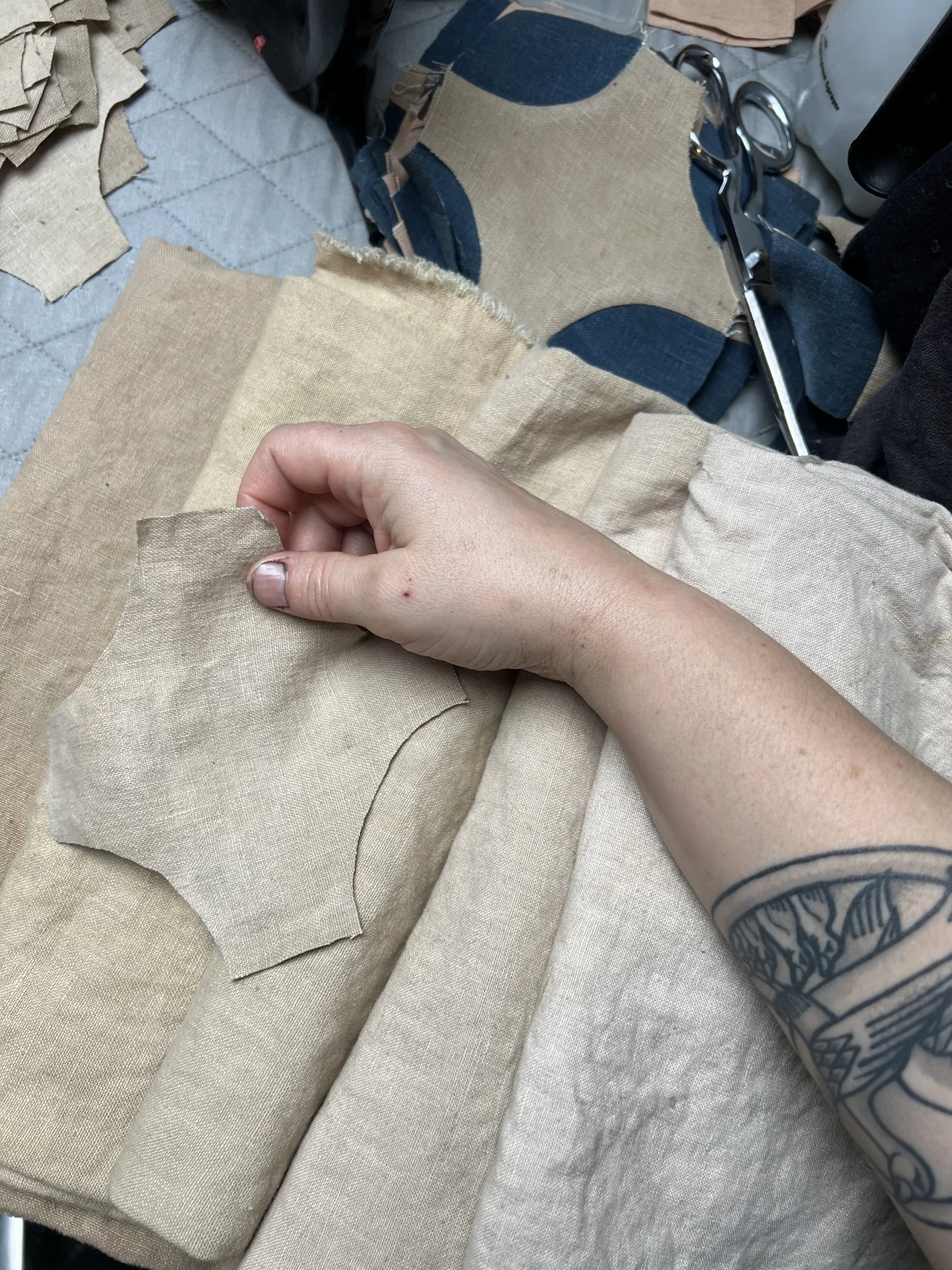 This quilt was pieced with a machine and hand embroidered and quilted. The linen was hand dyed by the artist. This was hand quilted with thick Sashiko style thread using the stitch in the ditch method. The binding is machine stitched on the front and hand tacked on the back to hide the stitches with mitered corners. The back is naturally dyed linen constructed out of fabric remnants.