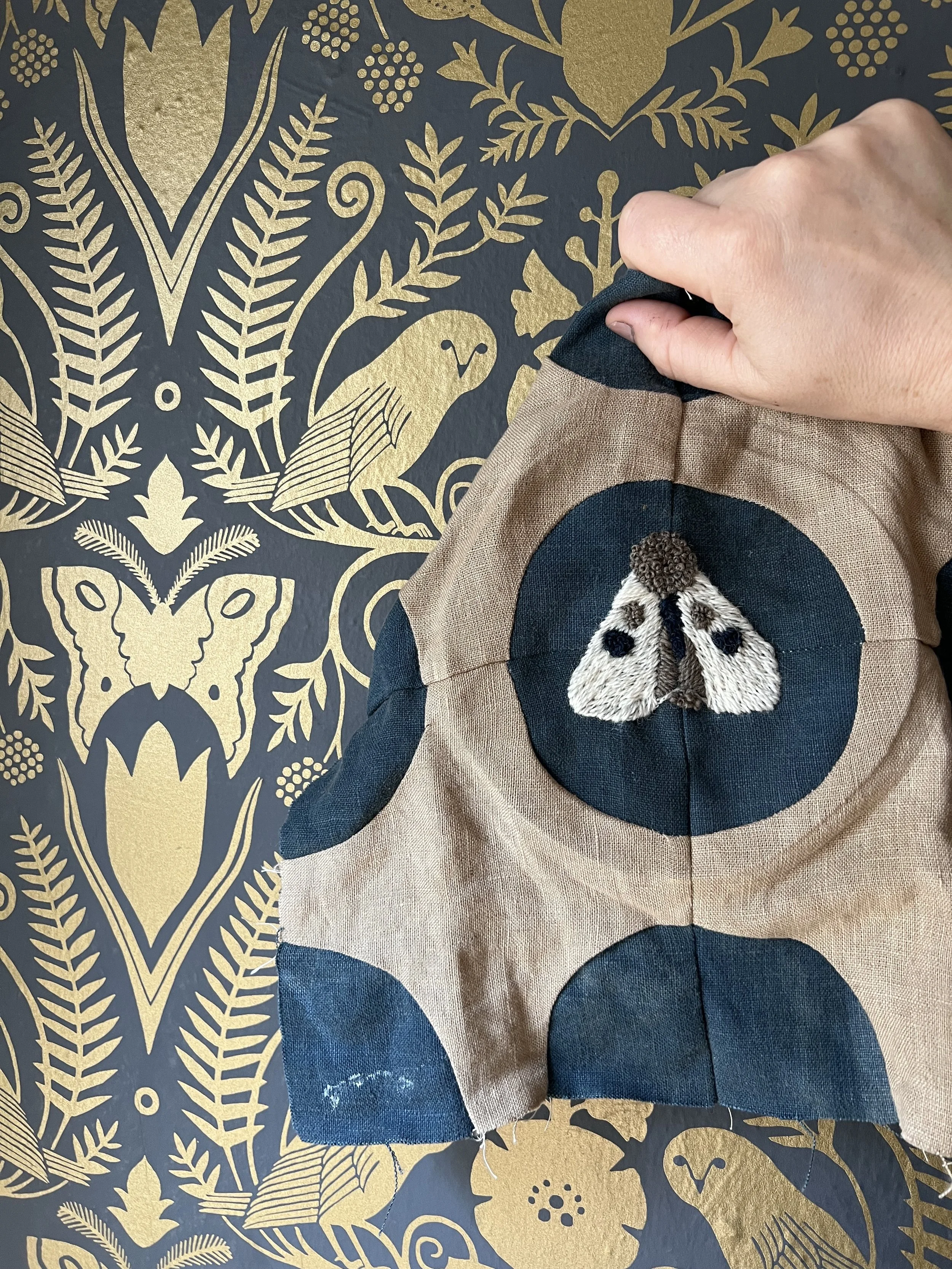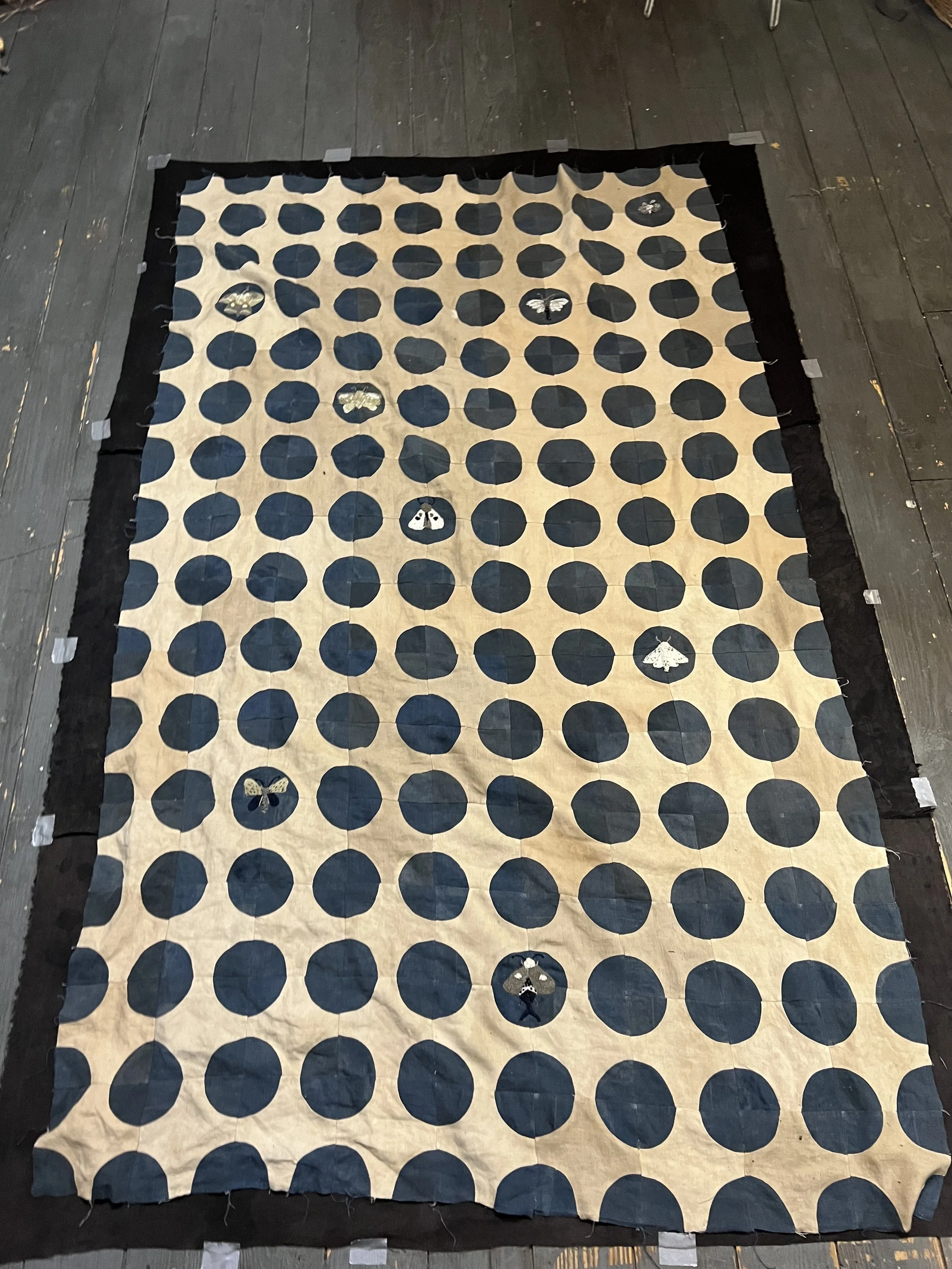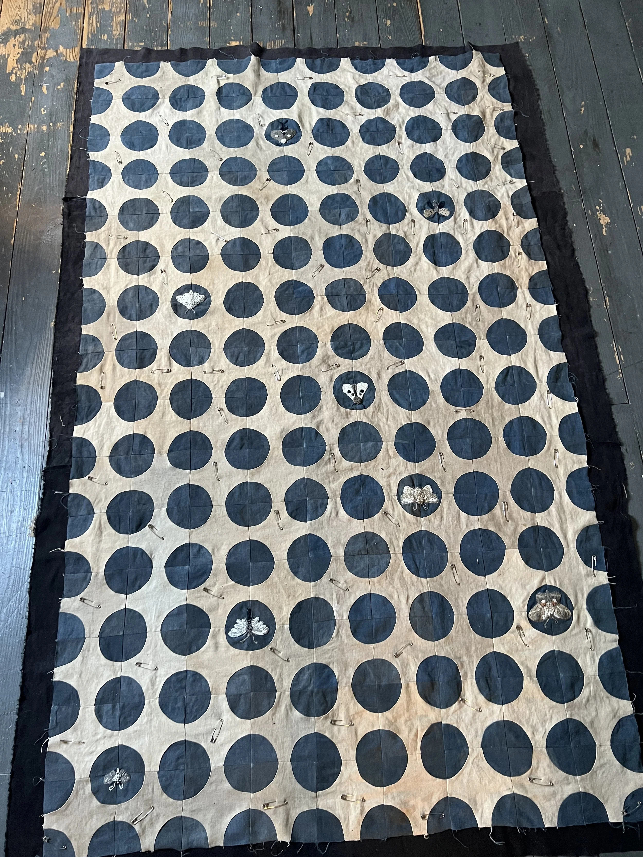 I decided to include the embroidered moths to reference the moth in the wallpaper. I named this the Moth Eaten quilt after someone noticed that it looked like the circles were holes that the moths were eating through the quilt. As soon as I read this it was so obvious. How can you include moths on a textile and not evoke their corrosive effect on textiles?