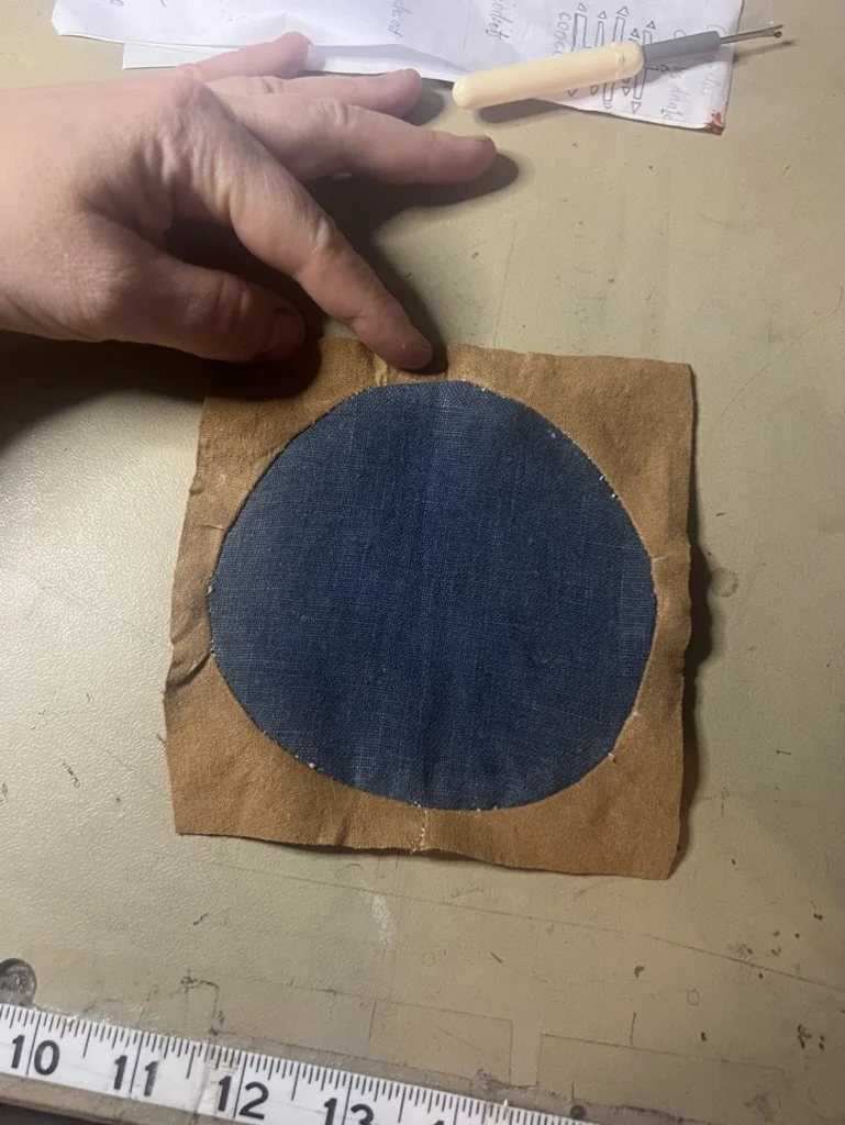 Linen, naturally dyed. The blue is with Indigo a cutch aftermath. The tan Hand quilted with thick ivory sashiko thread. Cotton batting and cutch made from a light tannin. The crewel embroidery is made with 100% wool crewel yarns.