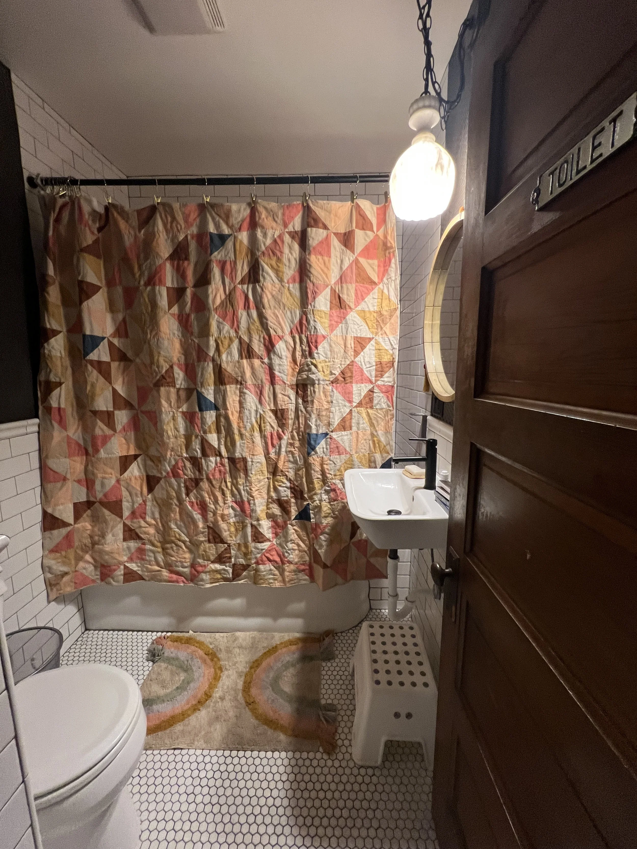 I am asked frequently if this quilt will hold up in the bathroom. I didn’t add a layer of batting so it is light. We have had this installed for several months and it rarely gets wet. We use the shower daily.