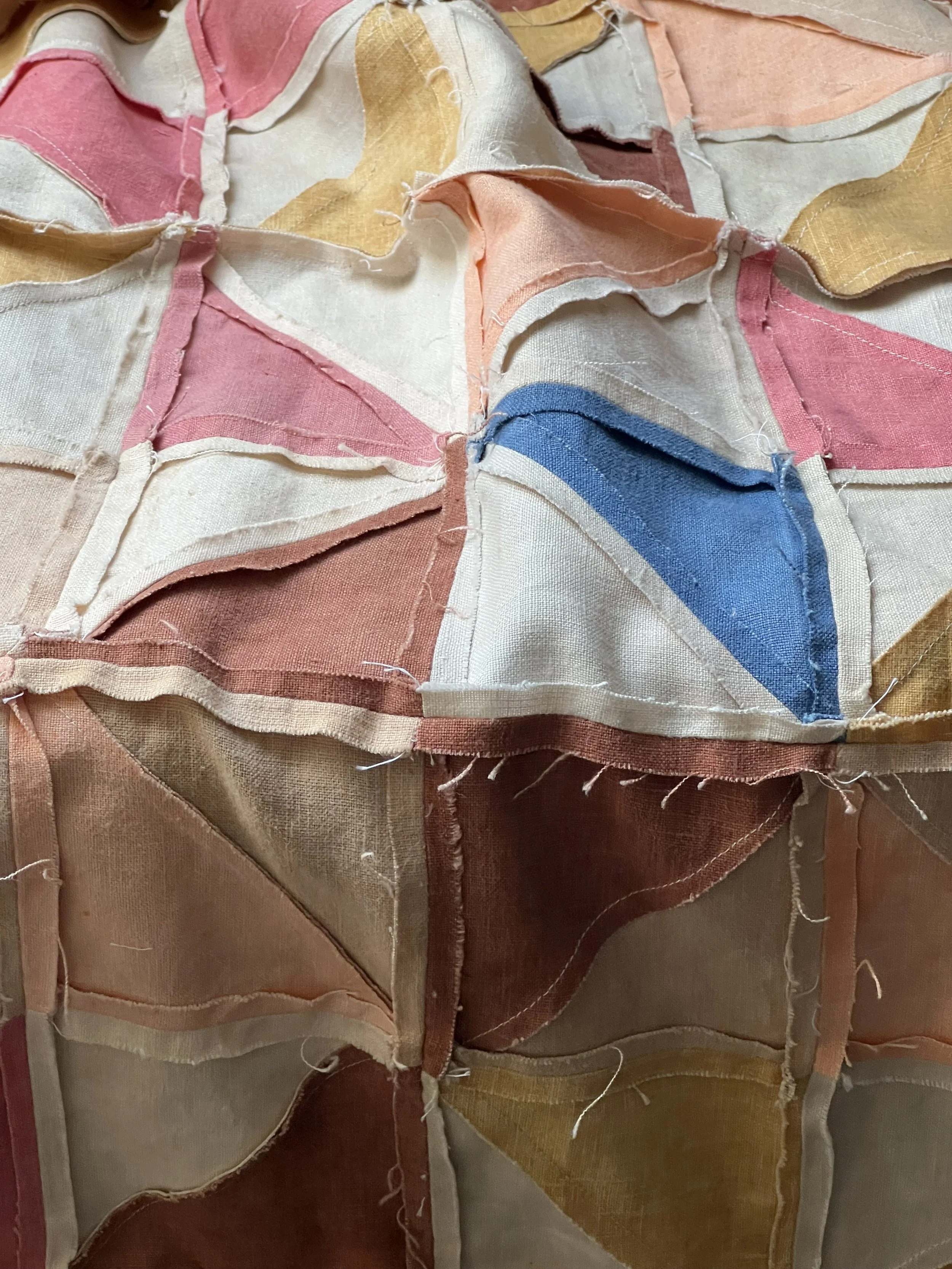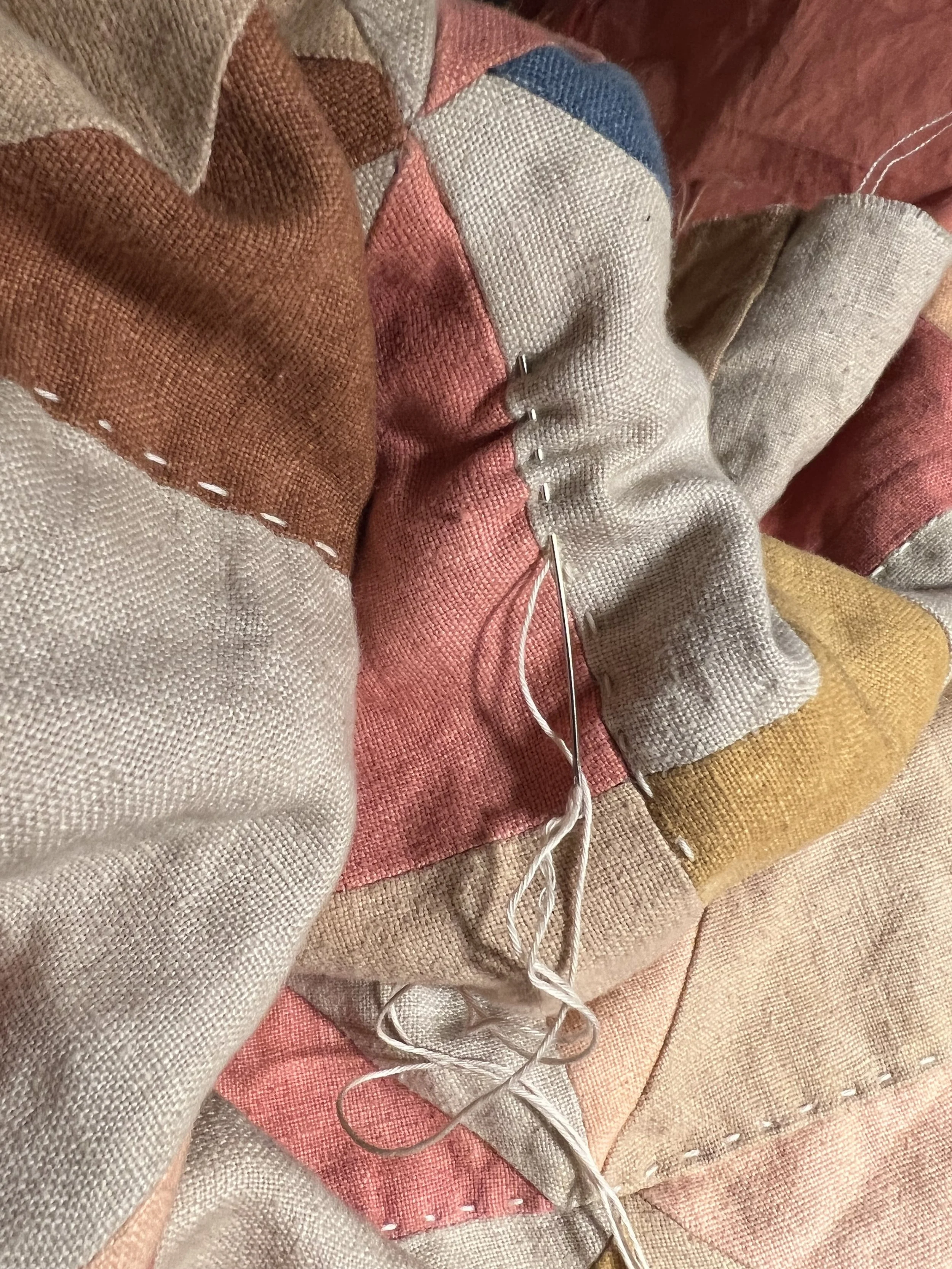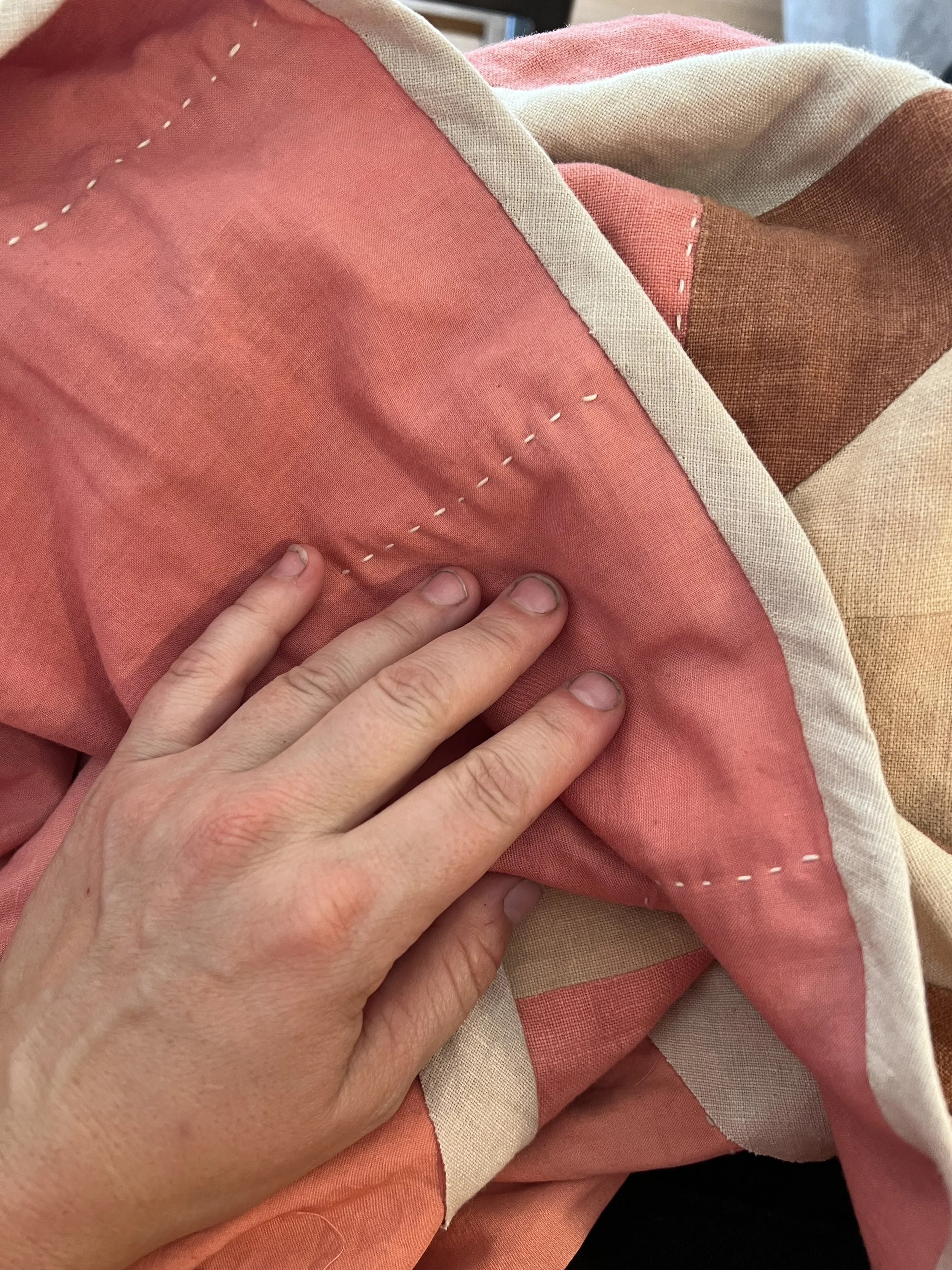 This quilt was pieced with a machine and hand quilted. The linen and cotton was hand dyed by the artist. This was hand quilted with thick Sashiko style thread. The binding is machine stitched on the front and hand tacked on the back to hide the stitches with mitered corners. The back is naturally dyed cotton constructed out of fabric remnants.