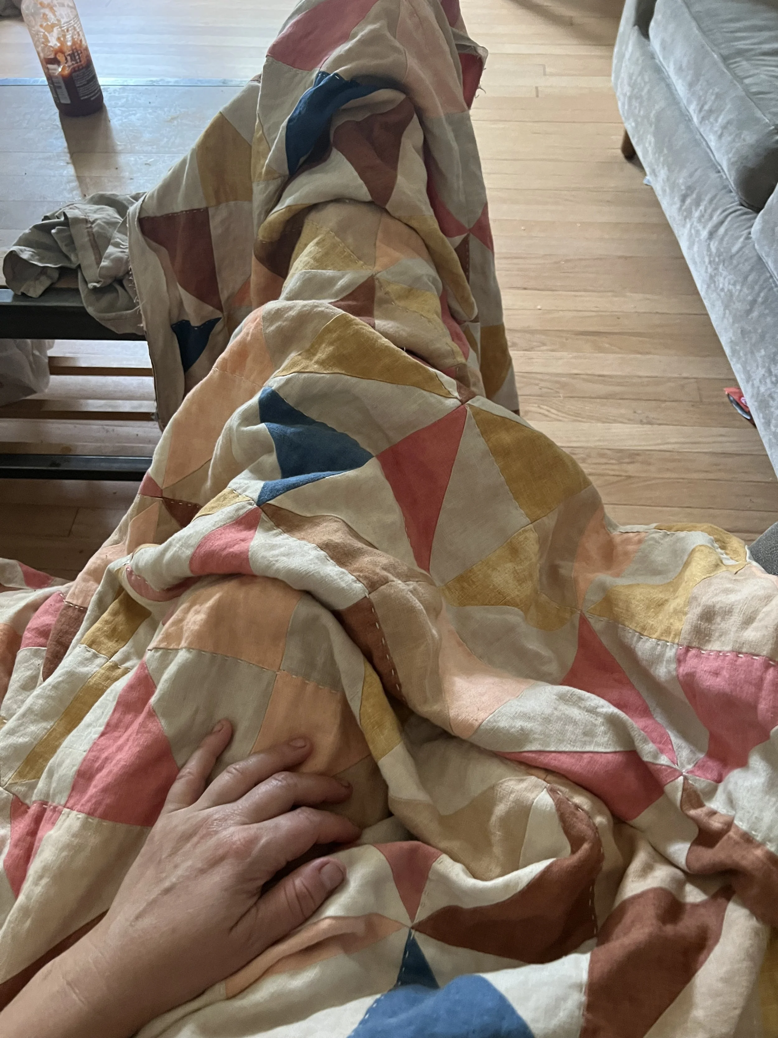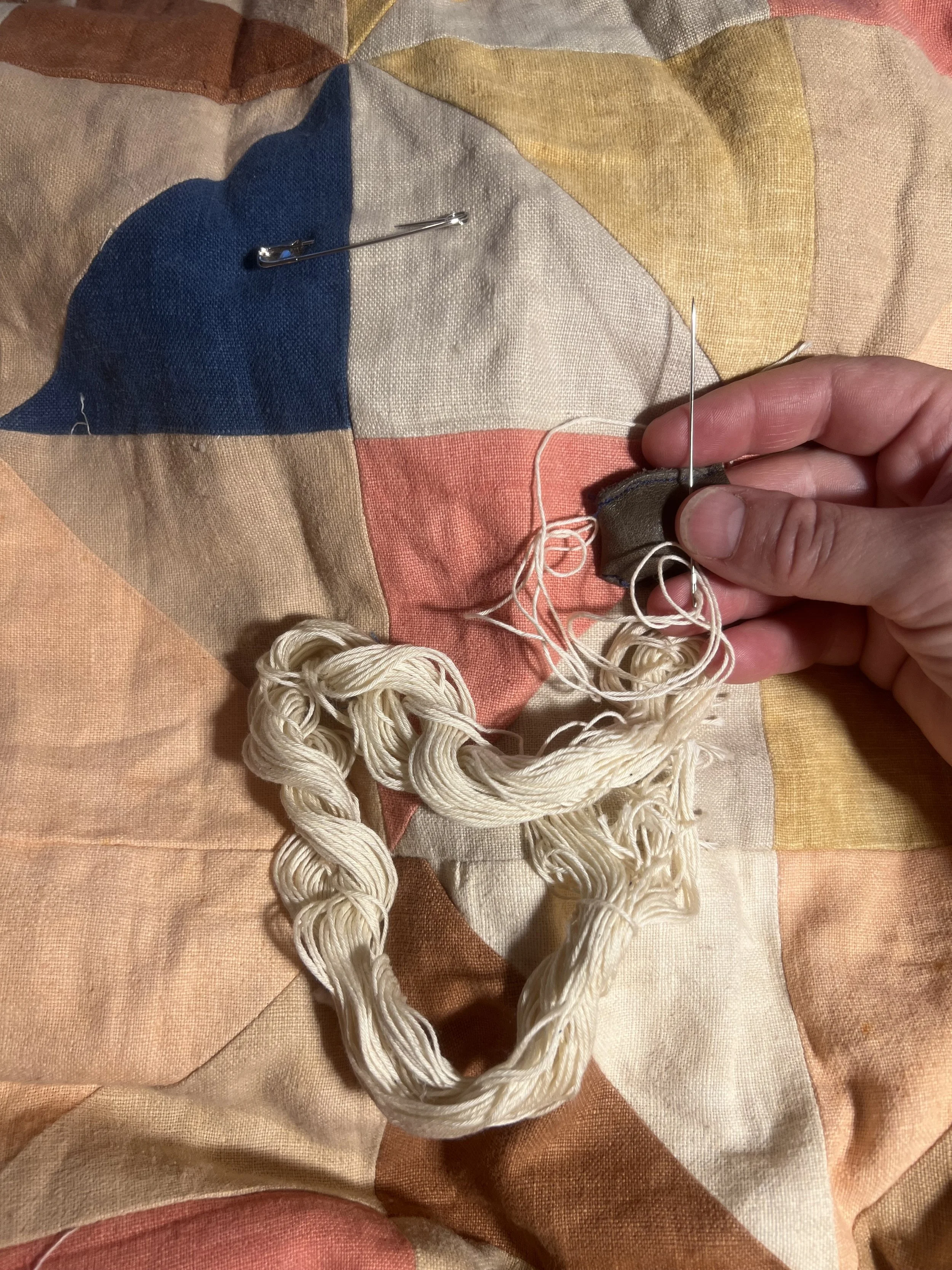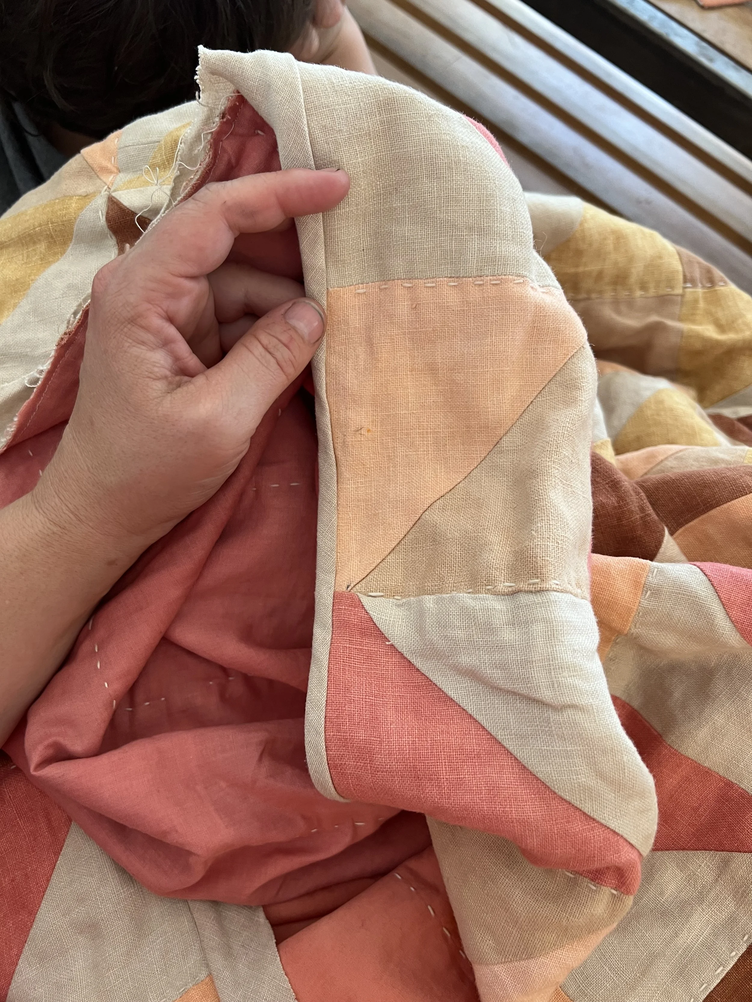 This quilt was pieced with a machine and hand quilted. The linen and cotton was hand dyed by the artist. This was hand quilted with thick Sashiko style thread. The binding is machine stitched on the front and hand tacked on the back to hide the stitches with mitered corners. The back is naturally dyed cotton constructed out of fabric remnants.