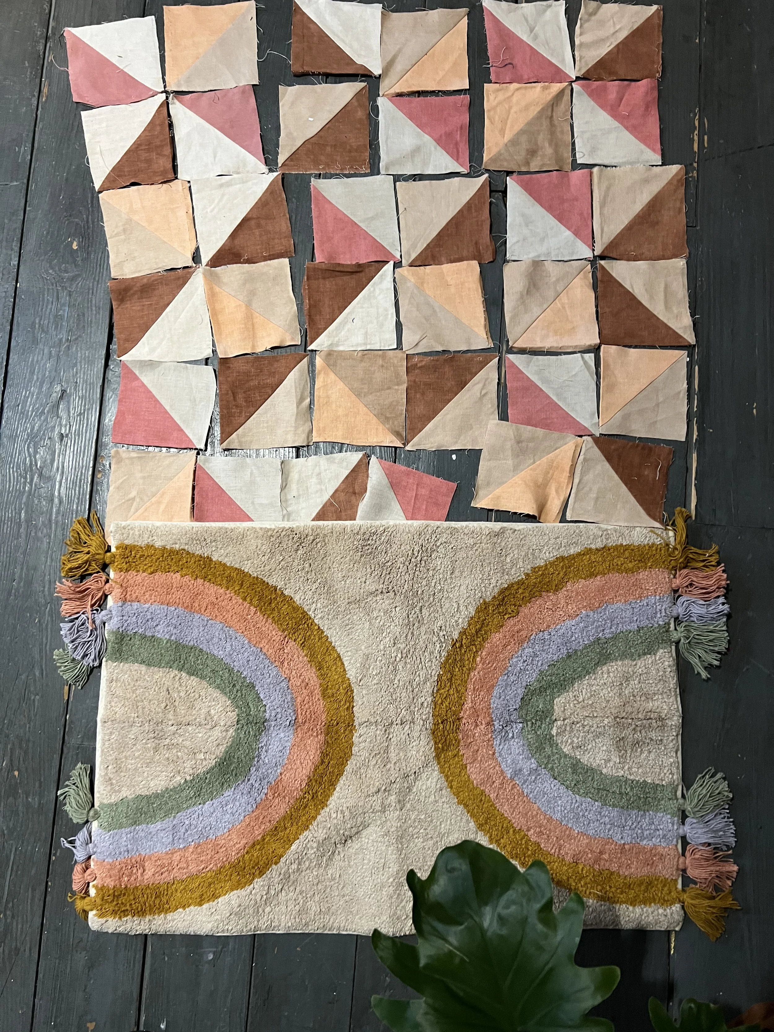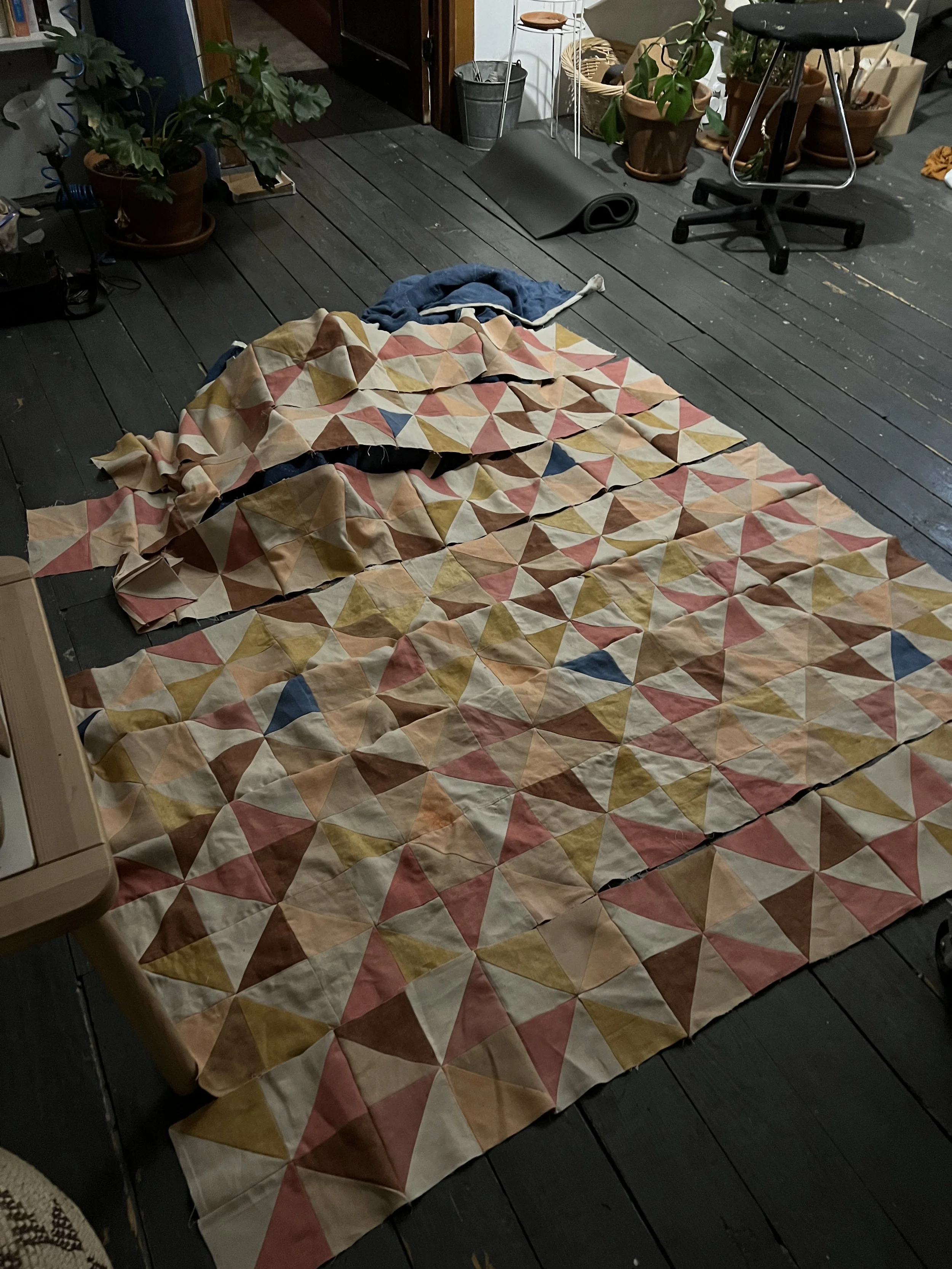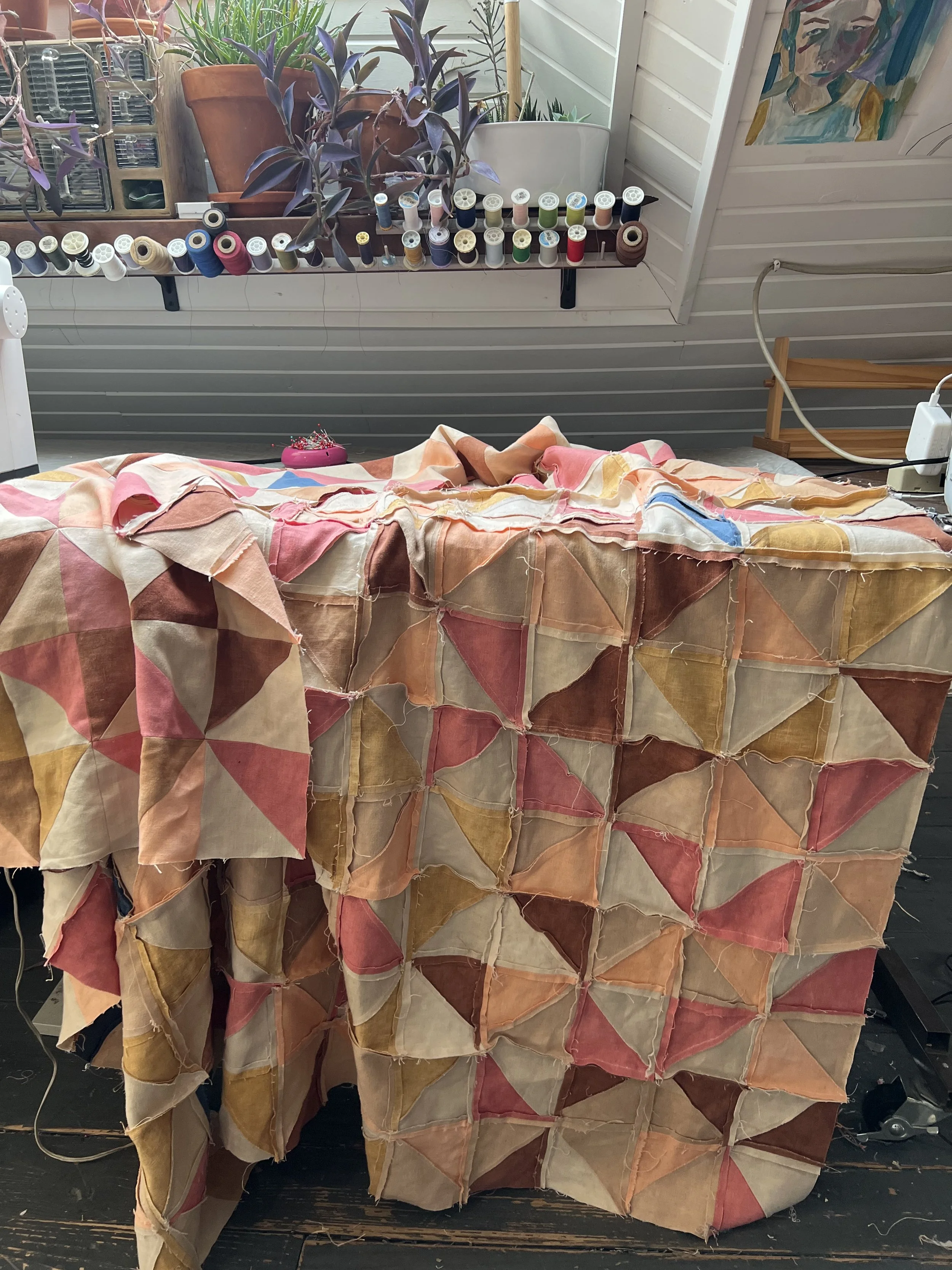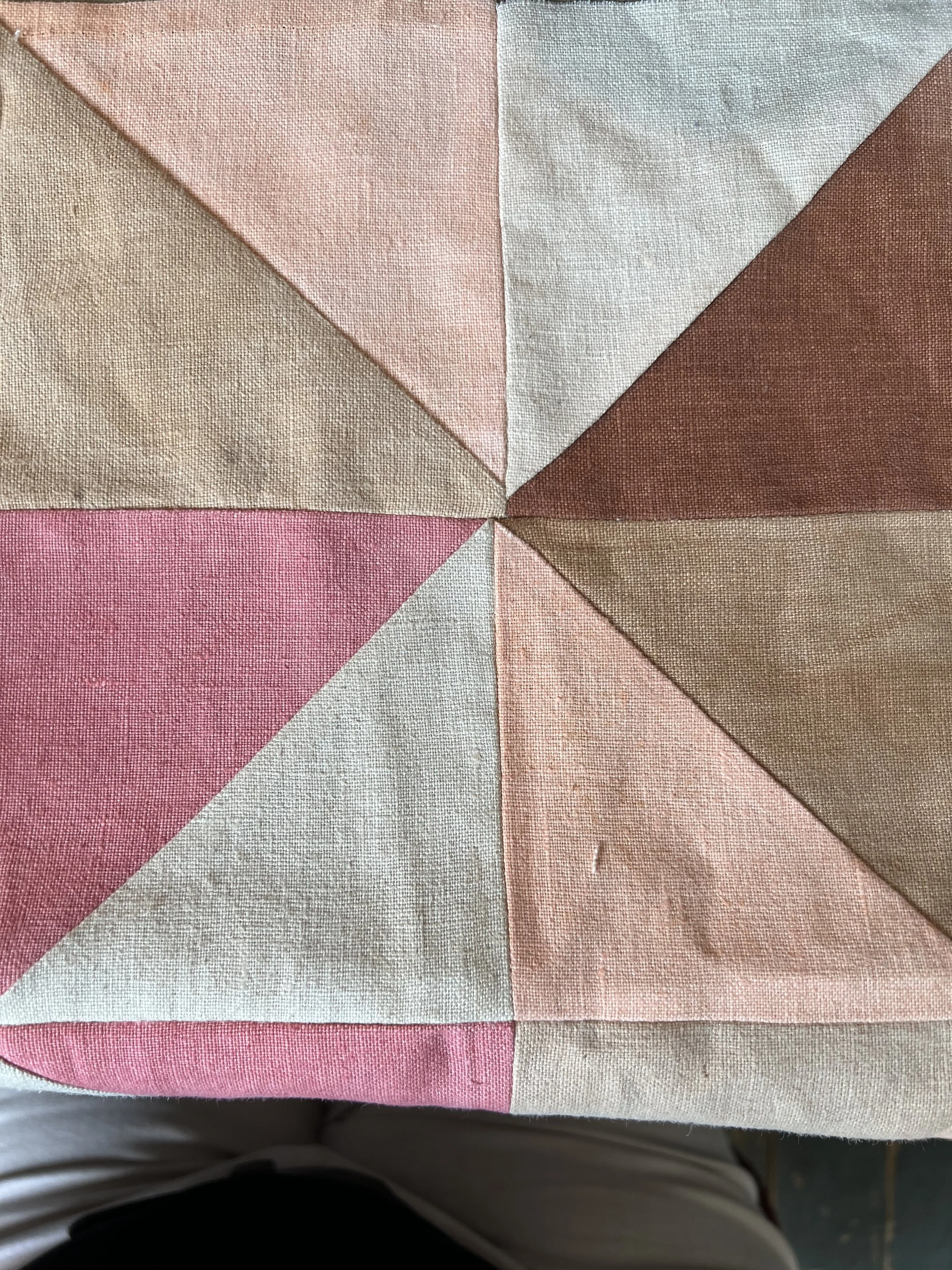 The Pinwheel Quilt is constructed of blocks made of 4HST. Back is sewn from cotton fabric remnants dyed with madder. Stitched with thick ivory Sashiko style thread by hand vertically throughout.