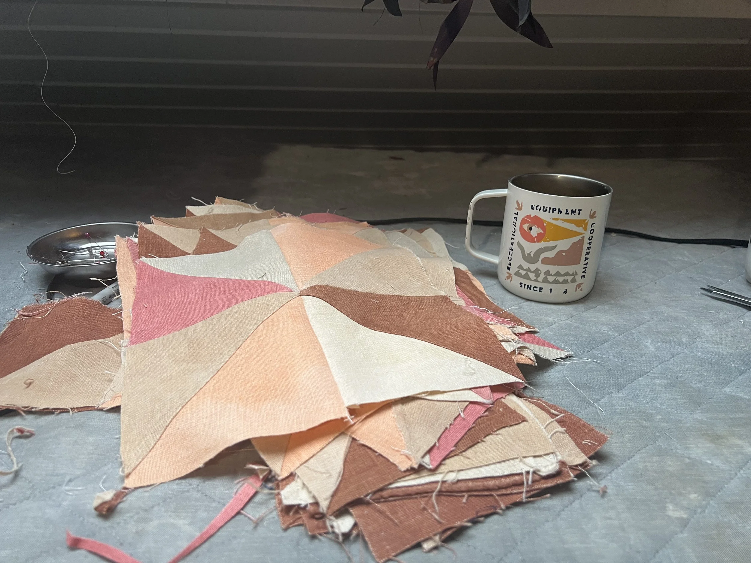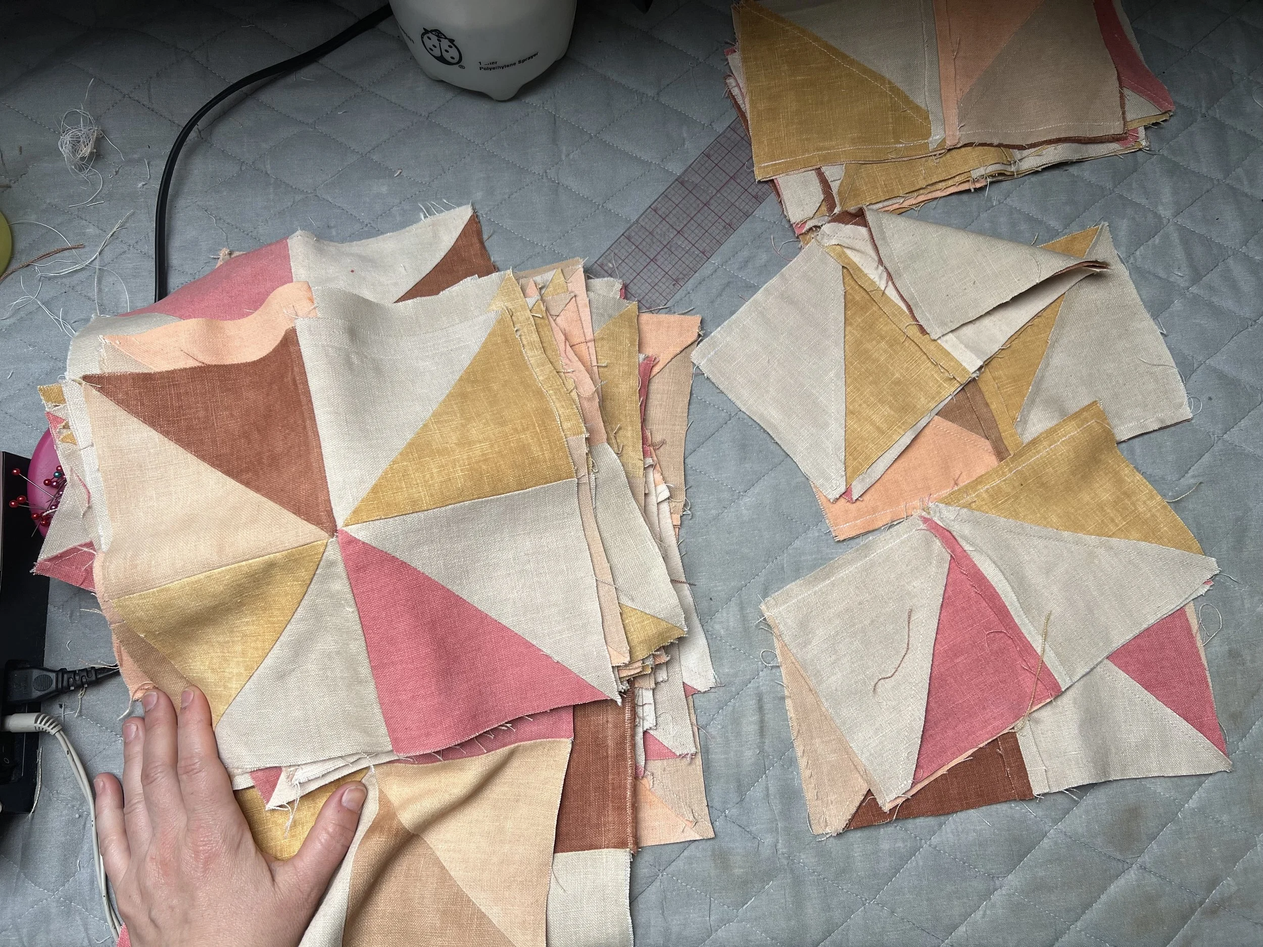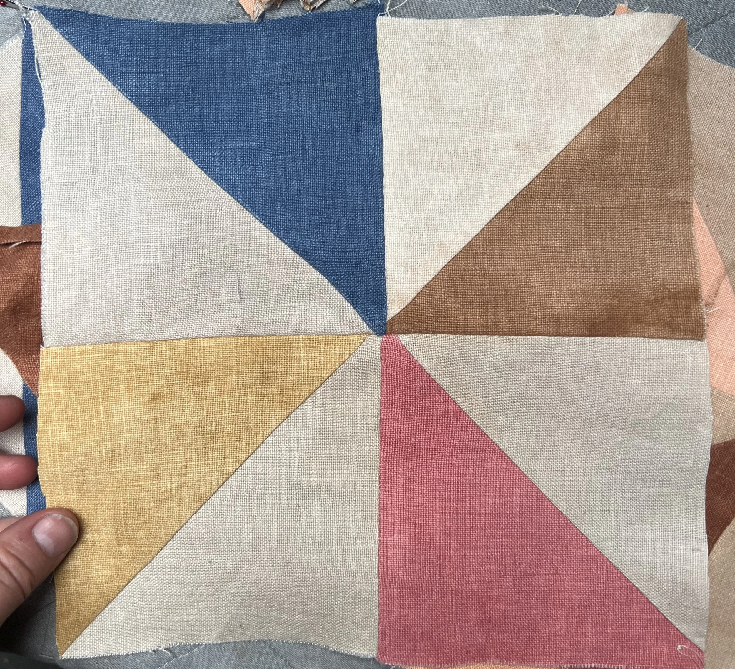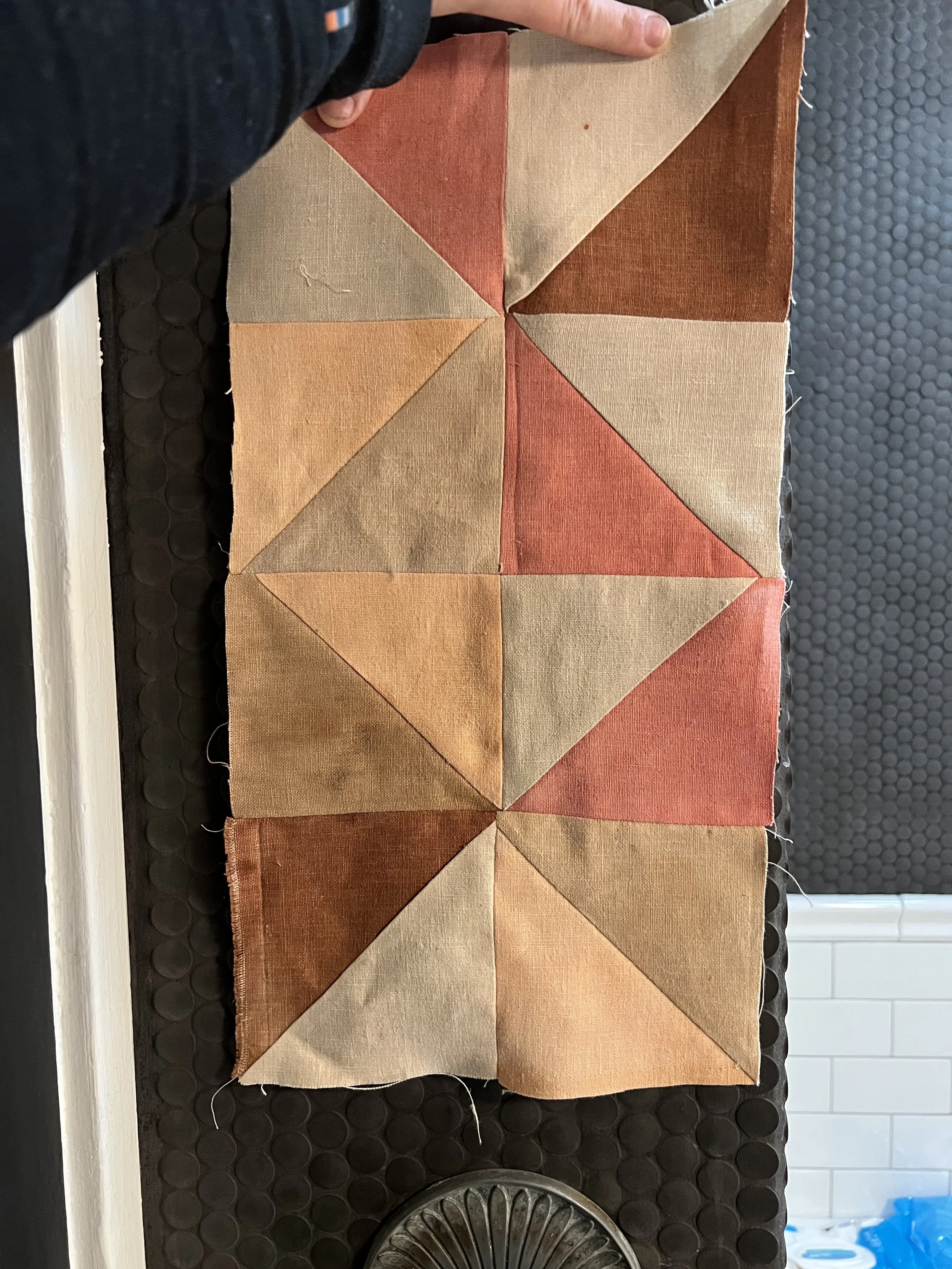 The Pinwheel Quilt is constructed of blocks made of 4HST. Back is sewn from cotton fabric remnants dyed with madder. Stitched with thick ivory Sashiko style thread by hand vertically throughout.