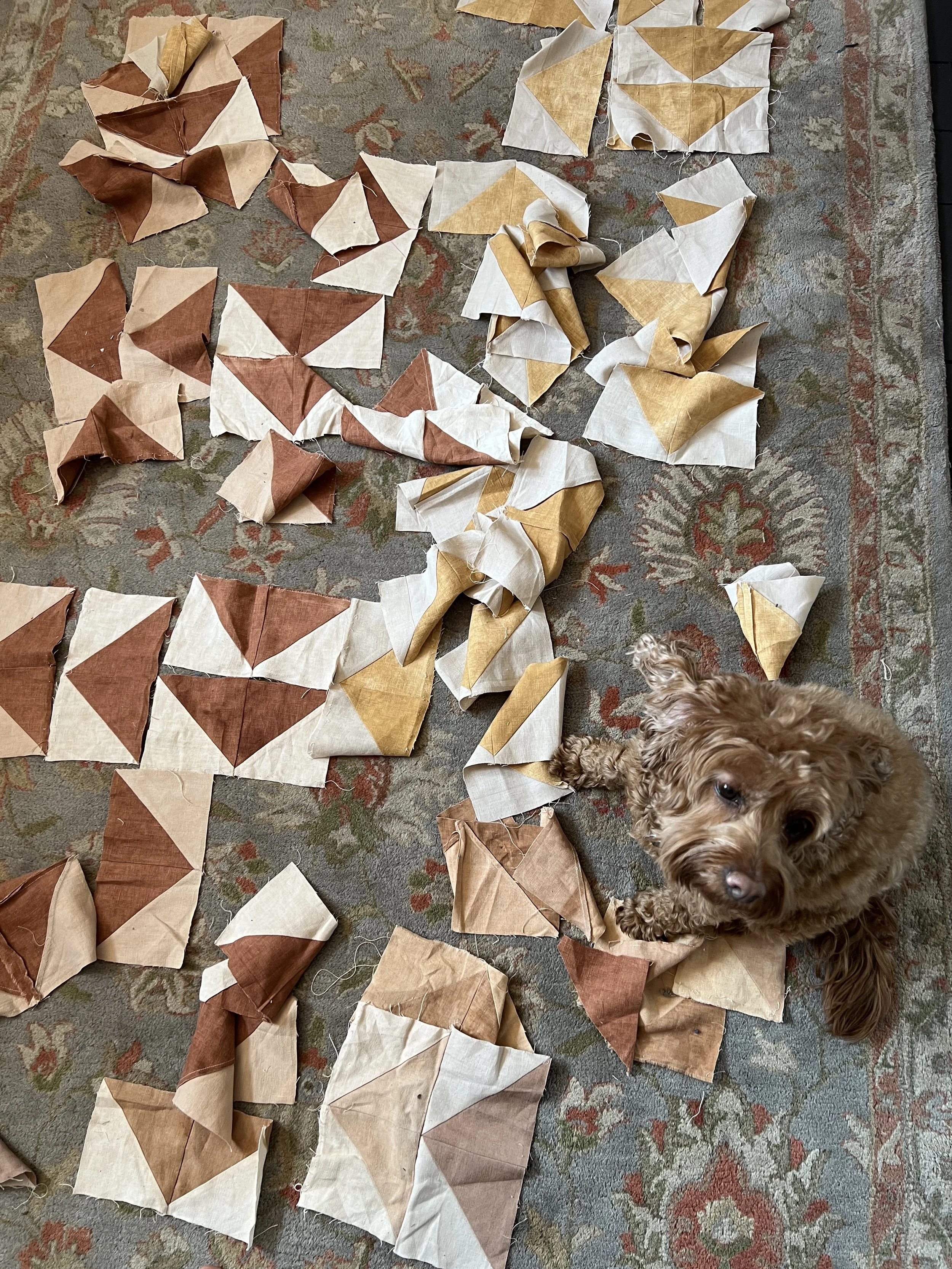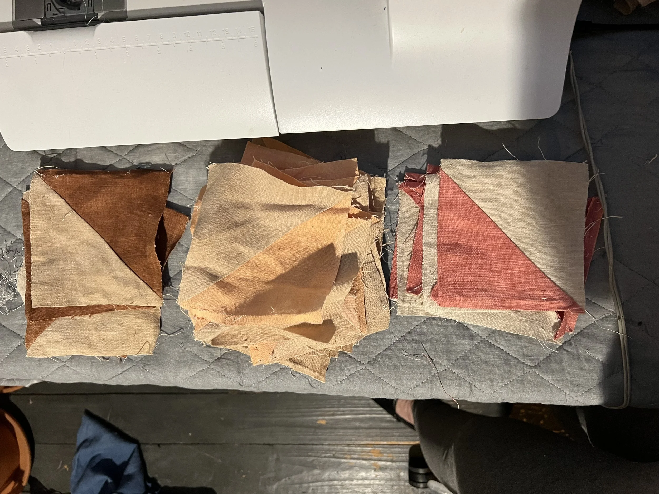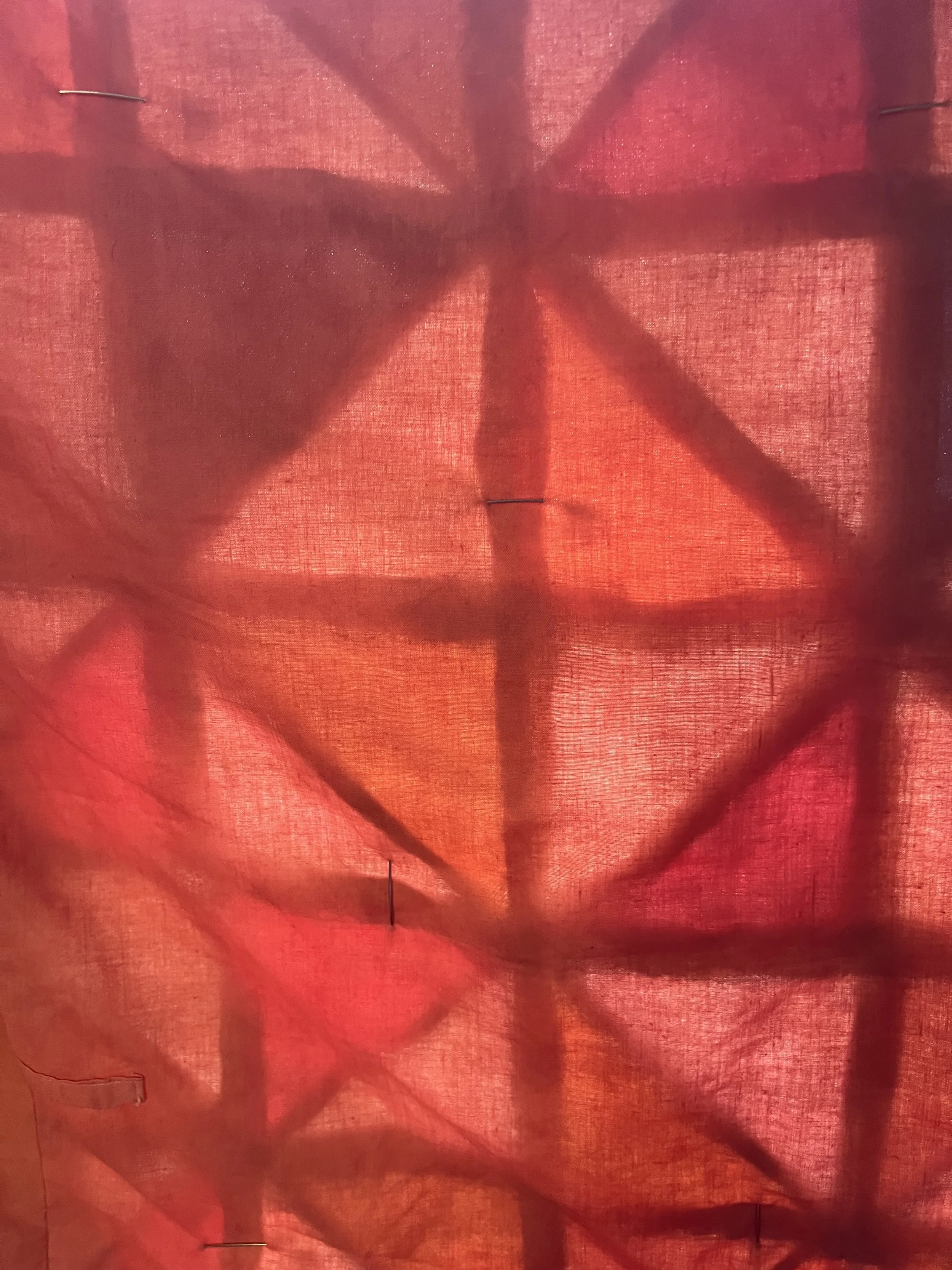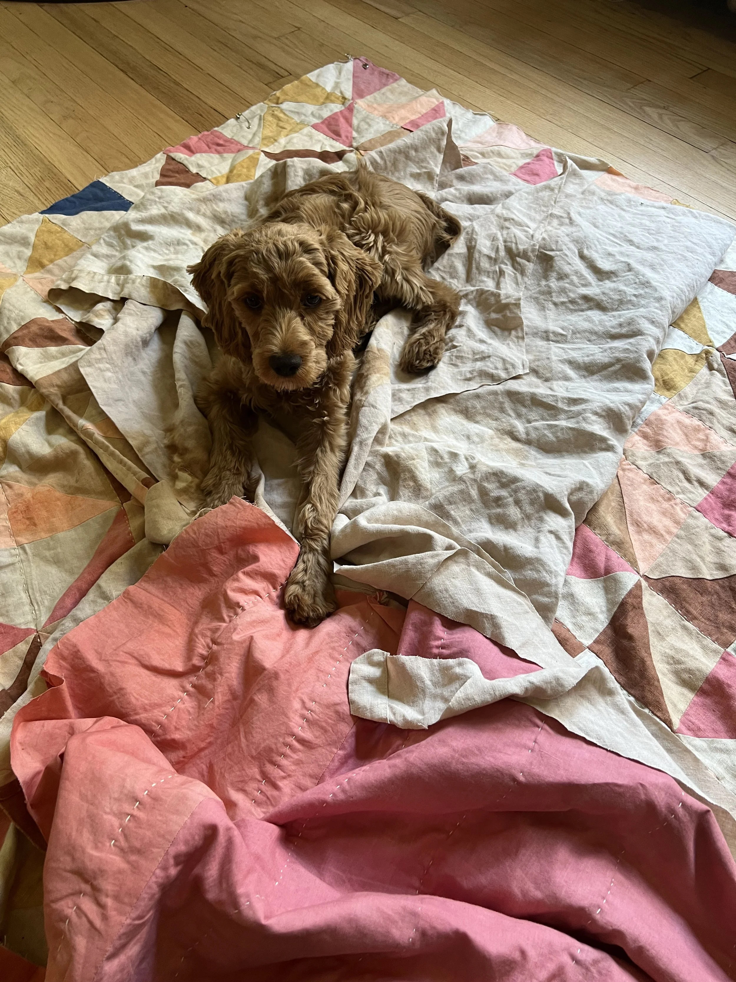 The Pinwheel Quilt is constructed of blocks made of 4HST. Back is sewn from cotton fabric remnants dyed with madder. Stitched with thick ivory Sashiko style thread by hand vertically throughout.