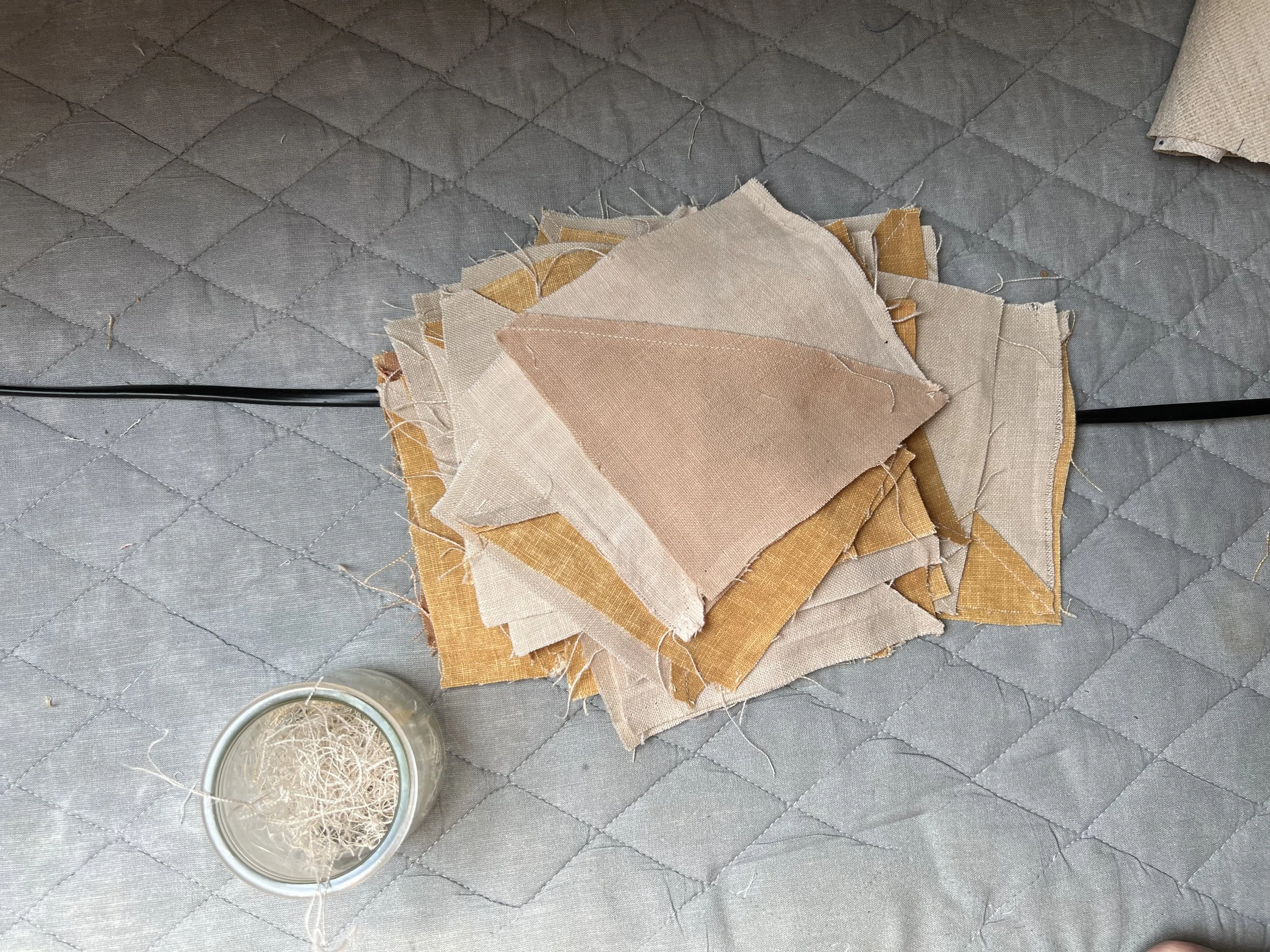 100% Linen front, naturally dyed with Osage Orange, Black Tea, Acorns, Cutch, Madder, and Indigo. The binding is also linen. The back is cotton dyed with Madder. Hand quilted with thick ivory sashiko thread. Cotton batting.