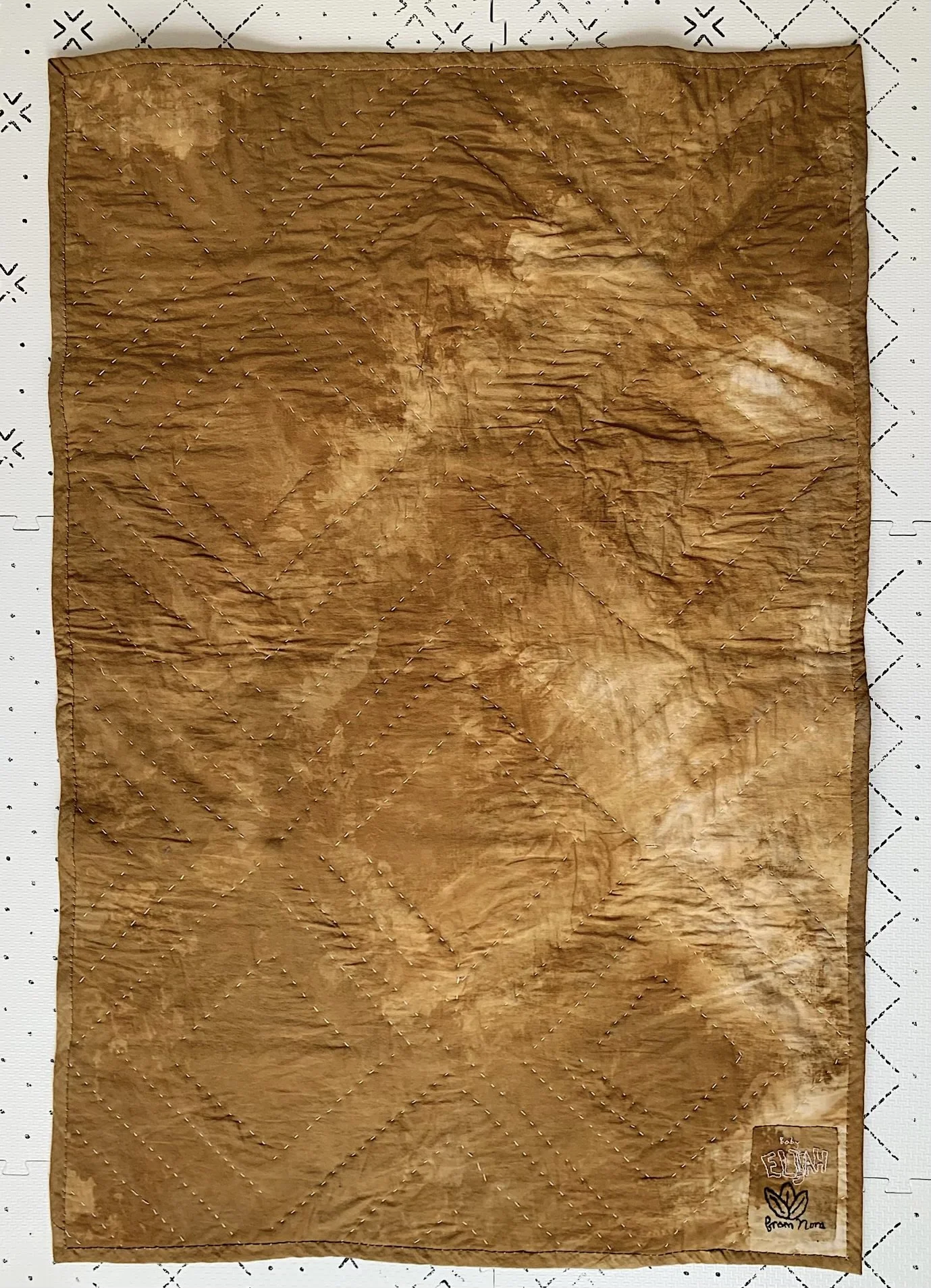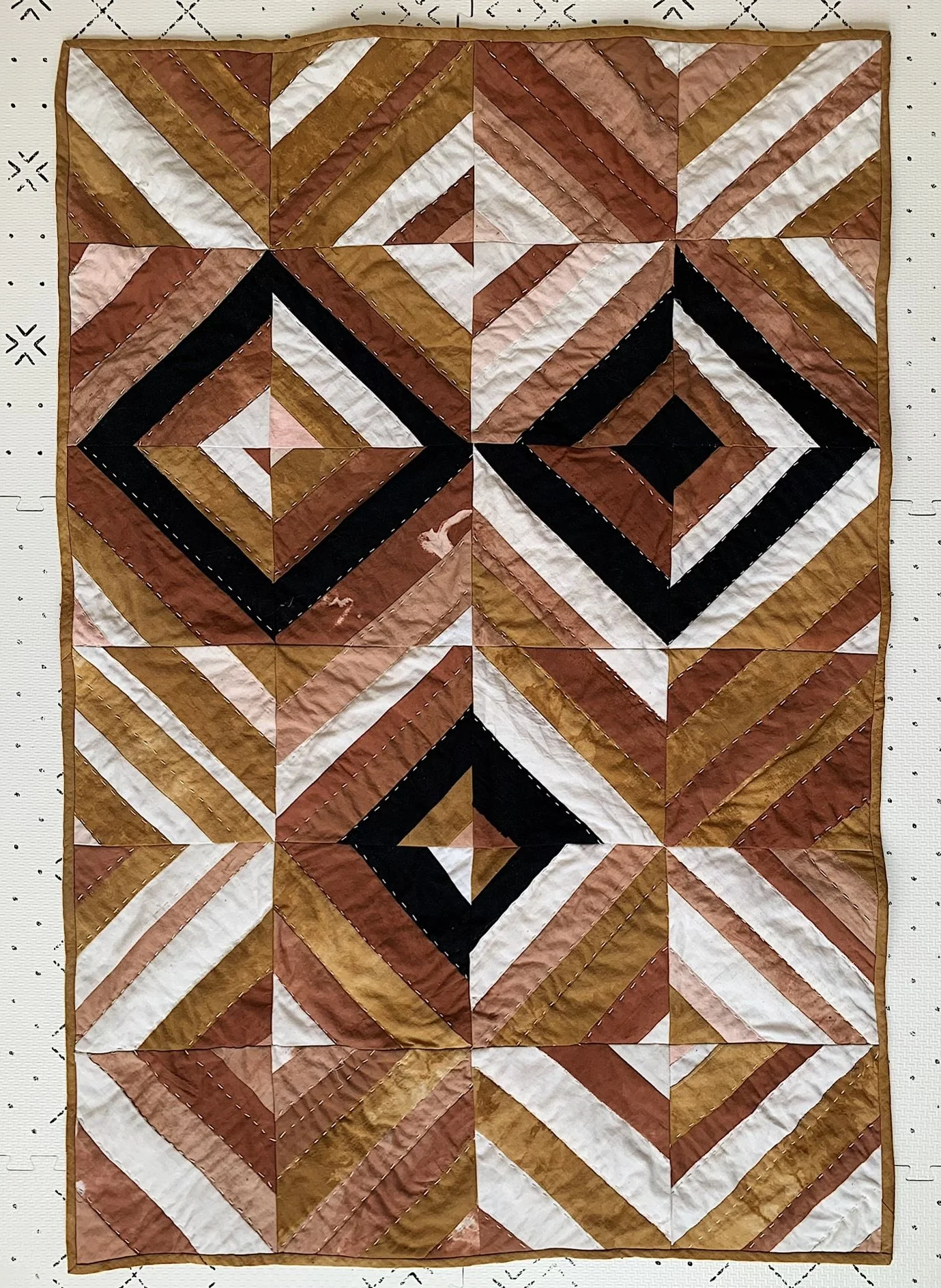 100% Linen, naturally dyed with Osage Orange, Black Tea, Acorns, Cutch, and Madder. The binding and back are also linen. Hand quilted with thick ivory sashiko thread. Cotton batting.